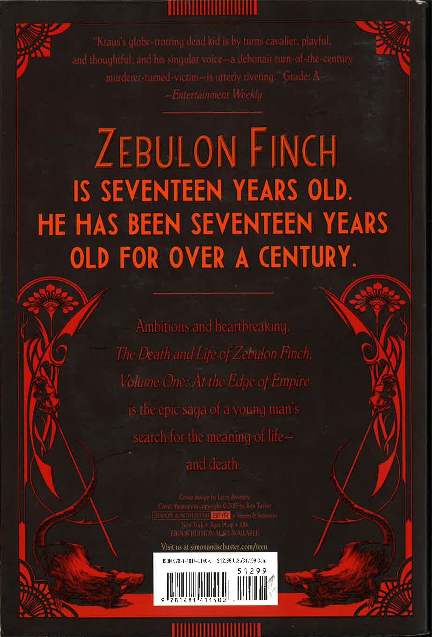 A murdered teen is resurrected to walk the earth for more than a century in the sweeping epic Entertainment Weekly named one of the best books of 2015. May 7, 1896. Dusk. A swaggering seventeen-year-old gangster named Zebulon Finch is gunned down by the shores of Lake Michigan. But after mere minutes in the void, he is mysteriously resurrected. His second life will be nothing like his first. Zebulons new existence begins as a sideshow attraction in a traveling medicine show. From there he will be poked and prodded by a scientist obsessed with mastering the secrets of death. He will fight in the trenches of World War I. He will run from his nightmaresand from povertyin Depression-era New York City. And he will become the companion of the most beautiful woman in Hollywood. Love, hate, hope, and horrorZebulon finds them. But will he ever find redemption? Ambitious and heartbreaking, The Death and Life of Zebulon Finch, Volume One: At the Edge of Empire is the epic saga of what it means to be human in a world so often lacking in humanity.
