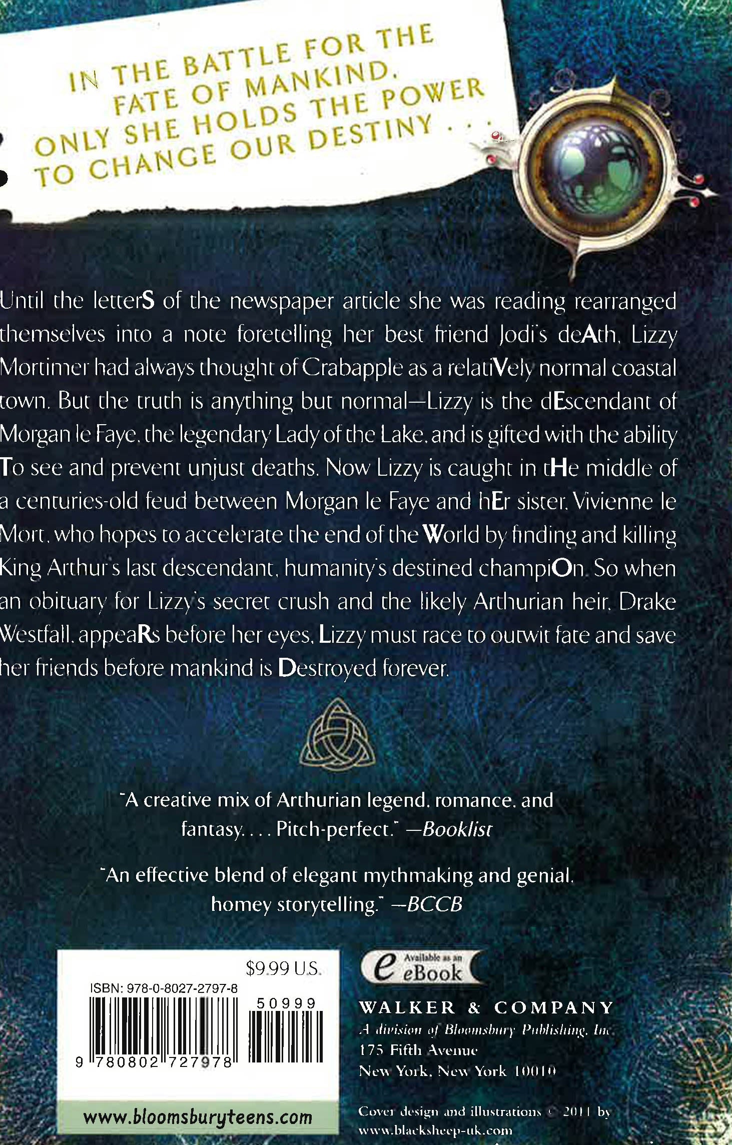 Until the letters of the newspaper article she was reading rearranged themselves into an article foretelling her best friend Jodi's death, Lizzy Mortimer had always thought of Crabapple as a relatiVely normal coastal town. But the truth is anything but normal-Lizzy is the descendant of Morgan Le Fay, the legendary Lady of the Lake, and is gifted with the ability to see and prevent unjust deaths. Now Lizzy is caught in the middle of centuries-old feud between Morgan le Fay and her sister, Vivienne le Mort, who hopes to accelerate the end of the world by finding and killing King Arthur's last descendant, humanity's destined champion. So when an obituary for Lizzie's secret crush and the likely Arthurian heir, Drake Westfall, appears before her eyes, Lizzy must race to outwit fate and save her friends before mankind is destroyed forever.