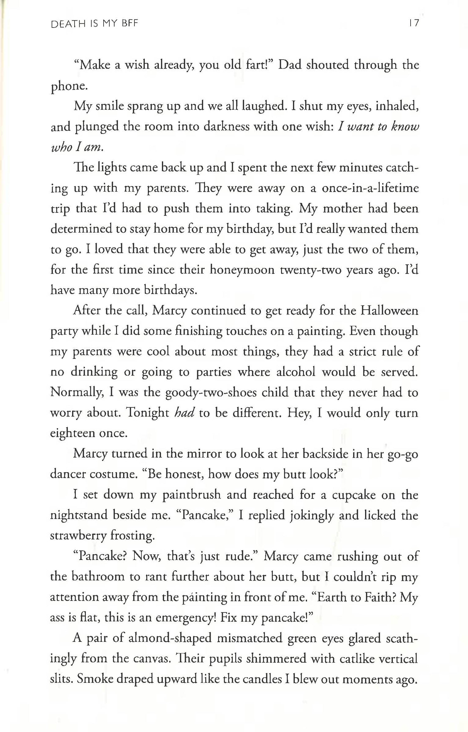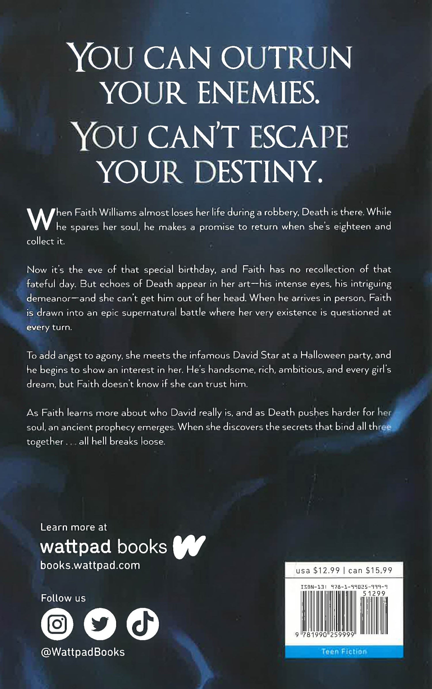 Now it’s the eve of that special birthday, and Faith has no recollection of that fateful day. But echoes of Death appear in her art―his intense eyes, his intriguing demeanor―and she can’t get him out of her head. When he arrives in person, Faith is drawn into an epic supernatural battle where her very existence is questioned at every turn.