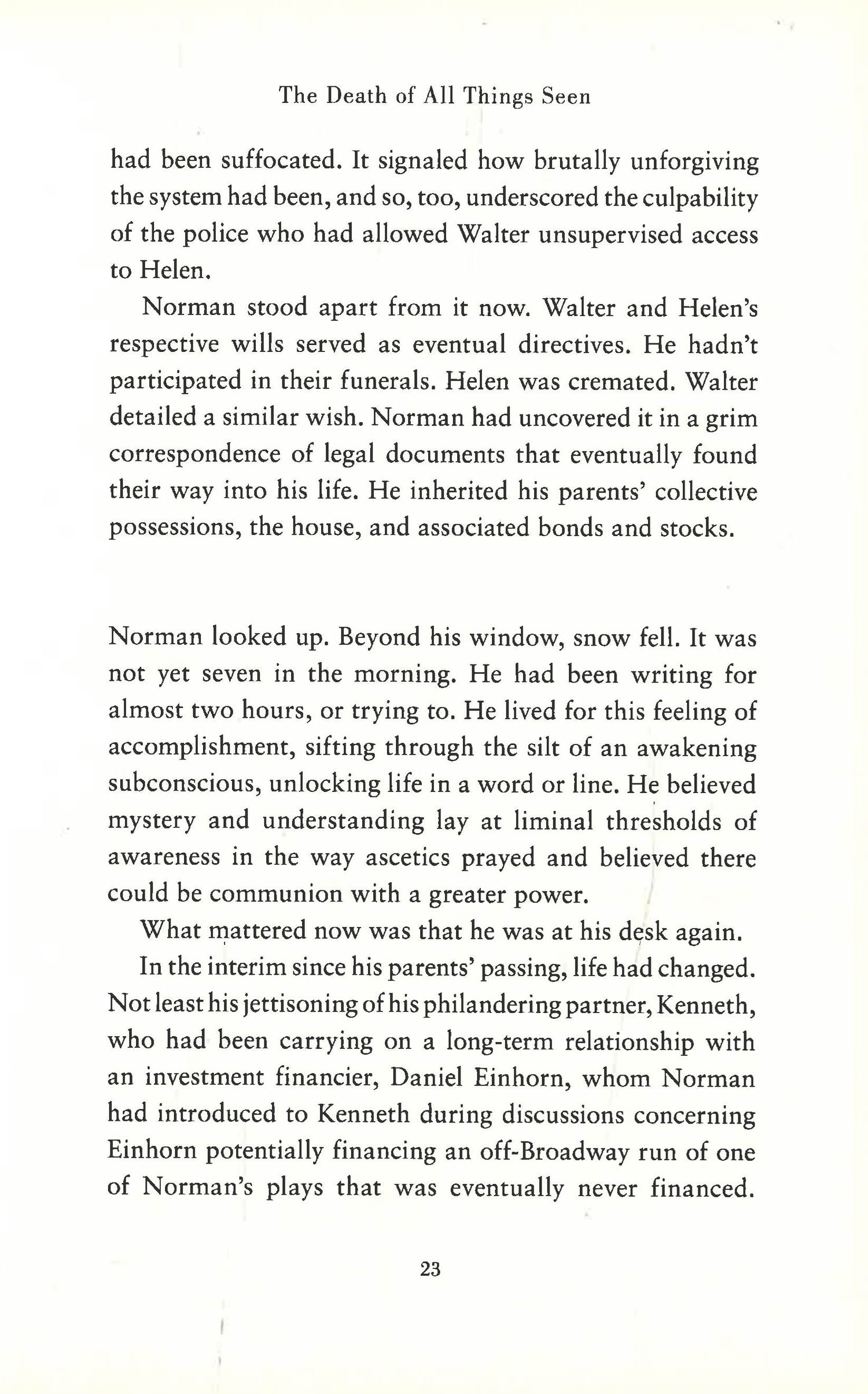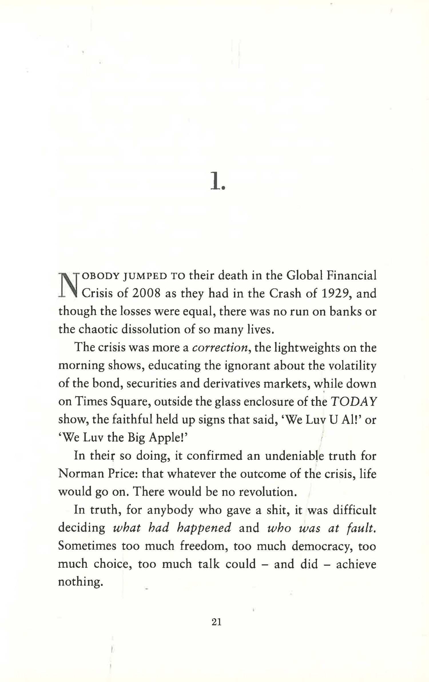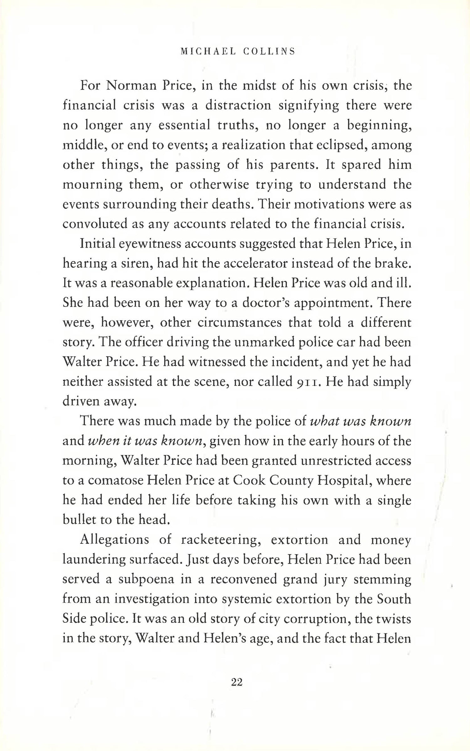 There was a new beginning. He felt it everywhere, in the sweep of change, in the simple pronouncement of 'Yes we can!''It's 2008 and Norman Price - a moderately successful forty-something playwright living in Chicago - considers the shuddering impact of the financial crash. What's needed, he thinks, is the will for a new existence. When his parents die, one shortly after the other, The New Existence becomes Norman's mantra as he tries to recalibrate his own shaken world. Into Norman's tentative re-building, a couple of bombshells are dropped. His parents' old house has to go on the market, forcing him to revisit the past. And then he receives a mysterious email from a man he has never met but whose name is instantly, painfully, familiar. Norman's new existence is suddenly threatened by past secrets. Michael Collins takes post 9/11 America as the background for a deeply moving novel about complex identities and the fragility of humanity.