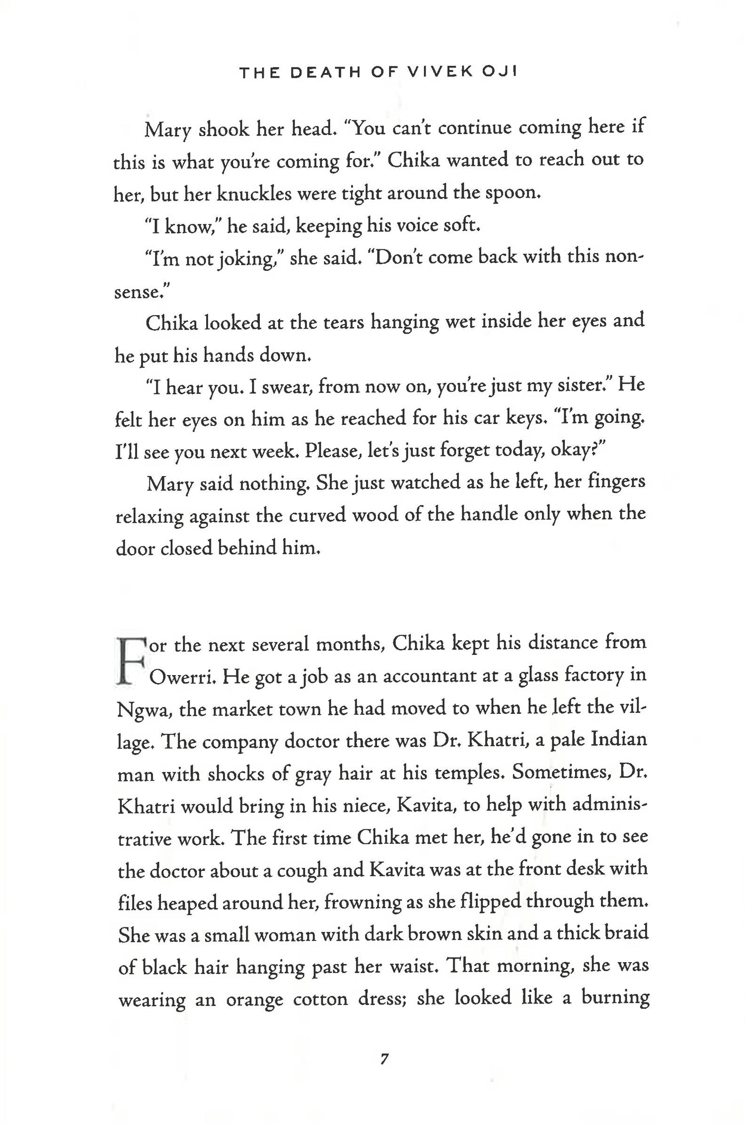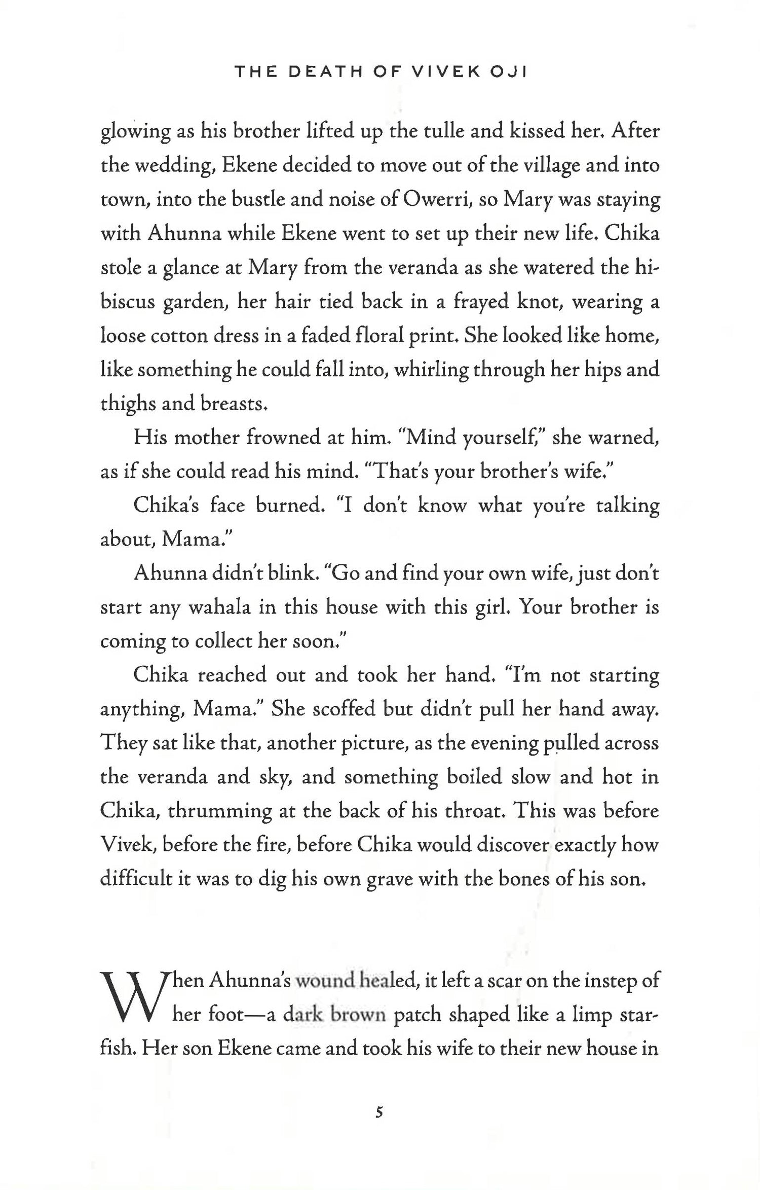 One afternoon, in a town in southeastern Nigeria, a mother opens her front door to discover her son’s body, wrapped in colorful fabric, at her feet. What follows is the tumultuous, heart-wrenching story of one family’s struggle to understand a child whose spirit is both gentle and mysterious. Raised by a distant father and an understanding but overprotective mother, Vivek suffers disorienting blackouts, moments of disconnection between self and surroundings. As adolescence gives way to adulthood, Vivek finds solace in friendships with the warm, boisterous daughters of the Nigerwives, foreign-born women married to Nigerian men. But Vivek’s closest bond is with Osita, the worldly, high-spirited cousin whose teasing confidence masks a guarded private life. As their relationship deepens—and Osita struggles to understand Vivek’s escalating crisis—the mystery gives way to a heart-stopping act of violence in a moment of exhilarating freedom.