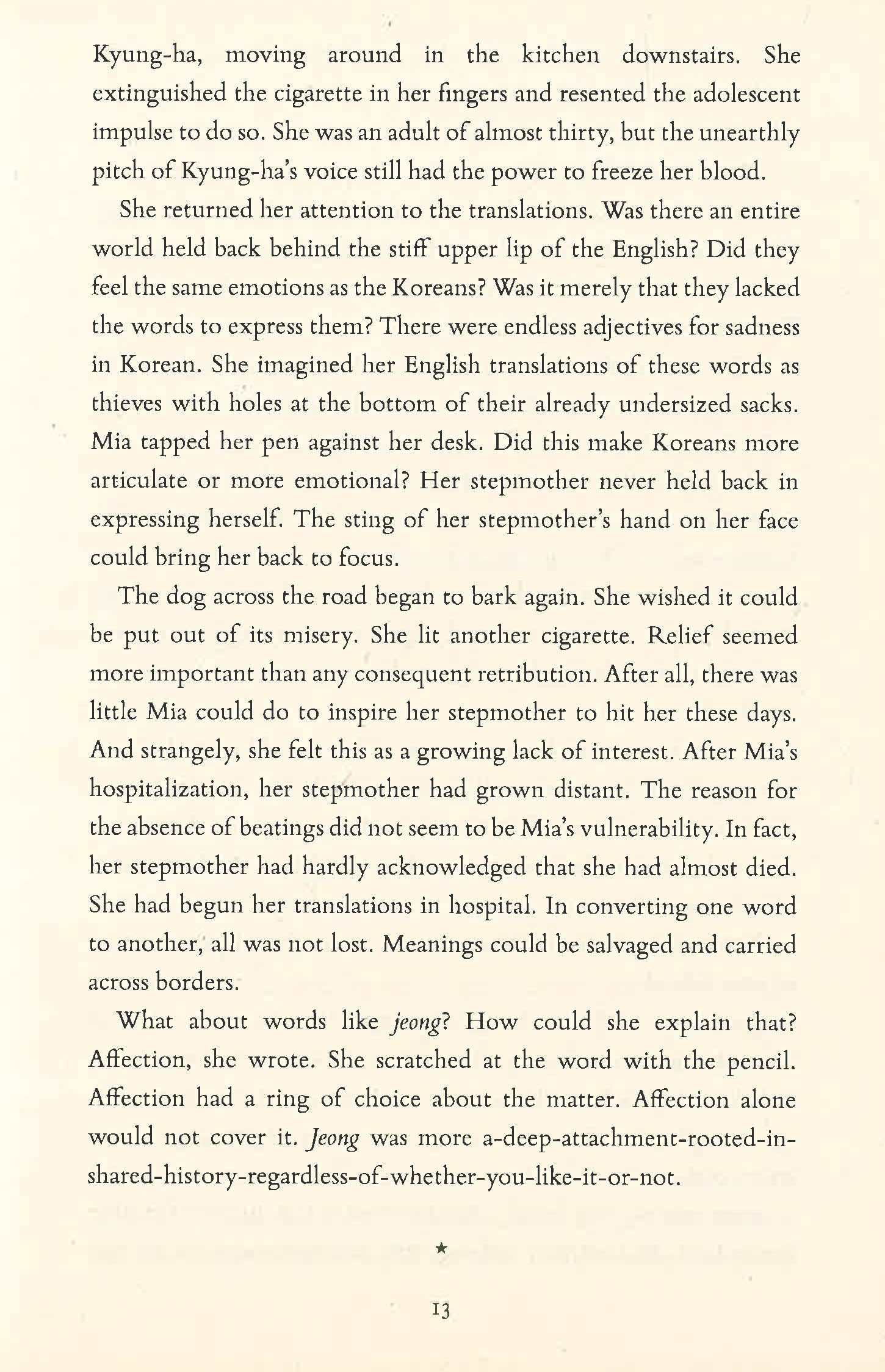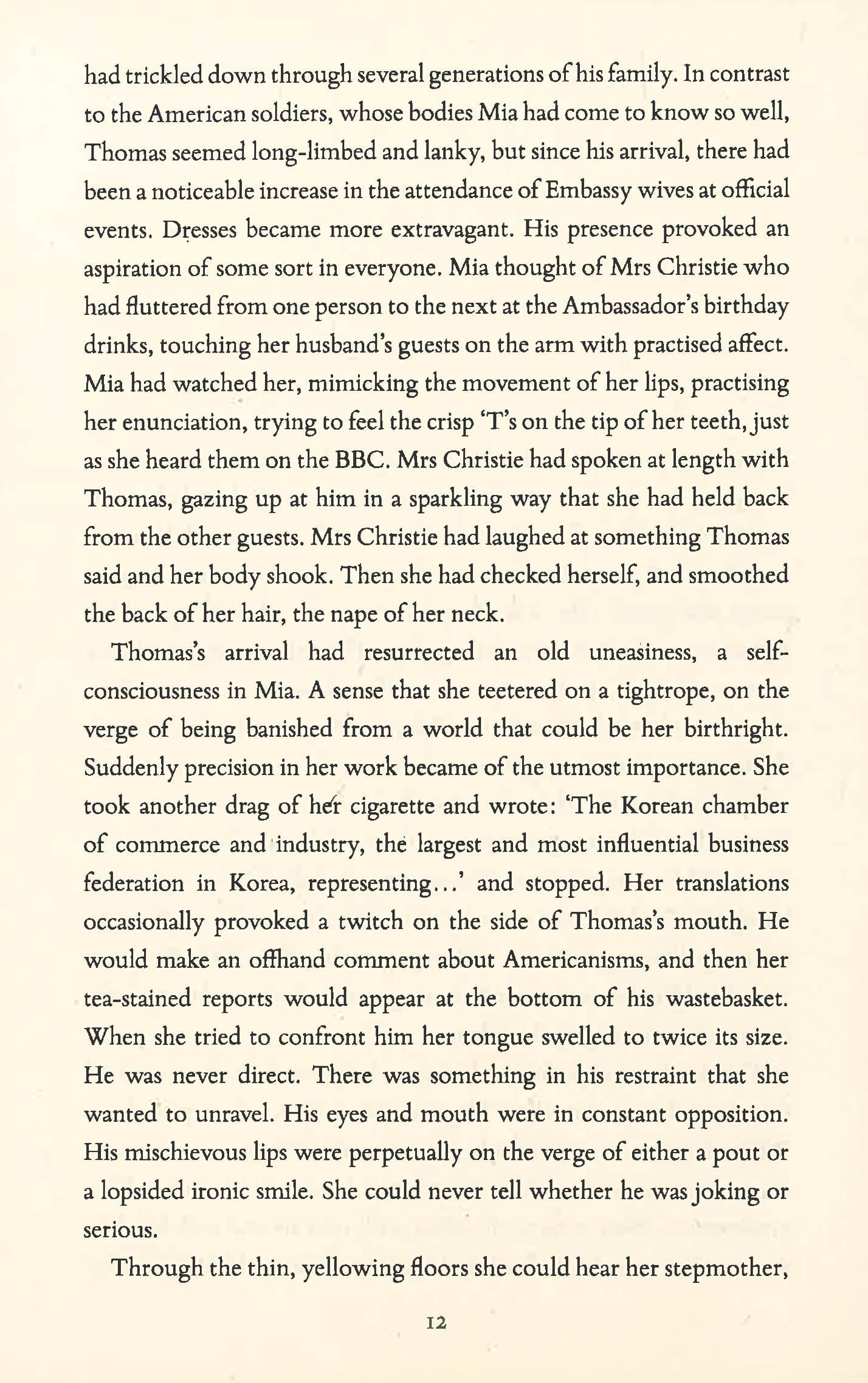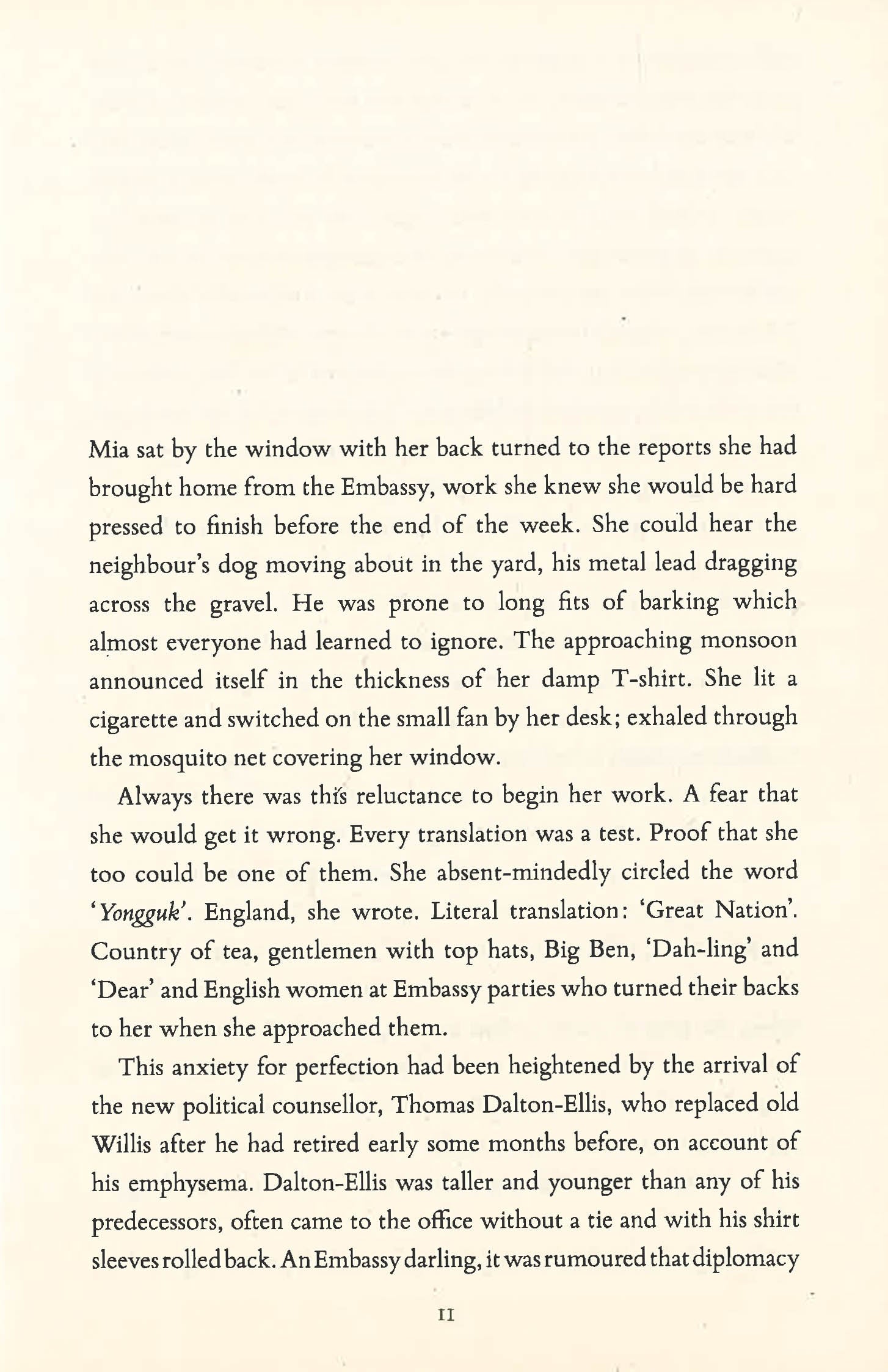 Seoul, South Korea. Mia is an outsider. The child of an English mother, she defies the rigid expectations of her Korean stepmother to work as a translator at the British Embassy. Her uncle runs a charitable - and controversial - school for North Korean defectors, and prevails upon Mia's stepmother to shelter a traumatised young student. Mia is too preoccupied to note the defector's strange behaviour - or its implications. She has become infatuated with Thomas, a diplomat with a self-destructive streak. When an outrageous indiscretion endangers his position, it is Mia who saves him from humiliation and rescues his career. And the boundaries between them are crossed. As a reward for his reformation, Thomas is commissioned to audit security amongst Embassy staff. Learning of Mia's connections to the defector, he is compelled to dig deeper into the life of the woman who has captivated him. Suddenly, all that Mia has done to get close to Thomas begins to cause her undoing.