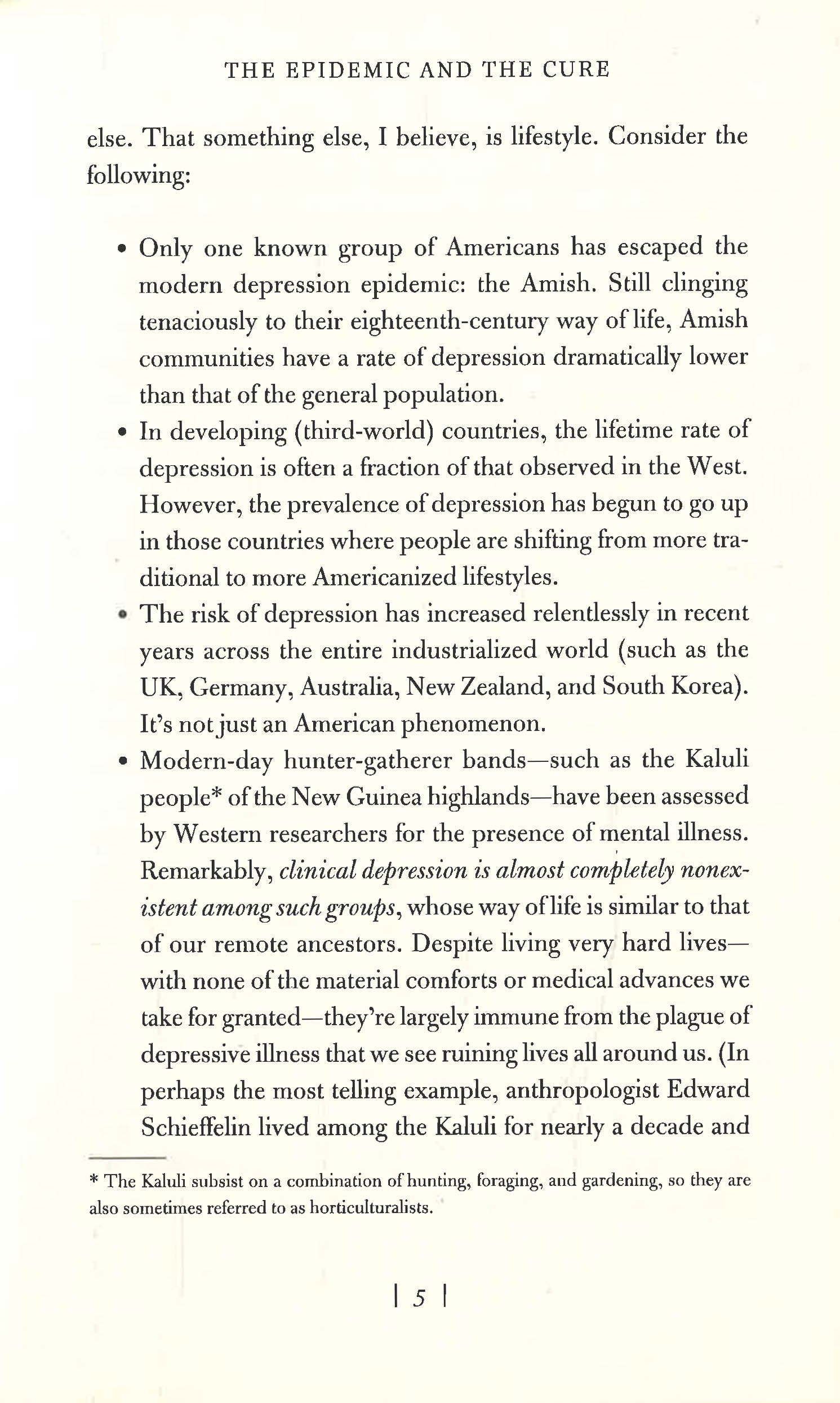 Based on extensive research with an amazing success rate, The Depression Cure outlines a step-by-step plan for recovery from depression, which focuses on six key lifestyle elements that have largely disappeared in healthy doses from modern life: