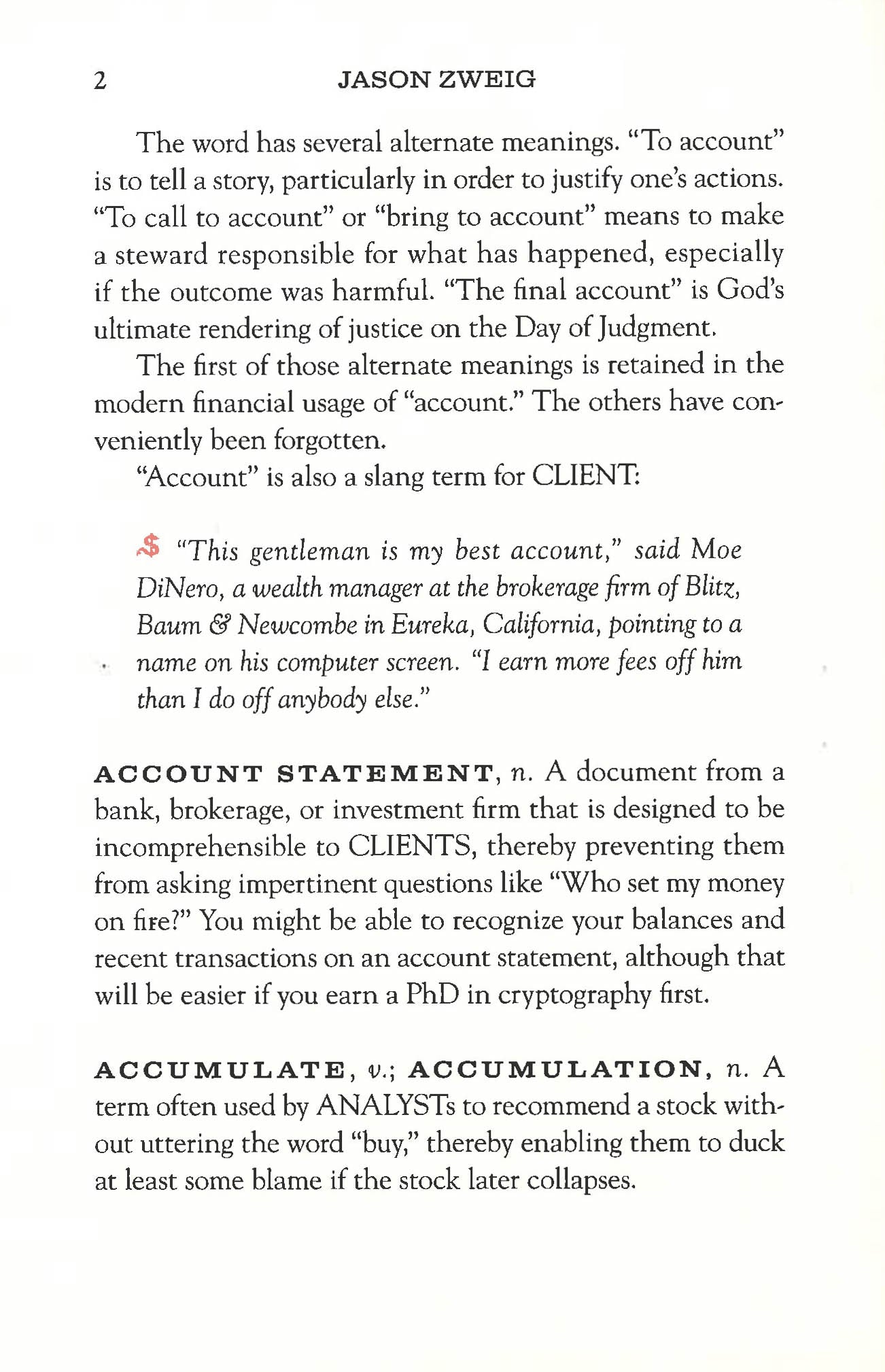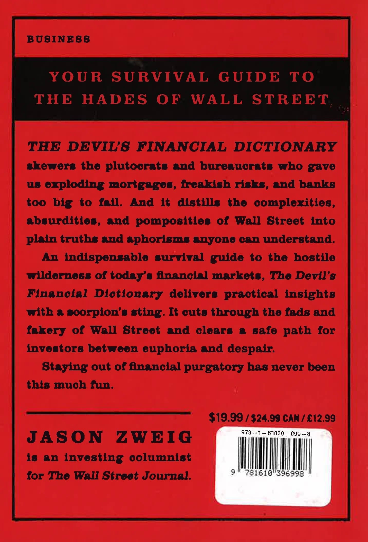 Your Survival Guide to the Hades of Wall Street The Devil's Financial Dictionary skewers the plutocrats and bureaucrats who gave us exploding mortgages, freakish risks, and banks too big to fail. And it distills the complexities, absurdities, and pomposities of Wall Street into plain truths and aphorisms anyone can understand.An indispensable survival guide to the hostile wilderness of today's financial markets, The Devil's Financial Dictionary delivers practical insights with a scorpion's sting. It cuts through the fads and fakery of Wall Street and clears a safe path for investors between euphoria and despair.Staying out of financial purgatory has never been this fun.