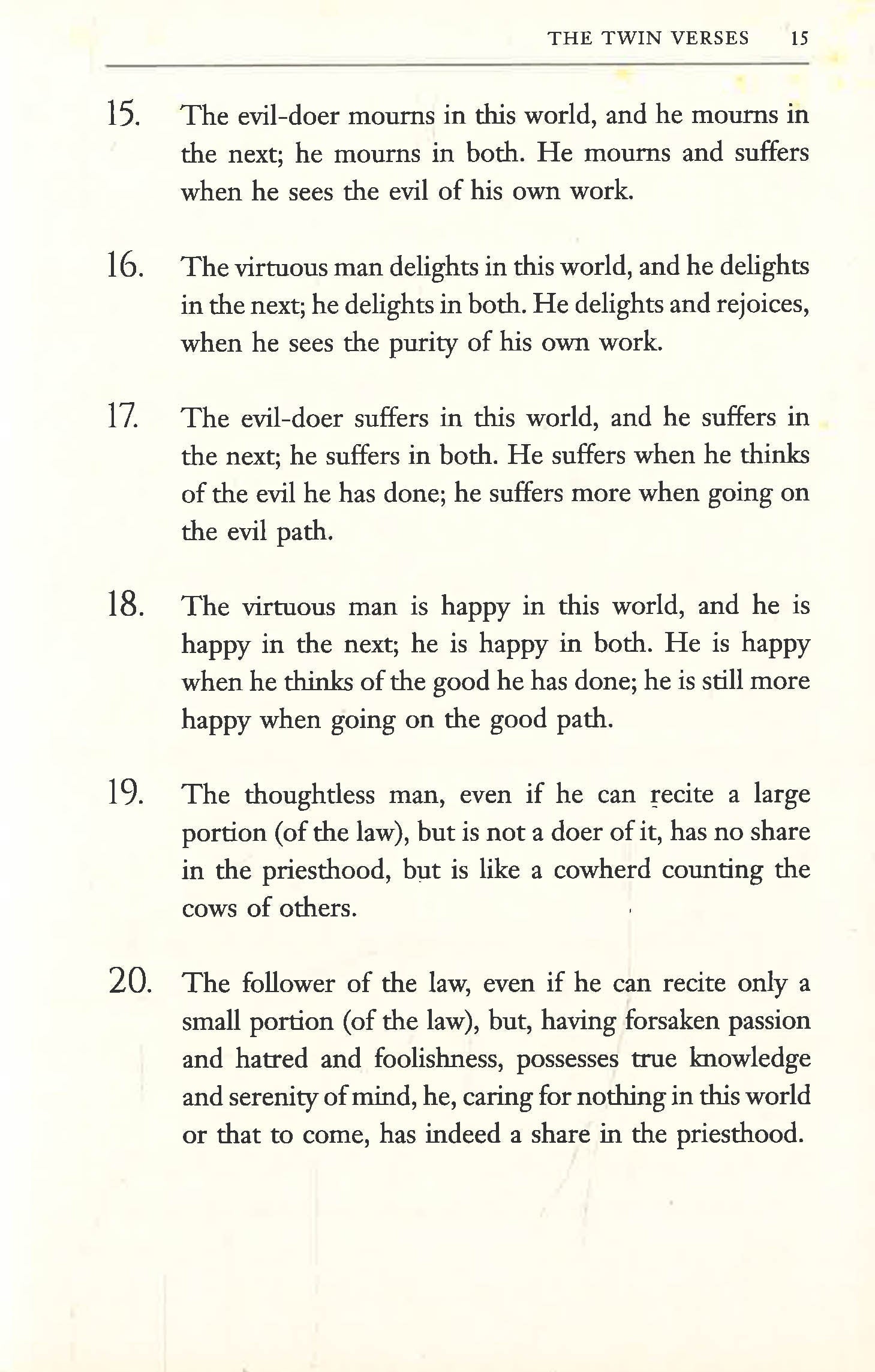 The Dhammapada is one of the world's great spiritual texts, providing the Buddha's own advice on how to live one's life. Through a collection of simple verses, it guides the reader down a path of wisdom, morality and compassion. These verses can help clear one's mind of the obstacles that bedevil modern life. Faithfully recorded by the Buddha's disciples, this text allows the reader unique access to one of the most influential and inspiring figures in world history.