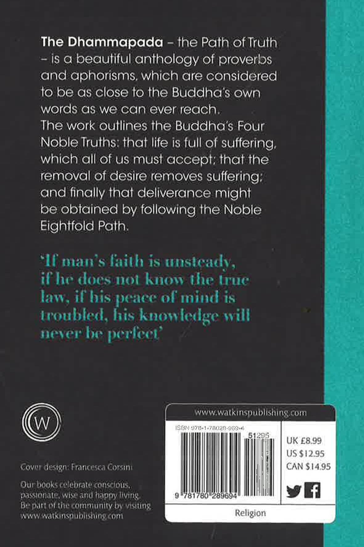 The Dhammapada - the Path of Truth - is a beautiful anthology of proverbs and aphorisms, which are considered to be as close to the Buddha's own words as we can ever reach. The work outlines the Buddha's Four Noble Truths: that life is full of suffering, which all of us must accept; that the removal of desire removes suffering; and finally that deliverance might be obtained by following the Noble Eightfold Path. 'If man's faith is unsteady,if he does not know the true law, if his peace of mind is troubled, his knowledge will never be perfect'