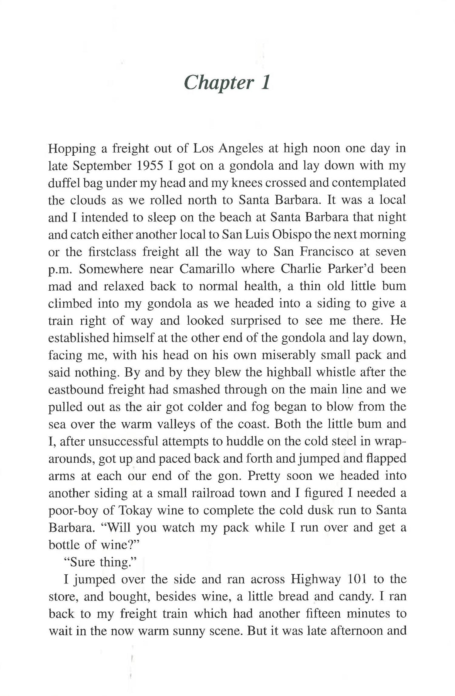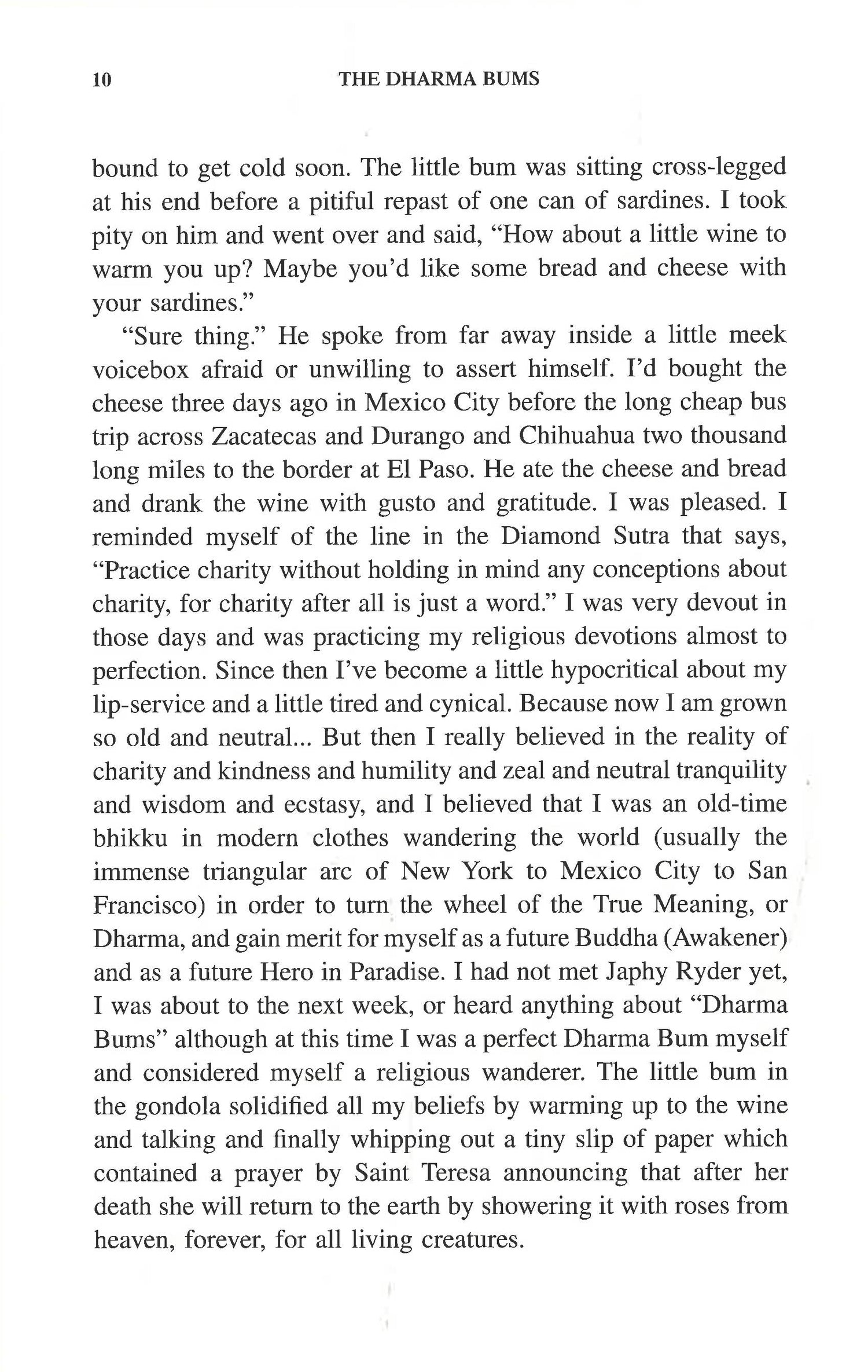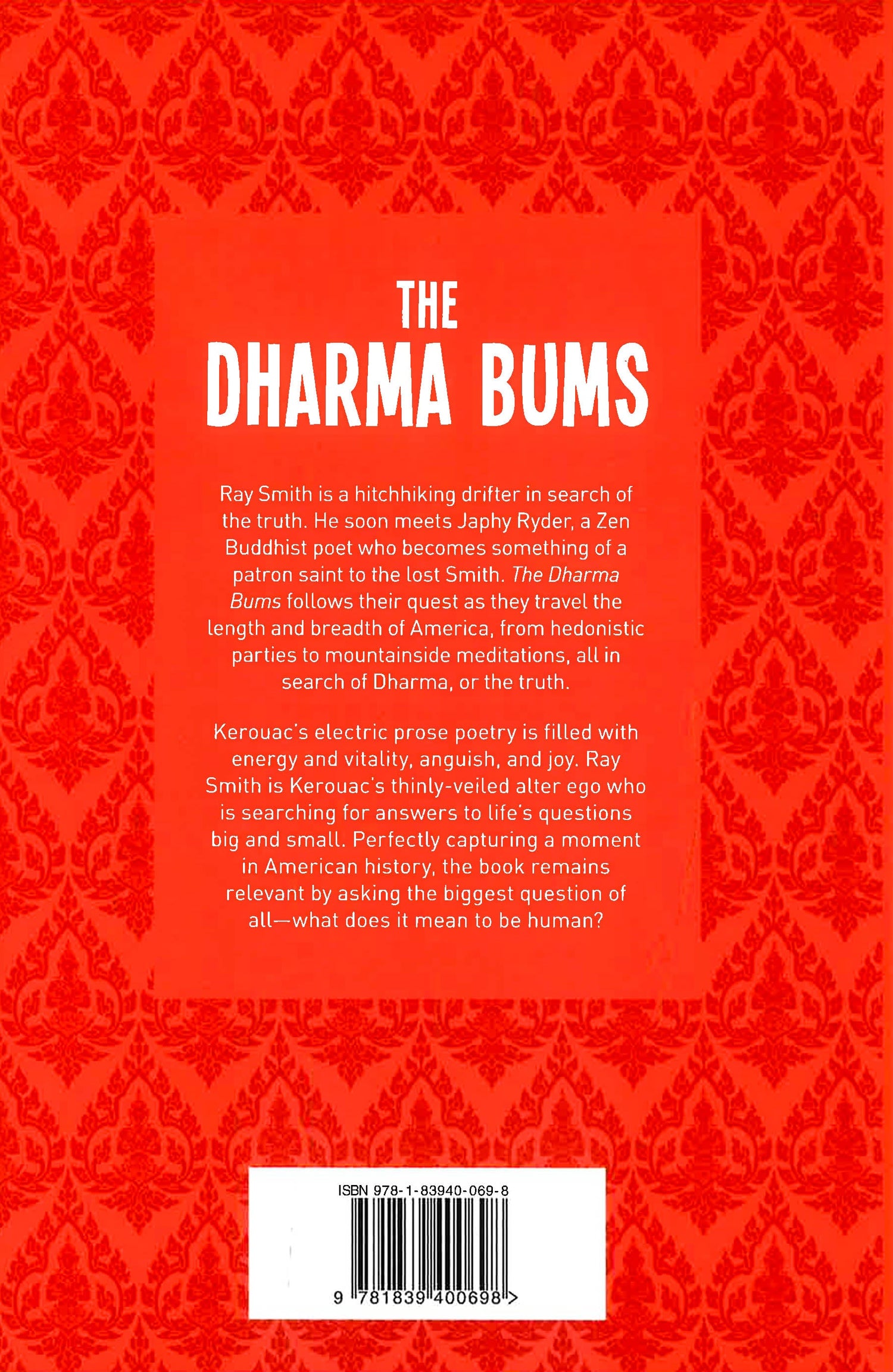 Who were all these strange ghosts rooted to the silly little adventure of earth with me? And who was I? - Ray Smith The Dharma Bums, follows years after the events of Kerouac's best-known work On the Road and like the earlier novel is populated by semi-fictionalised versions of the Beat Generation that Kerouac was a part of. The fictionalised Kerouac, Ray Smith, meets Zen poet and adventurer Japhy Ryder - based on Gary Snyder - and is invigorated by his adventuring and Zen Buddhist lifestyle. The book follows these two men on their quest for dharma or truth as they travel across America. The Dharma Bums explores Smith's search for transcendence in the expanses of America, as he climbs the Matterhorn and lives in isolation on Desolation Peak, juxtaposed against his city-life of parties and poetry readings. Written in Kerouac's signature 'spontaneous prose' which blends narrative with prose-poetry the book would prove a significant influence on the later Hippie counterculture and remains one of his most popular works.