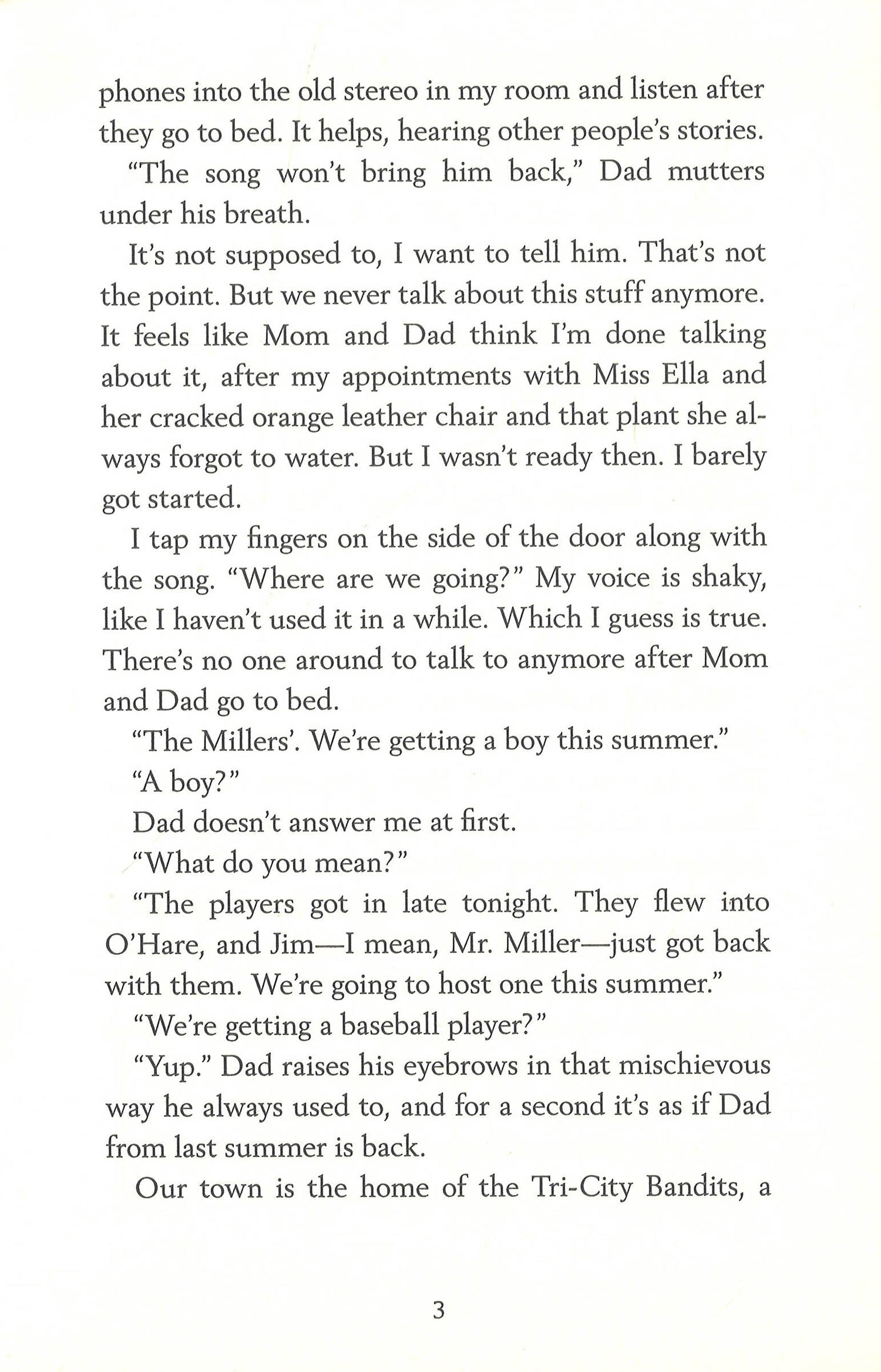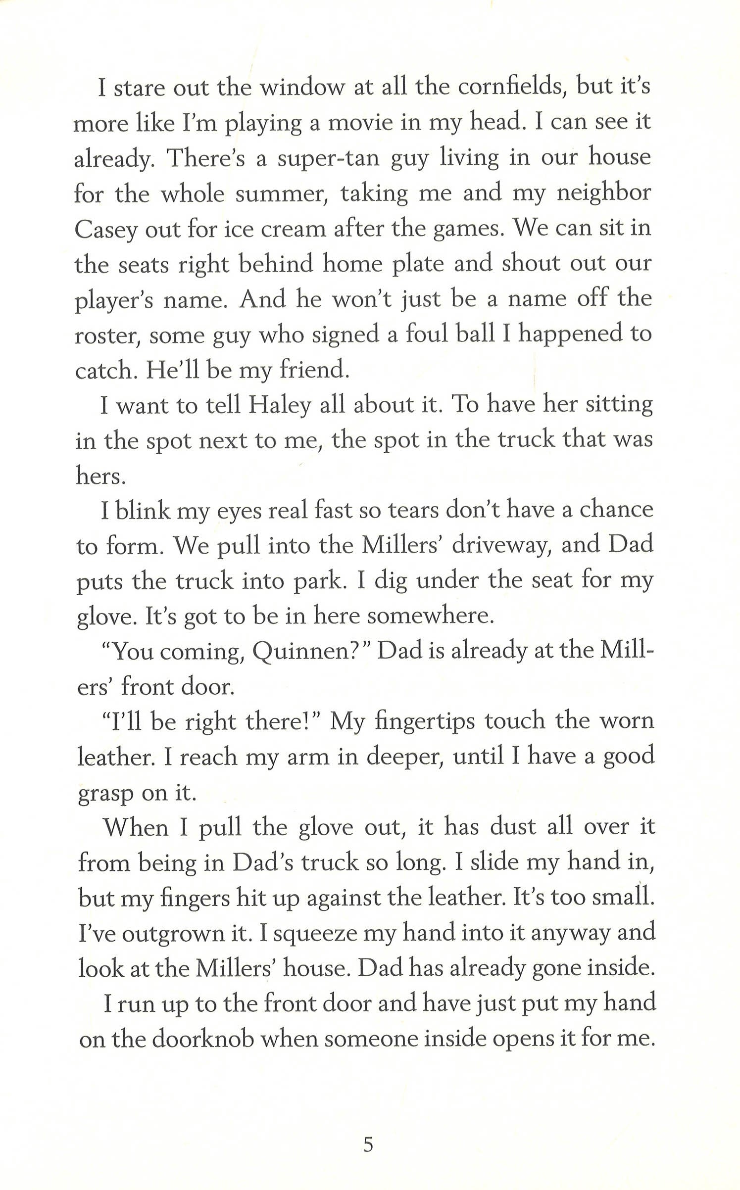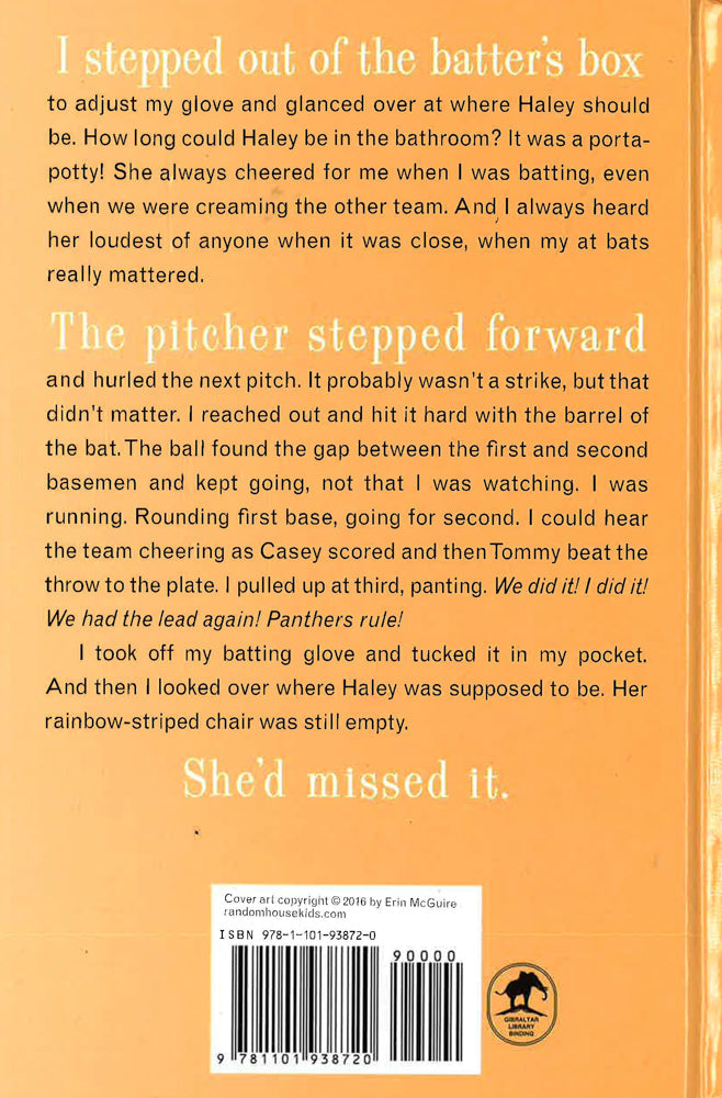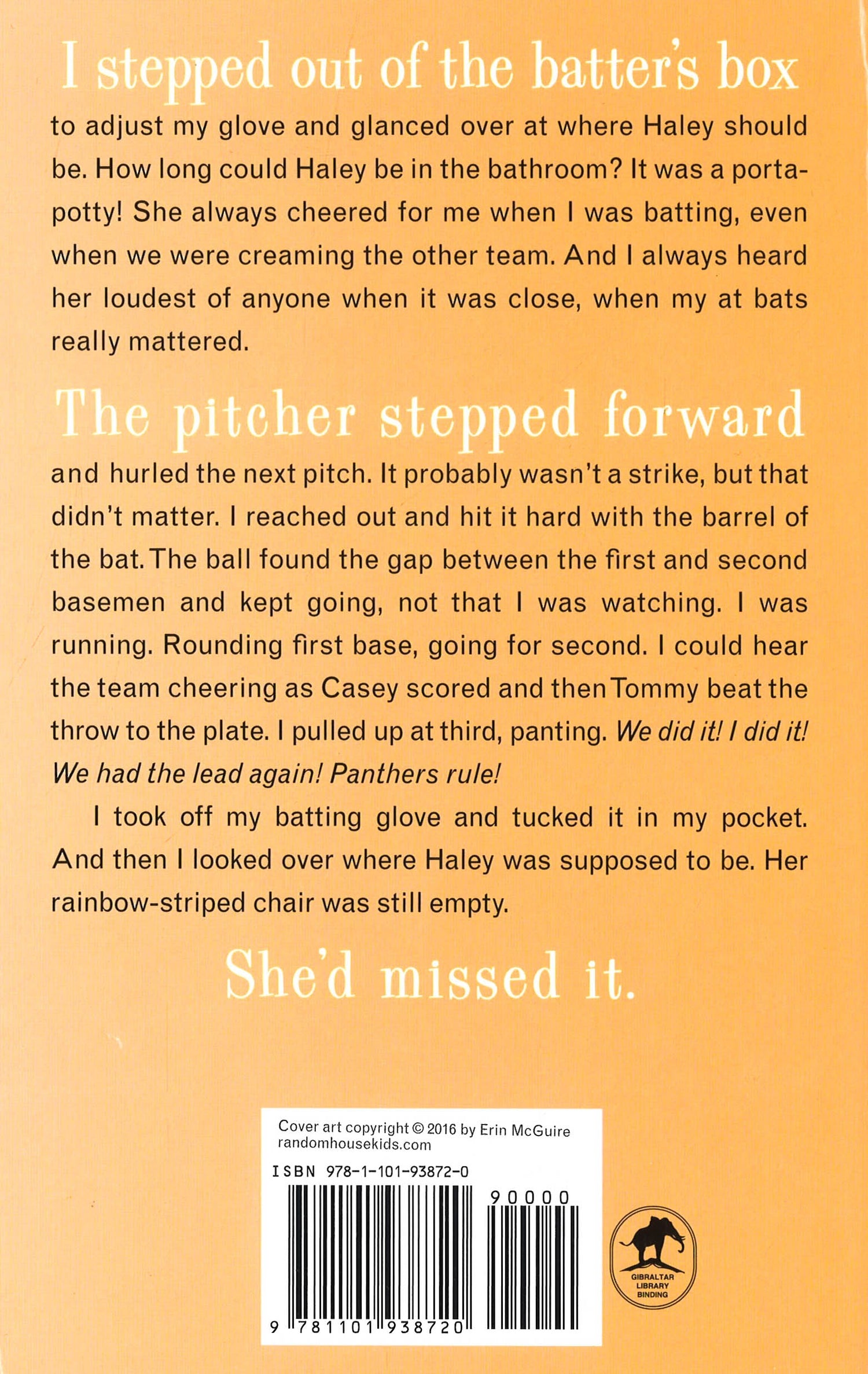 Last summer, Quinnen was the star pitcher of her baseball team, the Panthers. They were headed for the championship, and her loudest supporter at every game was her best friend and older sister, Haley. This summer, everything is different. Haley’s death, at the end of last summer, has left Quinnen and her parents reeling. Without Haley in the stands, Quinnen doesn’t want to play baseball. It seems like nothing can fill the Haley-sized hole in her world. The one glimmer of happiness comes from the Bandits, the local minor-league baseball team. For the first time, Quinnen and her family are hosting one of the players for the season. Without Haley, Quinnen’s not sure it will be any fun, but soon she befriends a few players. With their help, can she make peace with the past and return to the pitcher’s mound?