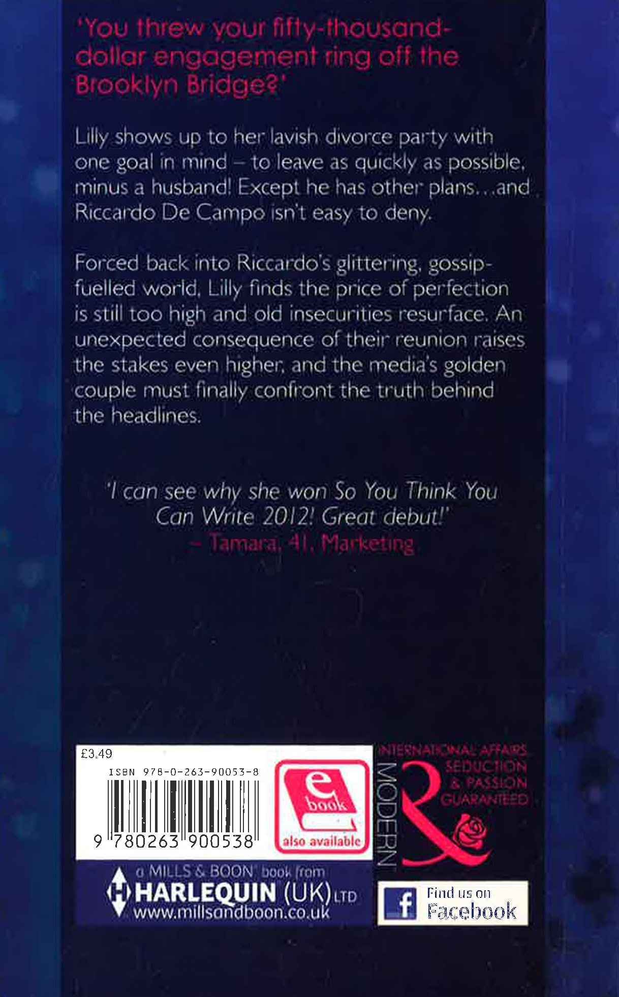 'You threw your fifty-thousand- dollar engagement ring off the Brooklyn Bridge?' Lilly shows up to her lavish divorce party with one goal in mind - to leave as quickly as possible, minus a husband! Except he has other plans...and Riccardo De Campo isn't easy to deny. Forced back into Riccardo's glittering, gossip-fuelled world, Lilly finds the price of perfection is still too high and old insecurities resurface. An unexpected consequence of their reunion raises the stakes even higher, and the media's golden couple must finally confront the truth behind the headlines. 'I can see why she won So You Think You Can Write 2012! Great debut!' - Tamara, 41, Marketing
