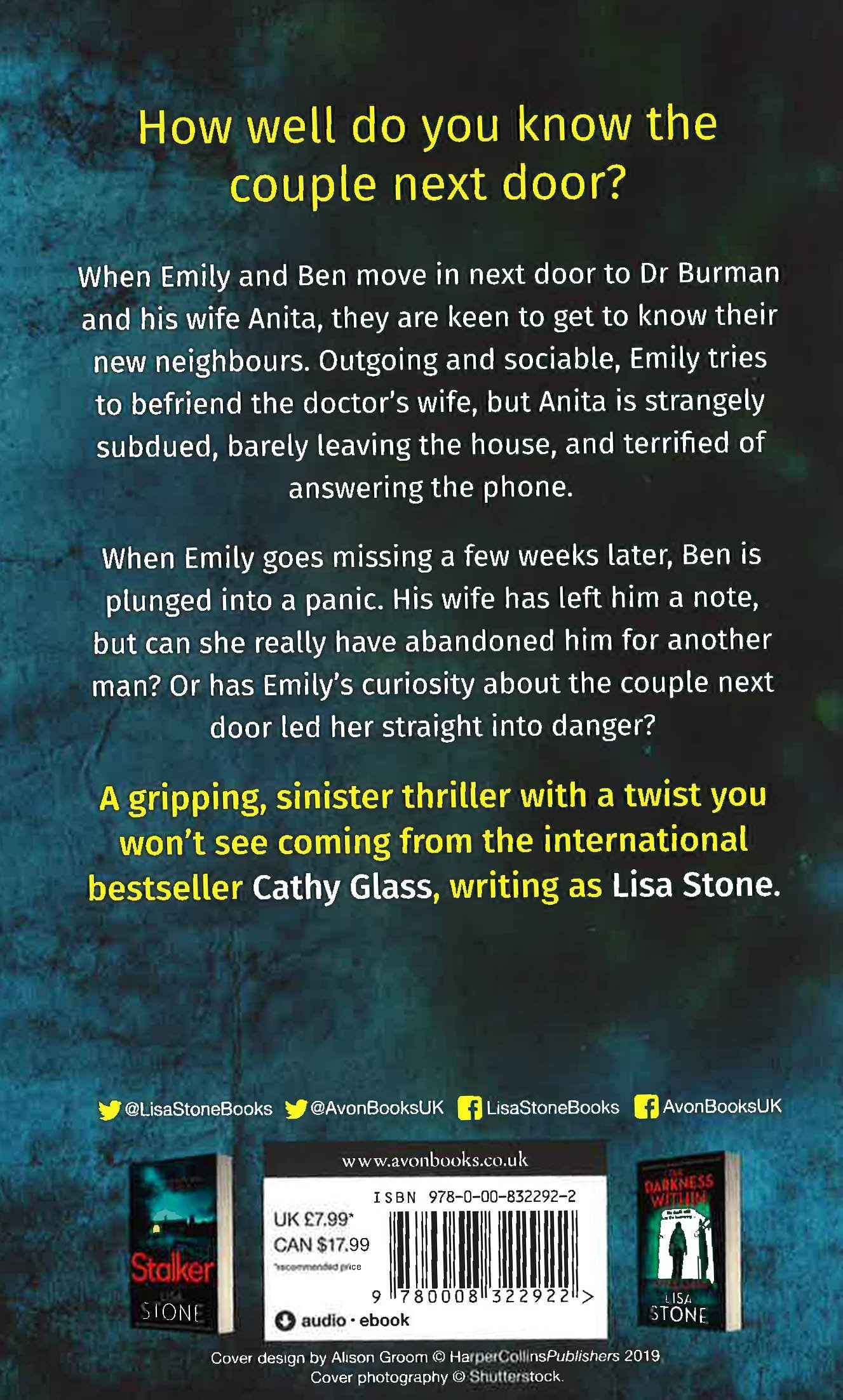I was gripped immediately' Katerina Diamond, Sunday Times bestseller How much do you know about the couple next door? When Emily and Ben move in next door to Dr Burman and his wife Alisha, they are keen to get to know their new neighbours. Outgoing and sociable, Emily tries to befriend the doctor's wife, but Alisha is strangely subdued, barely leaving the house, and terrified of answering the phone. When Emily goes missing a few weeks later, Ben is plunged into a panic. His wife has left him a note, but can she really have abandoned him for another man? Or has Emily's curiosity about the couple next door led her straight into danger? A gripping, sinister thriller with a twist you won't see coming from the international bestseller Lisa Stone.