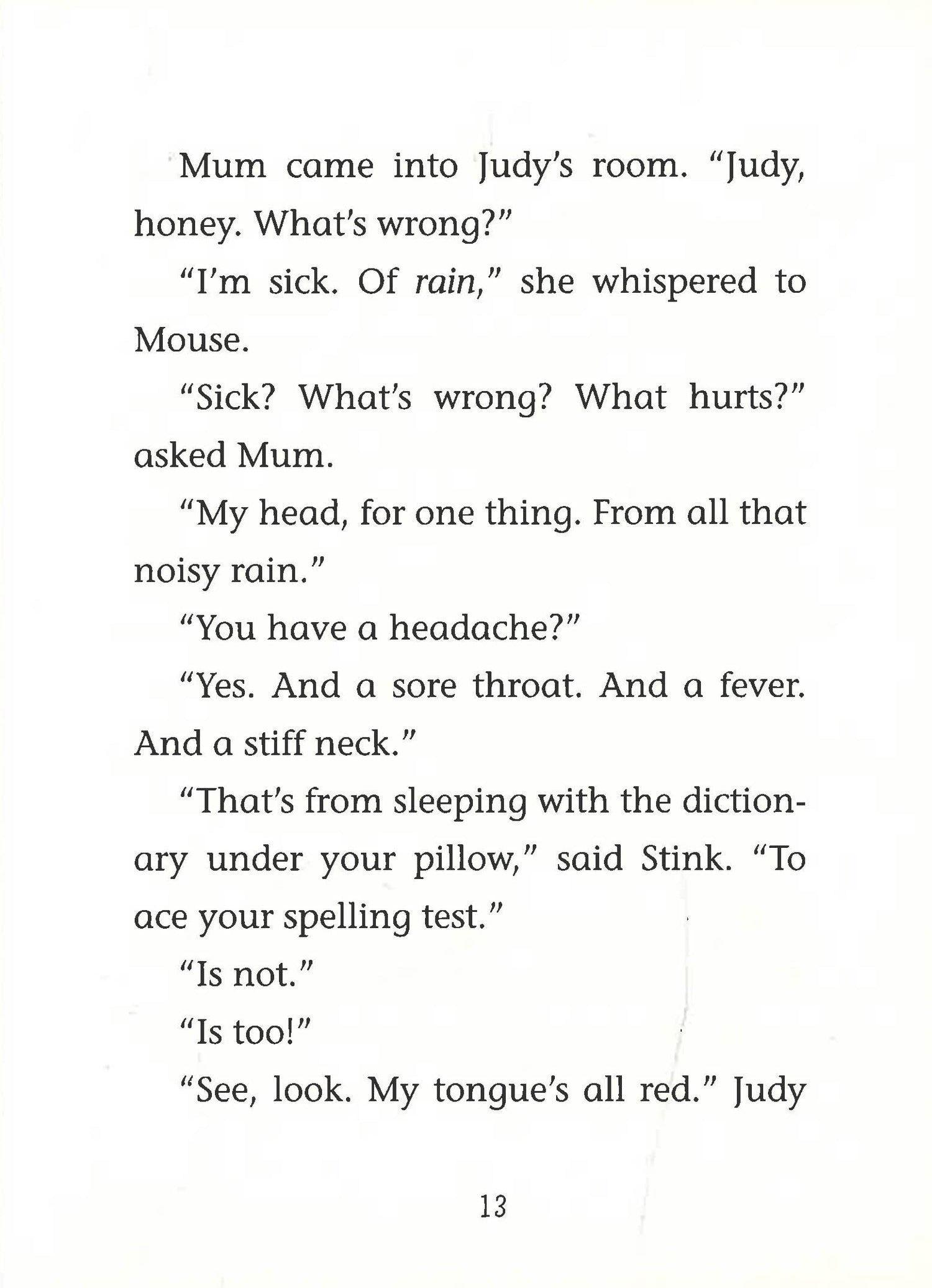 Judy Moody has got the Moody Monday blues - until she finds out that her class's new project is on the amazing human body. That means skeletons, skulls, a hospital trip, lots of medical jokes and double trouble when Judy's friends trick her into thinking the class guinea pig has been cloned! But when Judy catches the mumps off her younger "bother", Stink, her friends make it up to her by coming to visit.