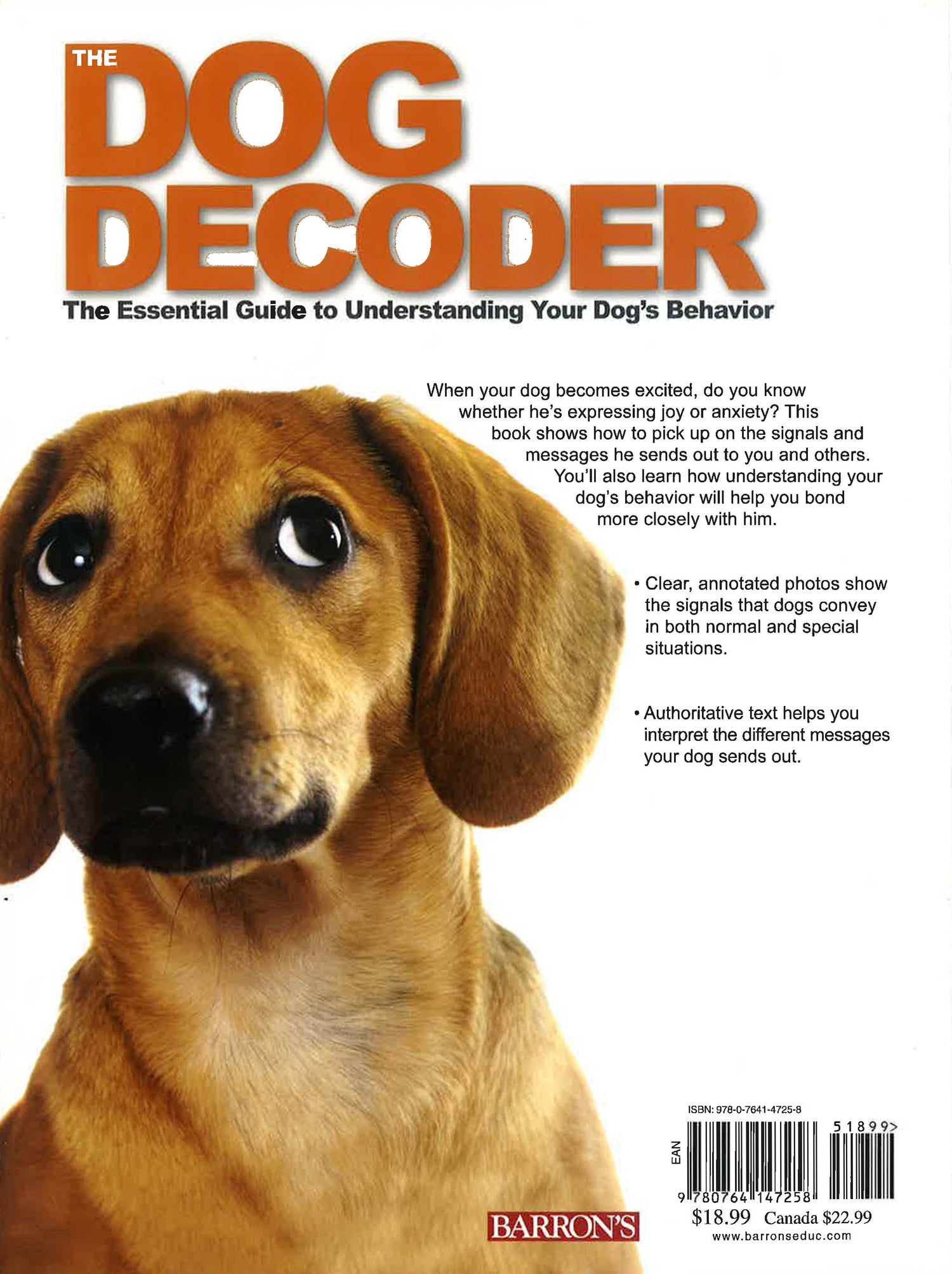 Often, when a dog owner finds that his pet has become excited, he can't tell if the excitement indicates joy or anxiety. This book shows how to pick up on all the signals that dogs send out through their voices, body language, postures, tail-wagging, and more. "The Dog Decoder" helps readers understand what dogs are trying to say to their human masters. Aided by vivid color photos, author David Alderton describes how dogs communicate inside the home, out on the street, encountering visitors and other animals, walking off their lead, and at play in the park. Alderton has carefully selected, captioned, and annotated photos to help fellow dog owners gain a clear understanding of their pet's behavior. He advises on how to predict a dog's reaction to a particular situation, enabling owners to use that knowledge for a more enriching and less stressful relationship with their dog. More than 100 color photos.