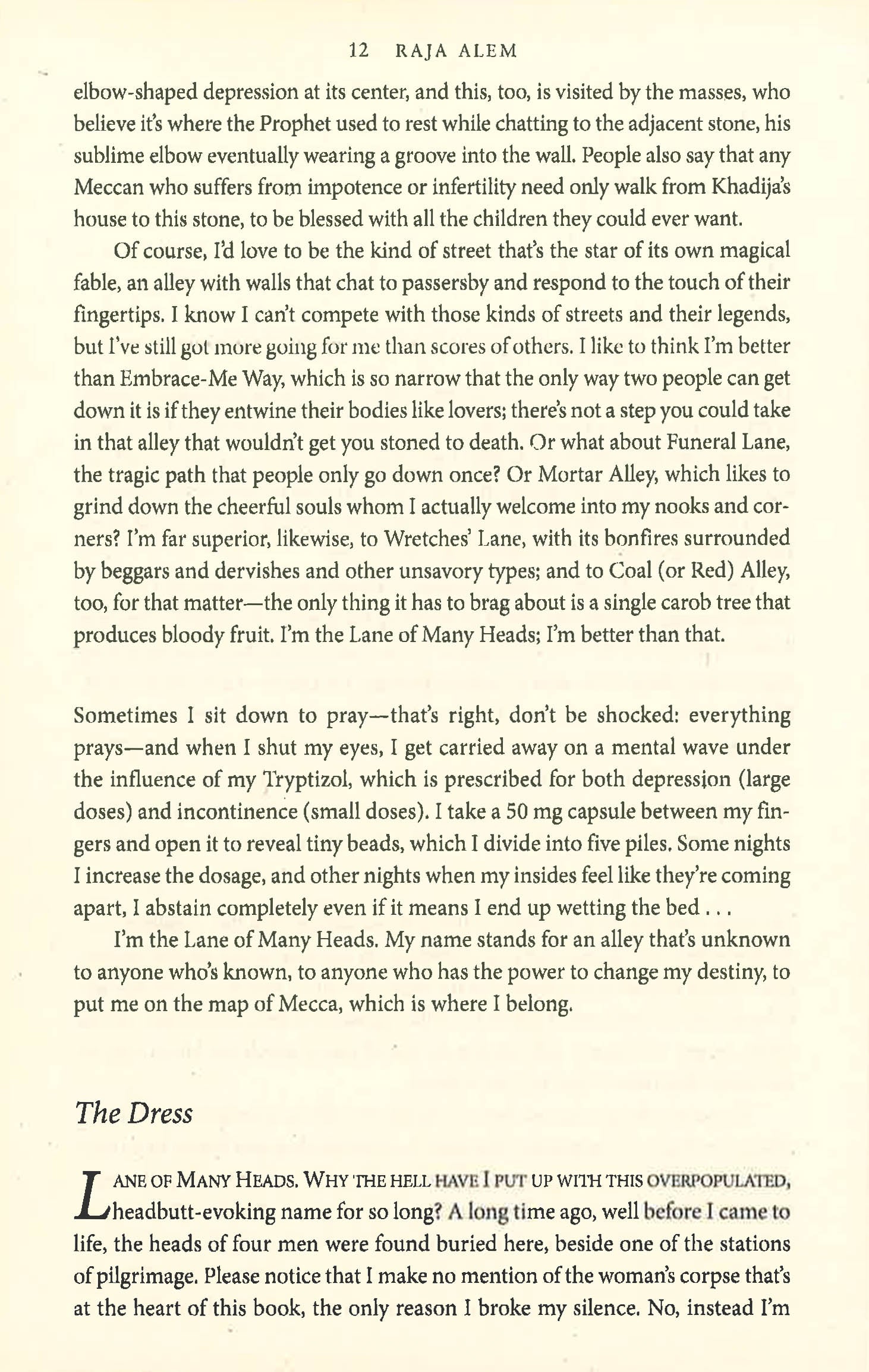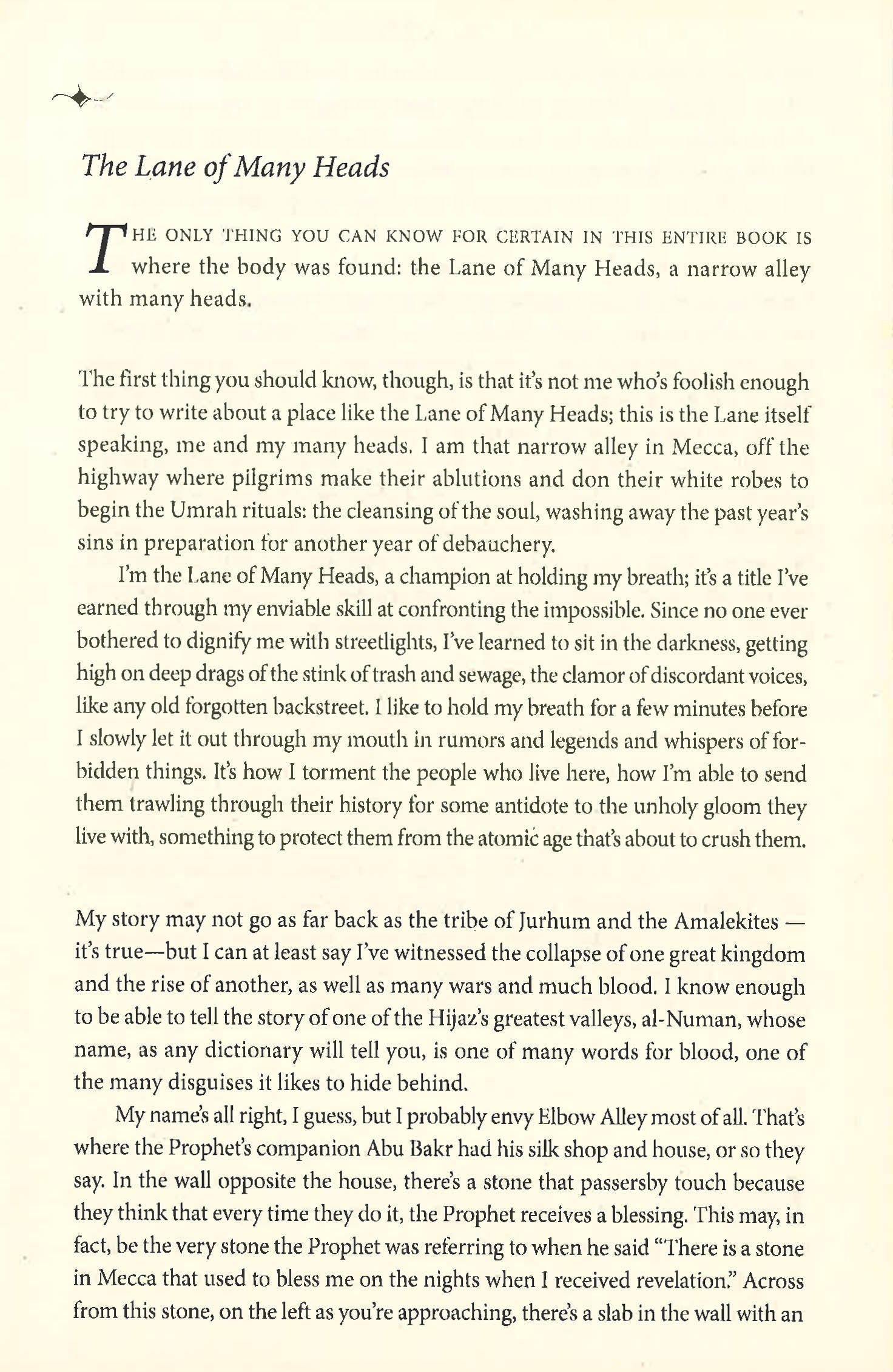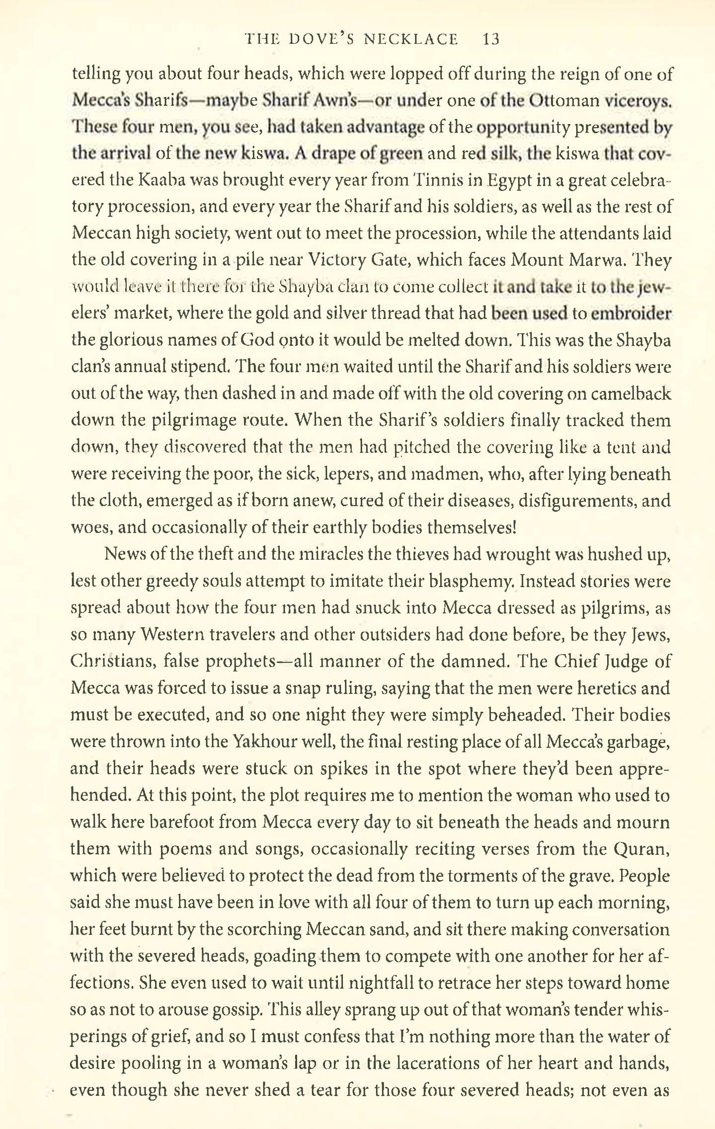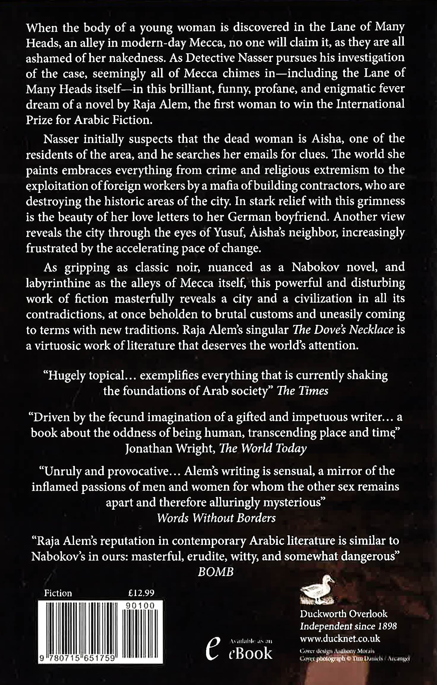Mu'az, the photographer's apprentice, was leaping between two roofs when he froze in mid-air, transfixed by what he saw below. Deep in the cleft between the two houses was the body.In Mecca's 'Lane of Many Heads' lies the unclothed body of a murdered woman. Nobody claims the victim: her nudity is a source of shame in the Holy City's strictly conservative culture. When the cholesterol-riddled and sleep-deprived detective Nasser al-Qahtani takes charge of the investigation, he is soon confronted by some of Mecca's darkest secrets by its corruption, poverty, misogyny and rampant greed. Never once shying away from taboos, Raja Alem effortlessly intertwines myth, fantasy and everyday reality to evoke the rich mosaic of Meccan life to tell the story of a civilisation torn between dogmatic conservatism and the desire to modernise. Narrated by several different voices including two headstrong women and the 'Lane of Many Heads' itself The Dove's Necklace is a beautiful, powerful novel which challenges false preconceptions of the Arab world, and conjures up a compelling portrait of a city and its people