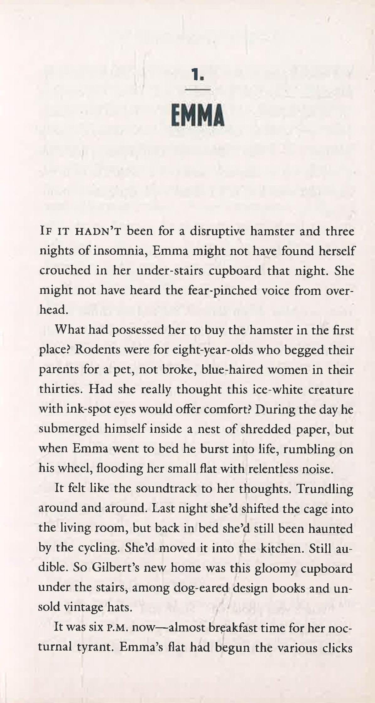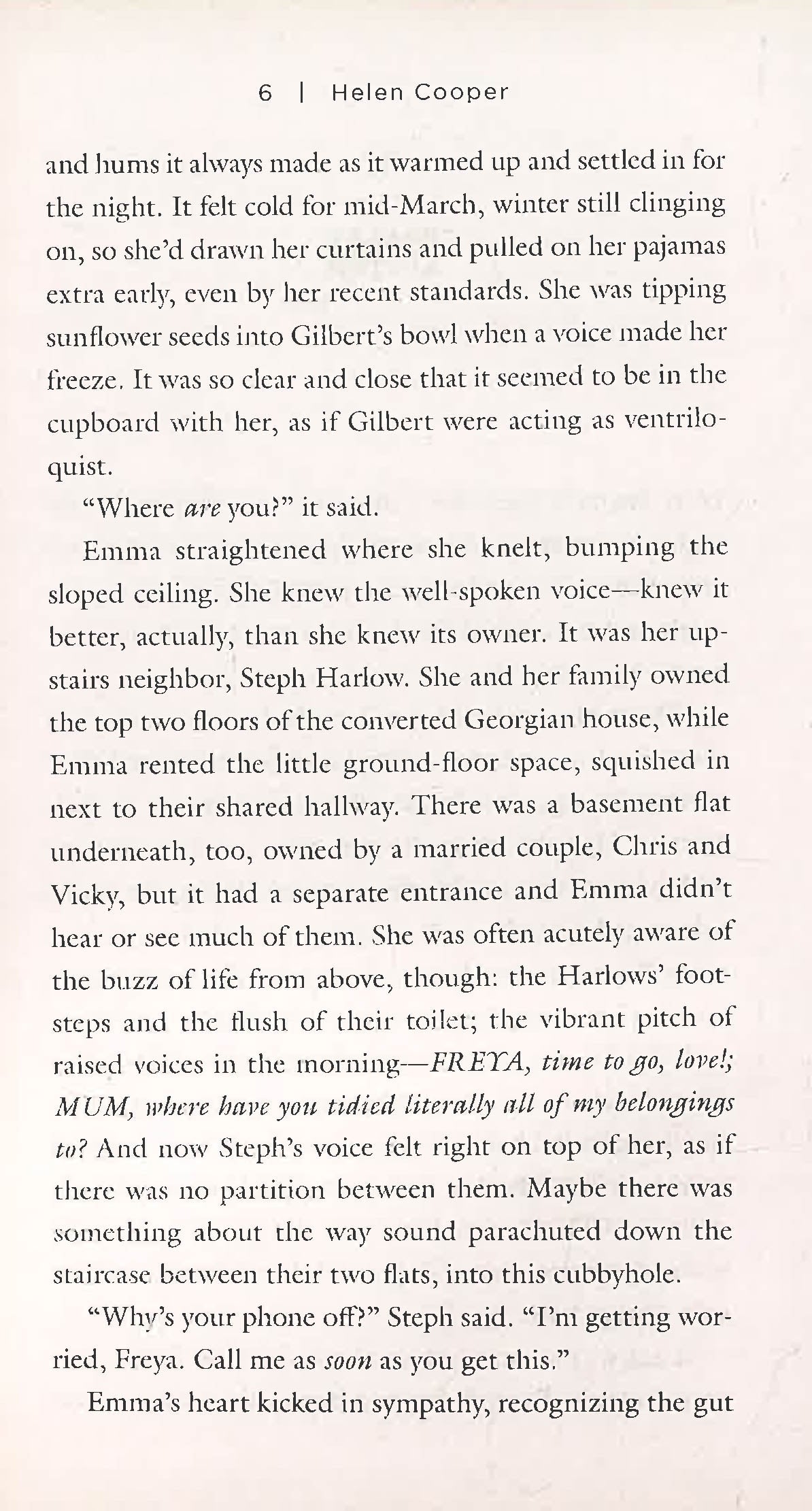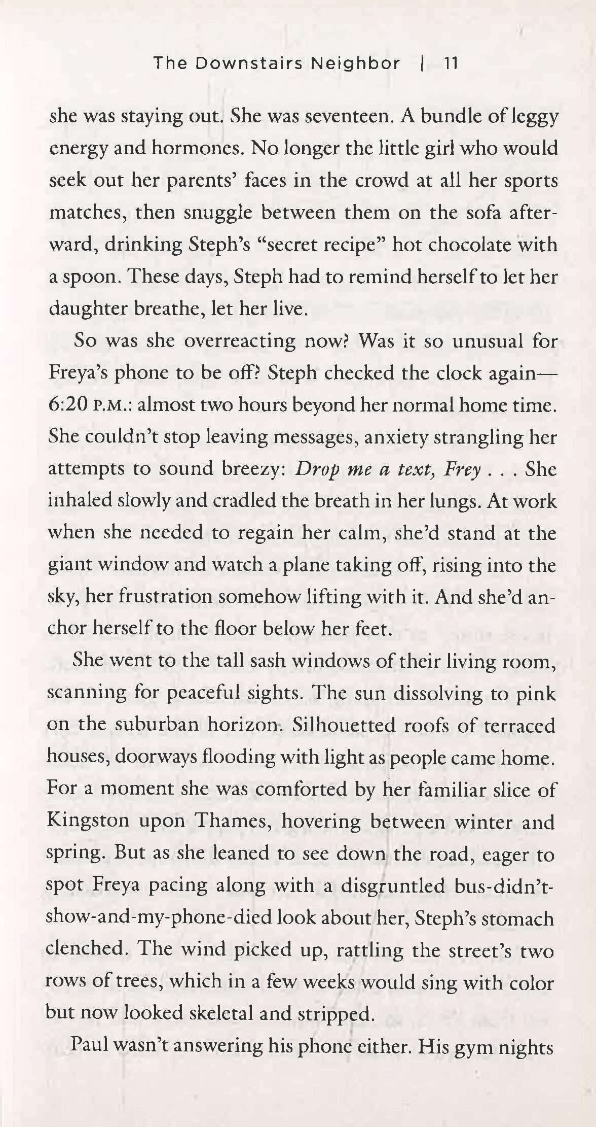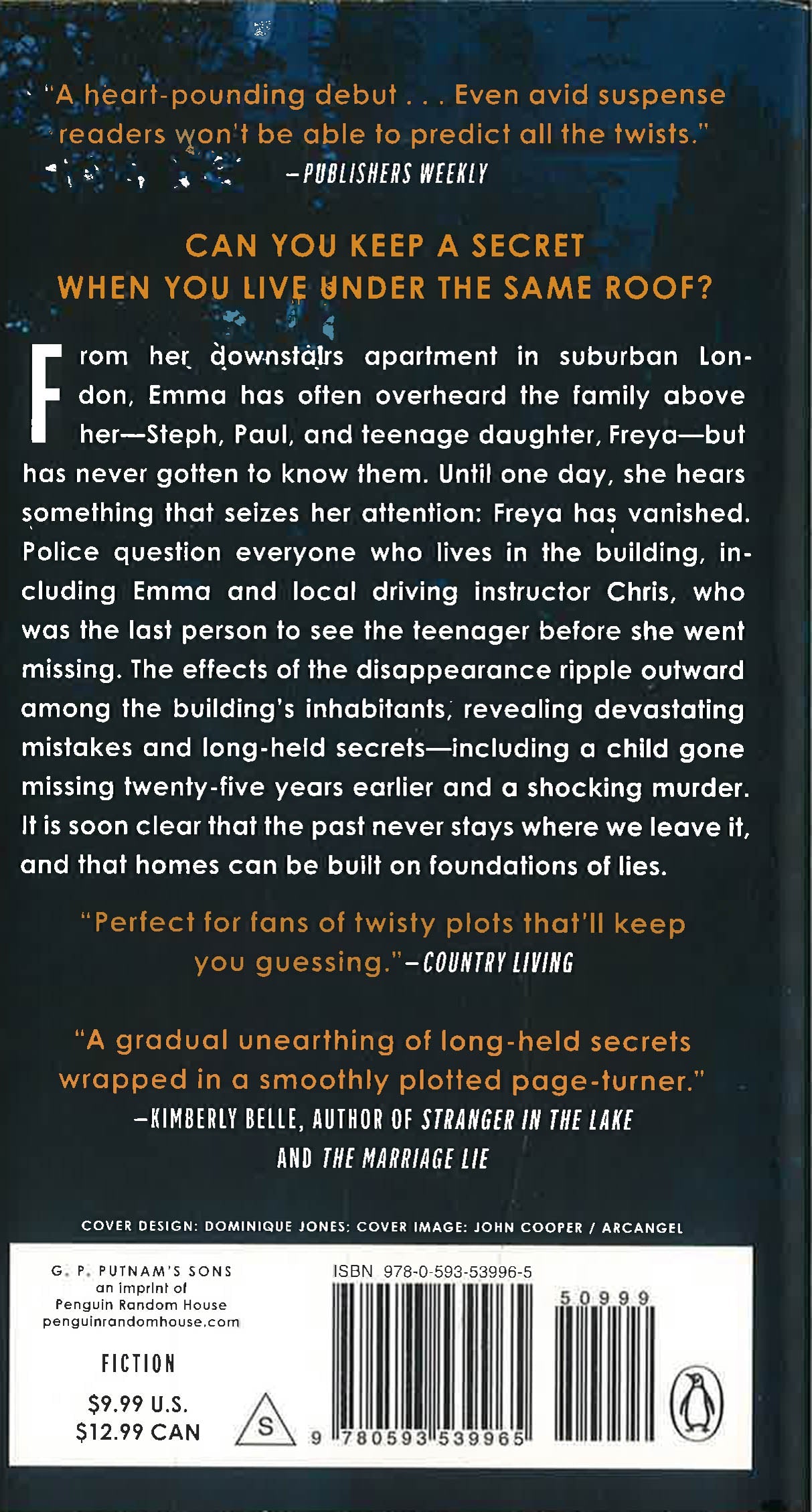 From her downstairs apartment in suburban London, Emma has often overheard the everyday life of the seemingly perfect family upstairs--Steph, Paul and teenage daughter Freya--but has never got to know them. Until one day, she hears something that seizes her attention: Freya has vanished and the police are questioning Steph and Paul about their life. Do either of you have any enemies? Anyone who might want to harm or threaten you?
