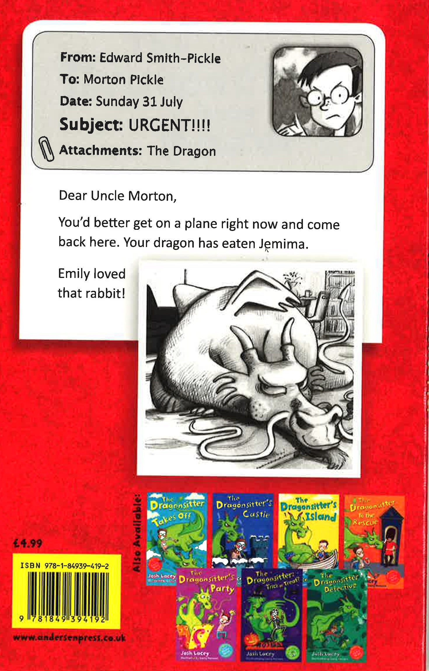 Dear Uncle Morton. You'd better get on a plane right now and come back here. Your dragon has eaten Jemima. It had sounded so easy: Edward was going to look after Uncle Morton's unusual pet for a week while he went on holiday. But soon the fridge is empty, the curtains are blazing, and the postman is fleeing down the garden path. Short, sharp and funny' - Telegraph
