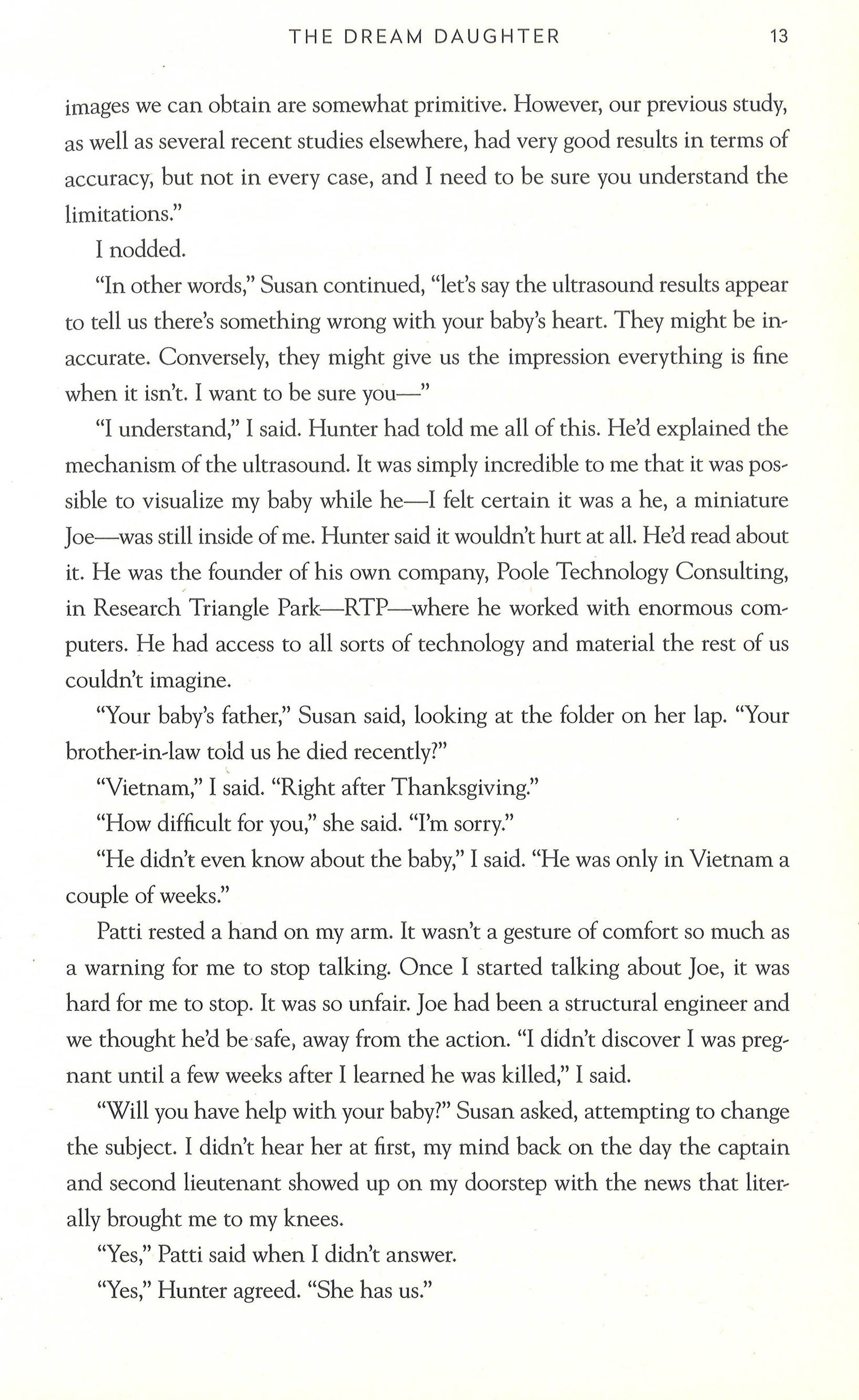 The Dream Daughter is a page-turning and unforgettable story of love and hope from bestselling author Diane Chamberlain.When Caroline Sears receives the news that her unborn baby girl has a heart defect, she is devastated. It is 1970 and there seems to be little that can be done. But her brother-in-law, a physicist, tells her that perhaps there is. Hunter appeared in their lives just a few years before - and his appearance was as mysterious as his past. With no family, no friends, and a background shrouded in secrets, Hunter embraced the Sears family and never looked back. Now, Hunter is telling her that something can be done about her baby's heart. Something that will shatter every preconceived notion that Caroline has. Something that will require a kind of strength and courage that Caroline never knew existed. Something that will mean a mind-bending leap of faith on Caroline's part.And all for the love of her unborn child.