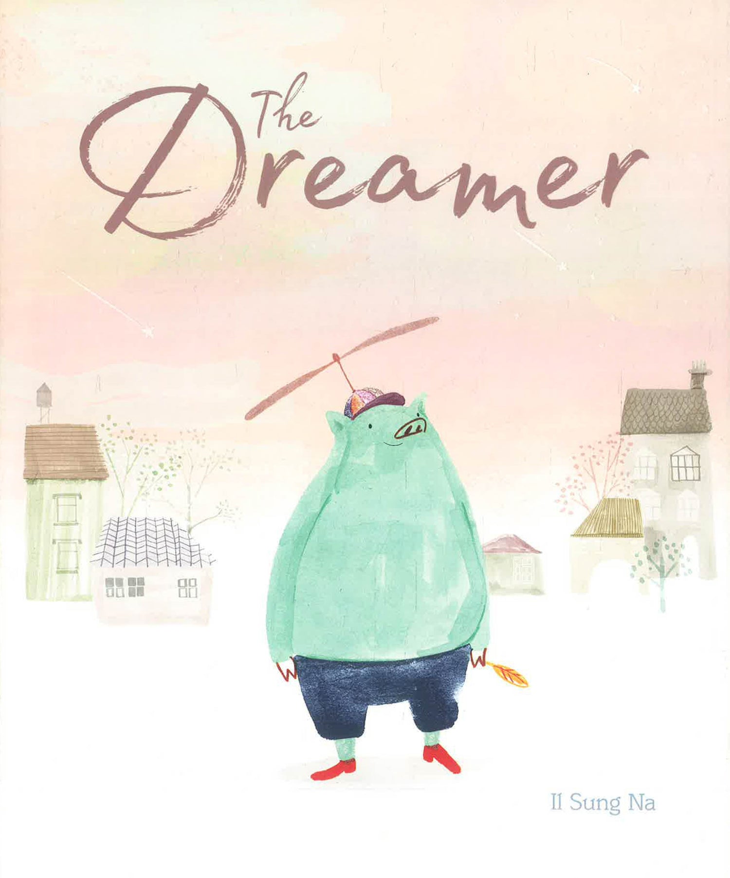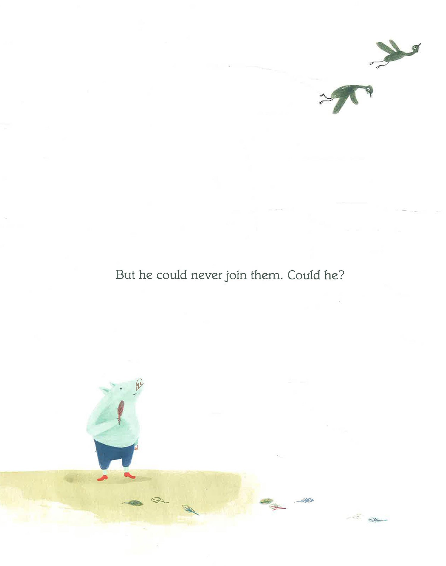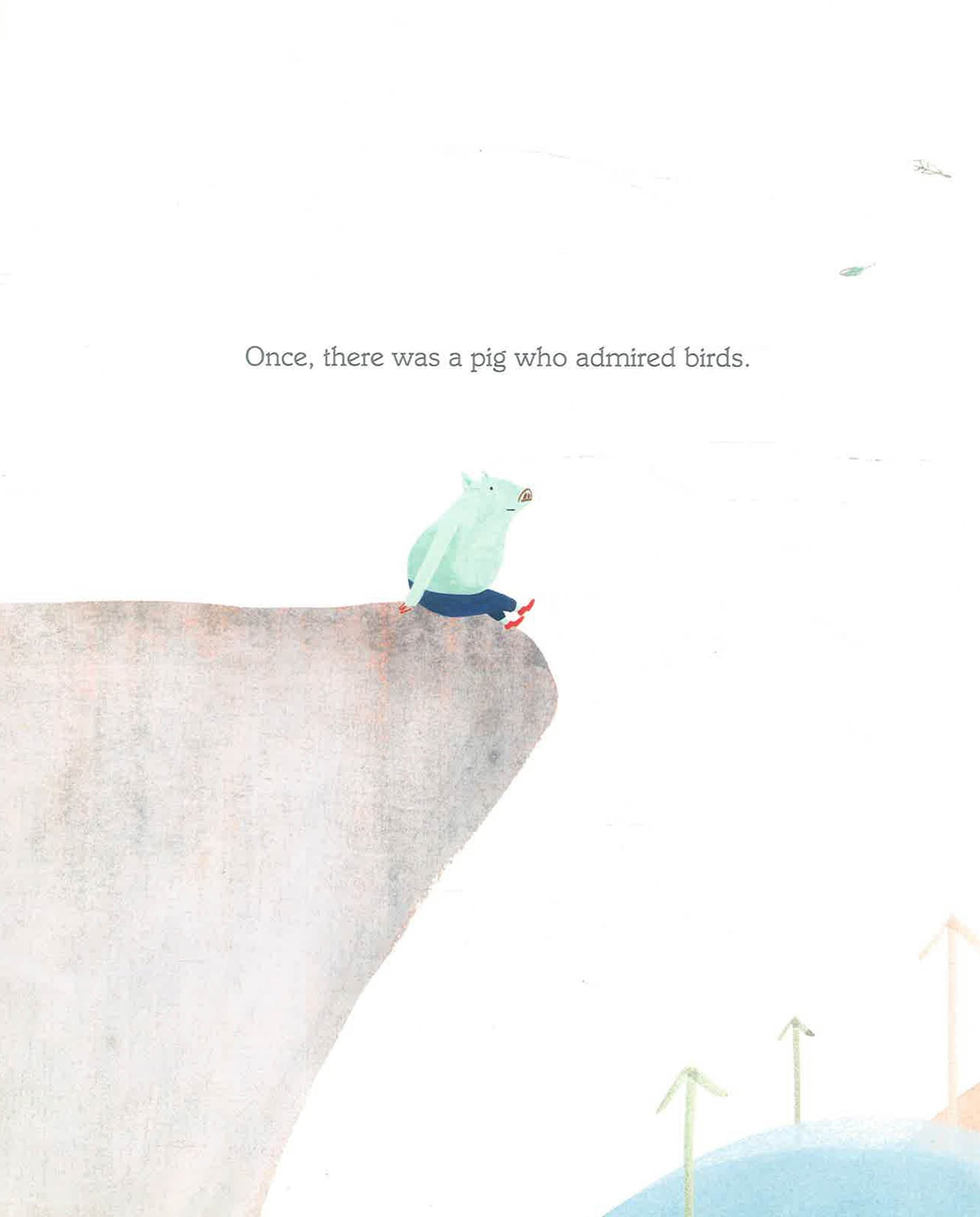 Even pigs can learn to fly: Once, there was a pig who admired birds. But he could never join them. Or could he? Thus begins the journey of a pig with big dreams, and the perseverance to make them come true. He develops flight plans, builds experimental contraptions, and has far-flung adventures, but at the end of the day, his favorite thing to do is sit and watch for those he loves best: birds. Il Sung Na creates a world at once whimsical and aspirational, where anything is possible and, yes, even pigs can learn to fly.