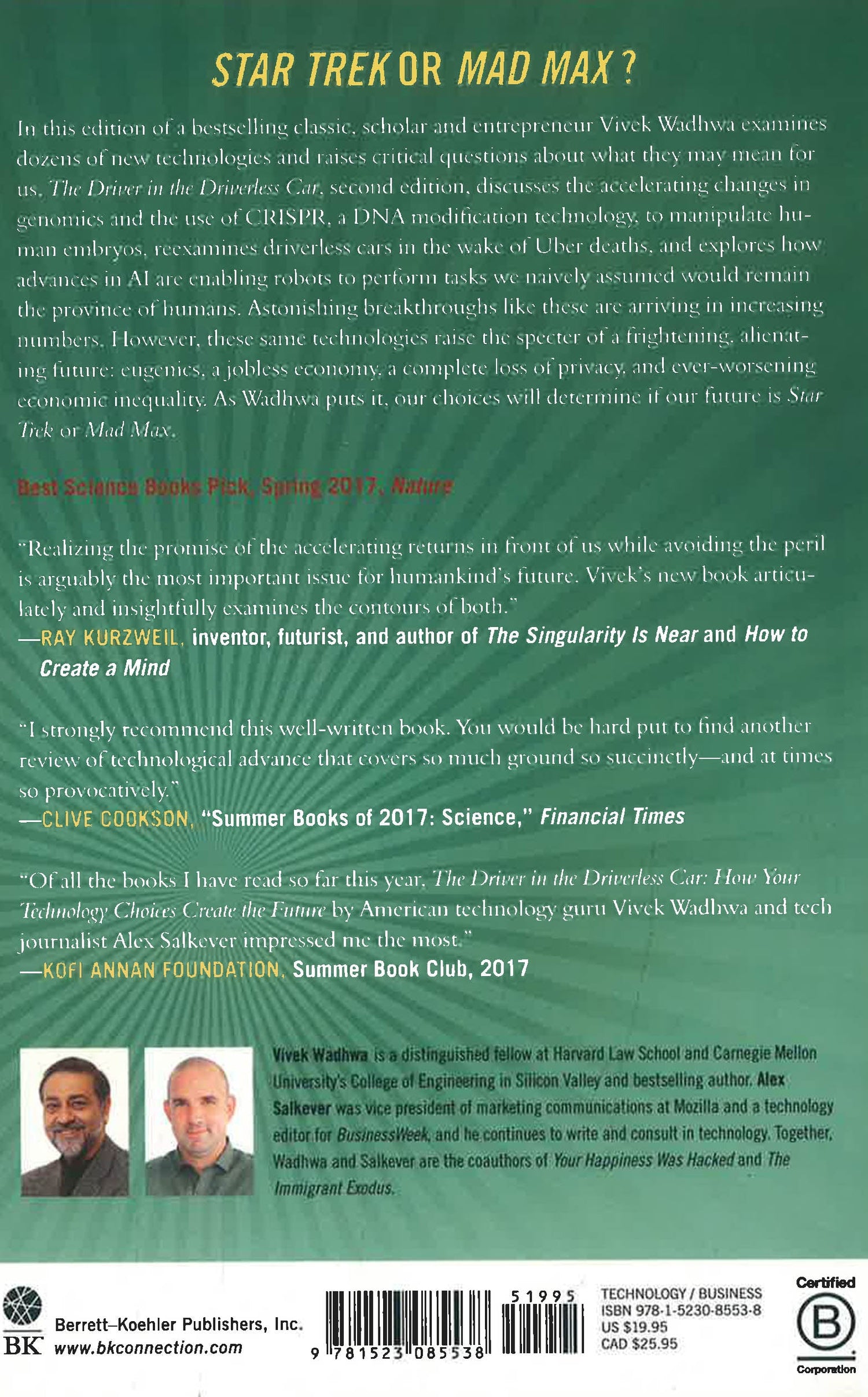 Wadhwa says that we need to ask three questions about every emerging technology: Does it have the potential to benefit everyone equally? What are the risks and the rewards? And does it promote autonomy or dependence? This edition is updated throughout and includes a new chapter on quantum computing, which promises vastly increased processing times—and vastly increased security risks. In the end, our future is up to us; our hands may not be on the wheel, but we will decide the driverless car’s destination.