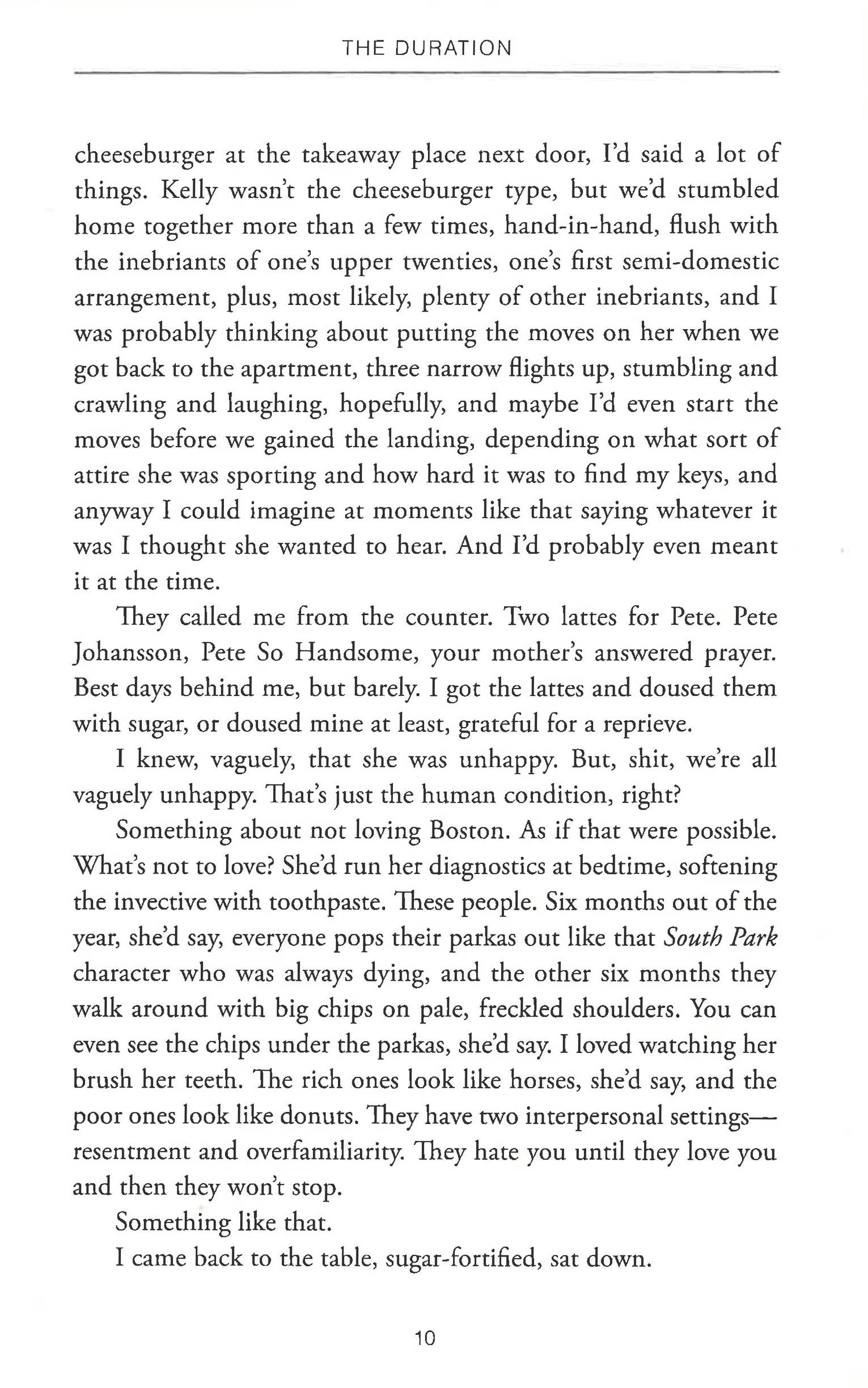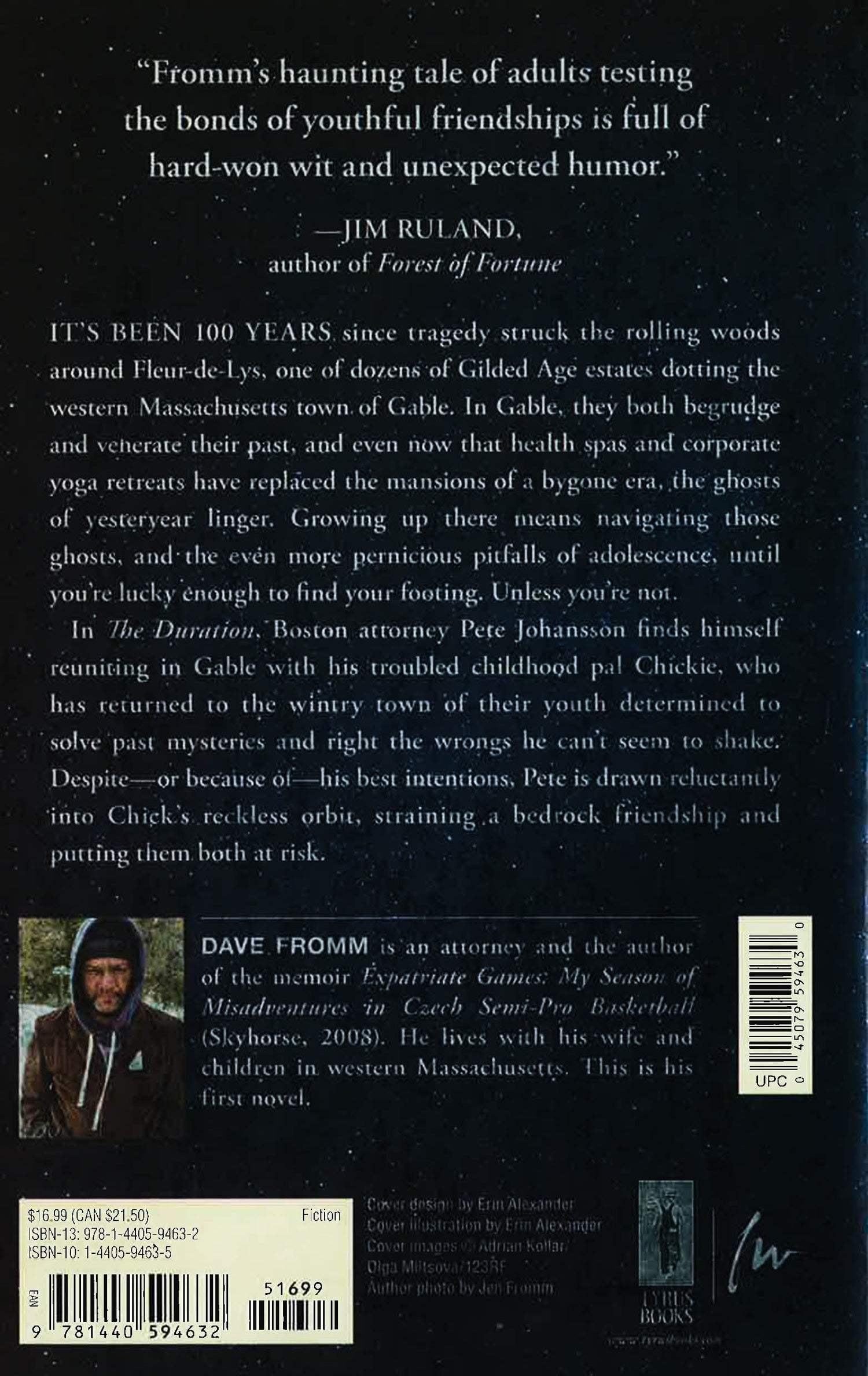 It's been 100 years since tragedy struck the rolling woods around Fleur-de-Lys, one of dozens of Gilded Age estates dotting the western Massachusetts town of Gable. In Gable, they both begrudge and venerate their past, and even now that health spas and corporate yoga retreats have replaced the mansions of a bygone era, the ghosts of yesteryear linger. Growing up there means navigating those ghosts, and the even more pernicious pitfalls of adolescence, until you're lucky enough to find your footing. Unless you're not.In The Duration, Boston attorney Pete Johansson finds himself reuniting in Gable with his troubled childhood pal Chickie, who has returned to the wintry town of their youth determined to solve past mysteries and right the wrongs he can't seem to shake. Despite--or because of--his best intentions, Pete is drawn reluctantly into Chick's reckless orbit, straining a bedrock friendship and putting them both at risk.