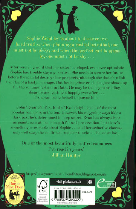 Sophie Wembley is about to discover two hard truths: When planning a rushed betrothal, one must not be picky; and when the perfect earl happens by, one must not be shy . . . After receiving word that her sister has eloped, even ever-optimistic Sophie has trouble staying positive. She needs to secure her future before the scandal destroys her prospects, although she doesn't relish the idea of a hasty marriage. But her longtime crush has just shown up for the summer festival in Bath. He may be the key to avoiding disgrace and getting a happily ever after . . . if she can bring herself to pursue him. John 'Evan' Fairfax, Earl of Evansleigh, is one of the most popular bachelors in the ton. However, his easygoing ways hide a dark past he's determined to keep secret. Evan has always kept acquaintances at arm's length for self-preservation, but there's something irresistible about Sophie . . . and her seductive charms may well sway the confirmed bachelor to seize a chance at love. Perfect for fans of Julia Quin, this witty, sweet Regency romance is bound to capture your heart.
