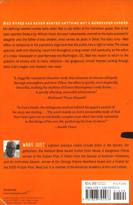"A master American novelist." --Vanity Fair Ned Ayres has never wanted anything but a newspaper career. His defining moment comes early, when Ned is city editor of his hometown paper. One of his beat reporters fields a tip: William Grant, the town haberdasher, married to the bank president's daughter and the father of two children, once served six years in Joliet. The story runs--Ned offers no resistance to his publisher's argument that the public has a right to know. The consequences, swift and shocking, haunt him throughout a long career until eventually, as the editor of a major newspaper in post-Kennedy-era Washington, DC, Ned has reason to return to the question of privacy and its many violations--the gorgeously limned themes running through Ward Just's elegiac and masterly new novel. "A doggedly restrained character study that advances its themes obliquely through atmosphere and tone. Often, the effect is quietly, even elegiacally beautiful, evoking the rhythms of Ernest Hemingway's early fiction . . . A quietly affecting, mournful achievement." -- Richmond Times-Dispatch "In Just's hands, the ambiguous motives behind the paper's pursuit of the story are riveting . . . The novel stands on Just's memorable study of Ned. Your heart goes out to this kindly, complex man who's 'not truly interested in the things of his own life, preferring the lives of others.'" -- Seattle Times