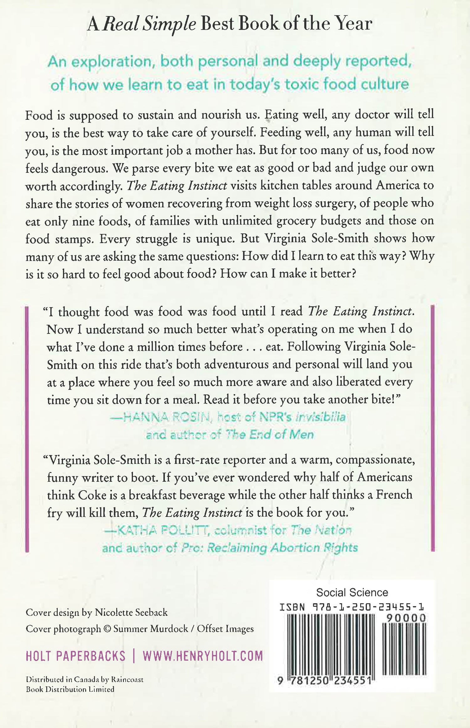 The Eating Instinct visits kitchen tables around America to tell Sole-Smith’s own story, as well as the stories of women recovering from weight loss surgery, of people who eat only nine foods, of families with unlimited grocery budgets and those on food stamps. Every struggle is unique. But Sole-Smith shows how they’re also all products of our modern food culture. And they’re all asking the same questions: How did I learn to eat this way? Why is it so hard to feel good about food? And how can I make it better?