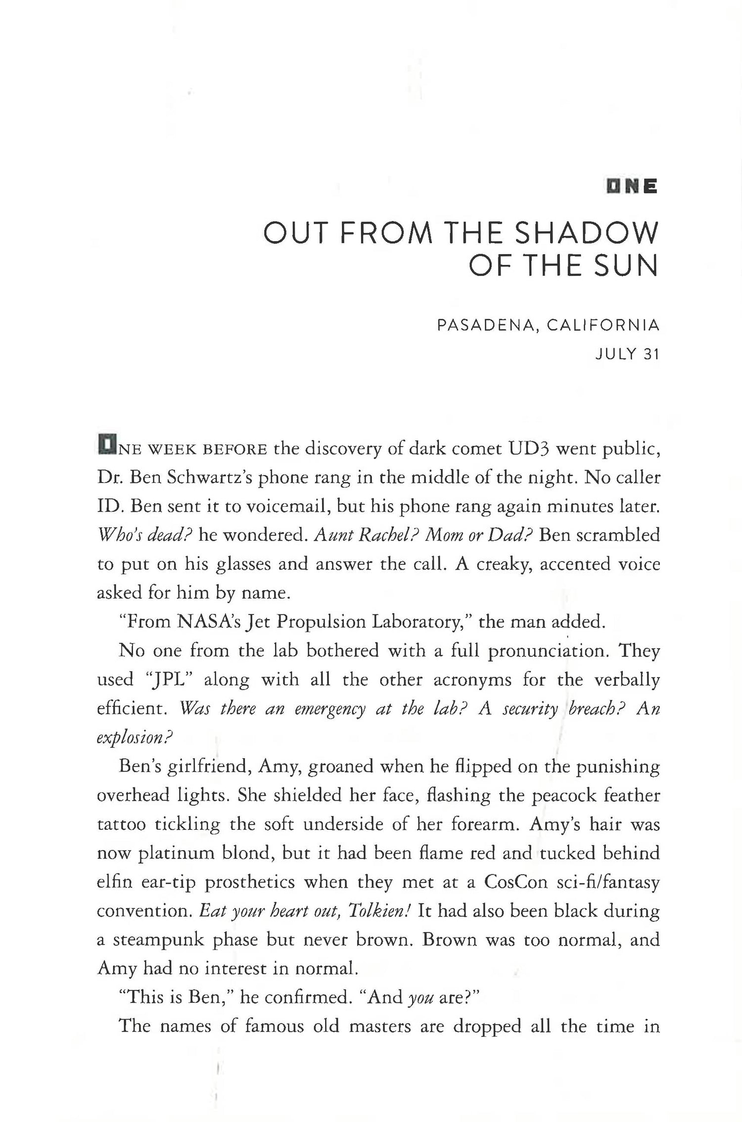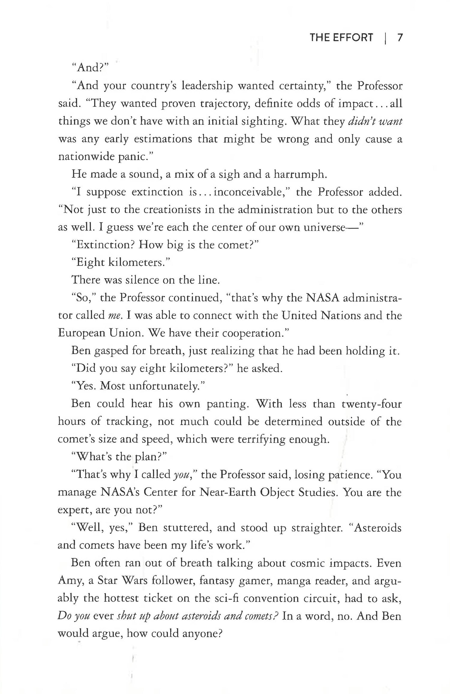 Ben and his indomitable girlfriend Amy Kowalski fly to South America to assemble an international counteraction team, whose notable recruits include Love Mwangi, a UN interpreter and nomad scholar, and Zhen Liu, an extraordinary engineer from China?s national space agency. At the same time, on board a polar icebreaker life continues under the looming shadow of comet UD3. Jack Campbell, a photographer for National Geographic, works to capture the beauty of the Arctic before it is gone forever. Gustavo Wayãpi, a Nobel Laureate poet from Brazil, struggles to accept the recent murder of his beloved twin brother. And Maya Gutiérrez, an impassioned marine biologist is ? quite unexpectedly ? falling in love for the first time.