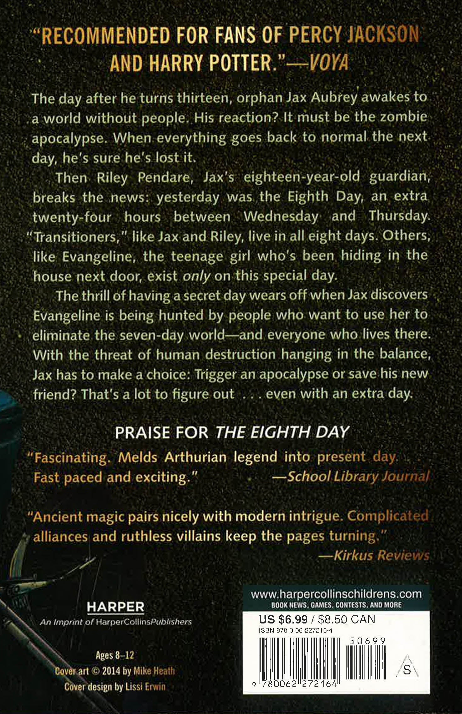 In this riveting fantasy adventure that VOYA called "absolutely necessary for middle grades," thirteen-year-old Jax Aubrey discovers a secret Eighth Day with roots tracing back to Arthurian legend. Fans of Percy Jackson will devour this first book in a new series that combines exciting magic and pulse-pounding suspense. When Jax wakes up to a world without any people, he assumes it's the zombie apocalypse. But when he runs into his eighteen-year-old guardian, Riley Pendare, he learns that he's really in the Eighth Day--an extra day sandwiched between Wednesday and Thursday. Some people--like Jax and Riley--are Transitioners, able to live in all eight days, while others, including Evangeline, the elusive teenage girl who's been hiding in the house next door, exist only on this special day. There's a reason Evangeline's hiding. As the descendant of the powerful wizard Merlin, her magic is highly sought by corrupt Transitioners who want to use her to destroy the seven-day world. Torn between protecting his new friend and saving the human race from destruction, Jax is faced with an impossible choice. Even with an eighth day, time is running out. Be sure to check out The Inquisitor's Mark, the spellbinding second novel in the Eighth Day series.