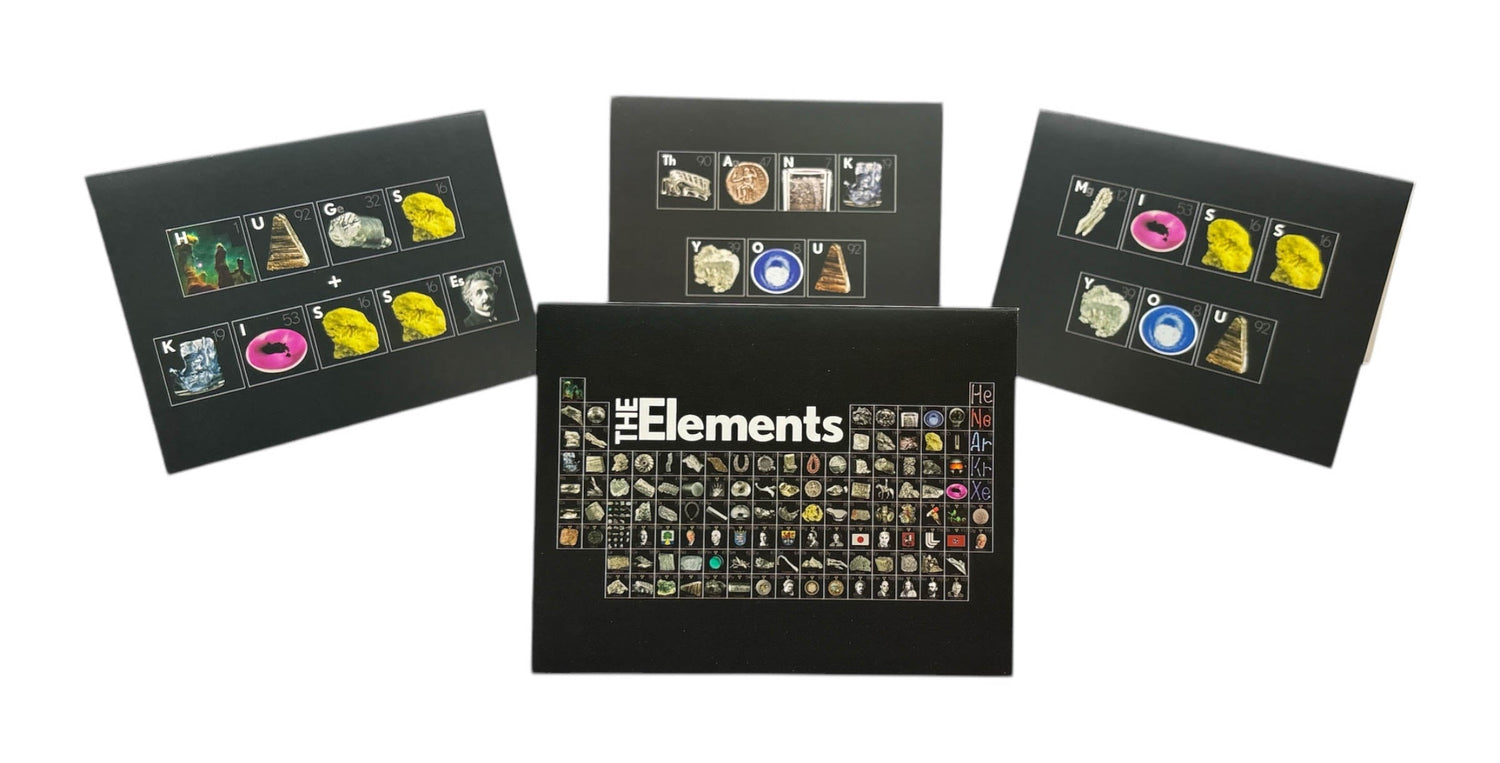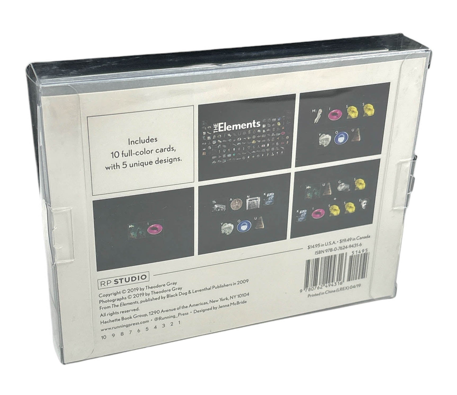 Based on Theodore Gray's bestselling book The Elements, this unique set of notecards features 5 different designs that spell out messages-like "Hi!" and "Hugs + Kisses" using the elements of the periodic table. The same message is also printed on the inside of the card.