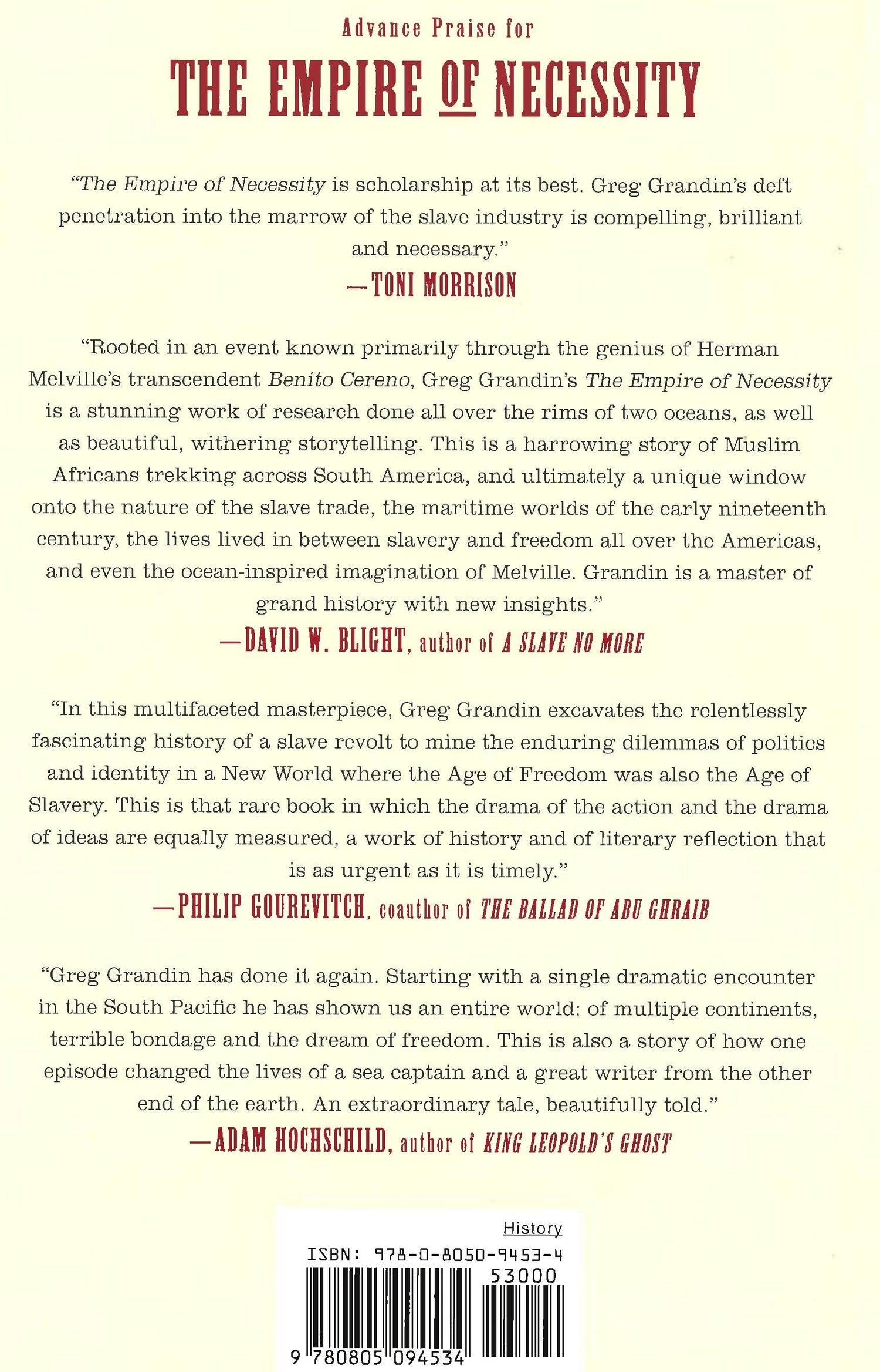 One morning in 1805, off a remote island in the South Pacific, Captain Amasa Delano, a New England seal hunter, climbed aboard a distressed Spanish ship carrying scores of West Africans he thought were slaves. They weren't. Having earlier seized control of the vessel and slaughtered most of the crew, they were staging an elaborate ruse, acting as if they were humble servants. When Delano, an idealistic, anti-slavery republican, finally realized the deception, he responded with explosive violence. Drawing on research on four continents, The Empire of Necessity explores the multiple forces that culminated in this extraordinary event - an event that already inspired Herman Melville's masterpiece Benito Cereno. Now historian Greg Grandin, with the gripping storytelling that was praised in Fordlandia, uses the dramatic happenings of that day to map a new transnational history of slavery in the Americas, capturing the clash of peoples, economies, and faiths that was the New World in the early 1800s.