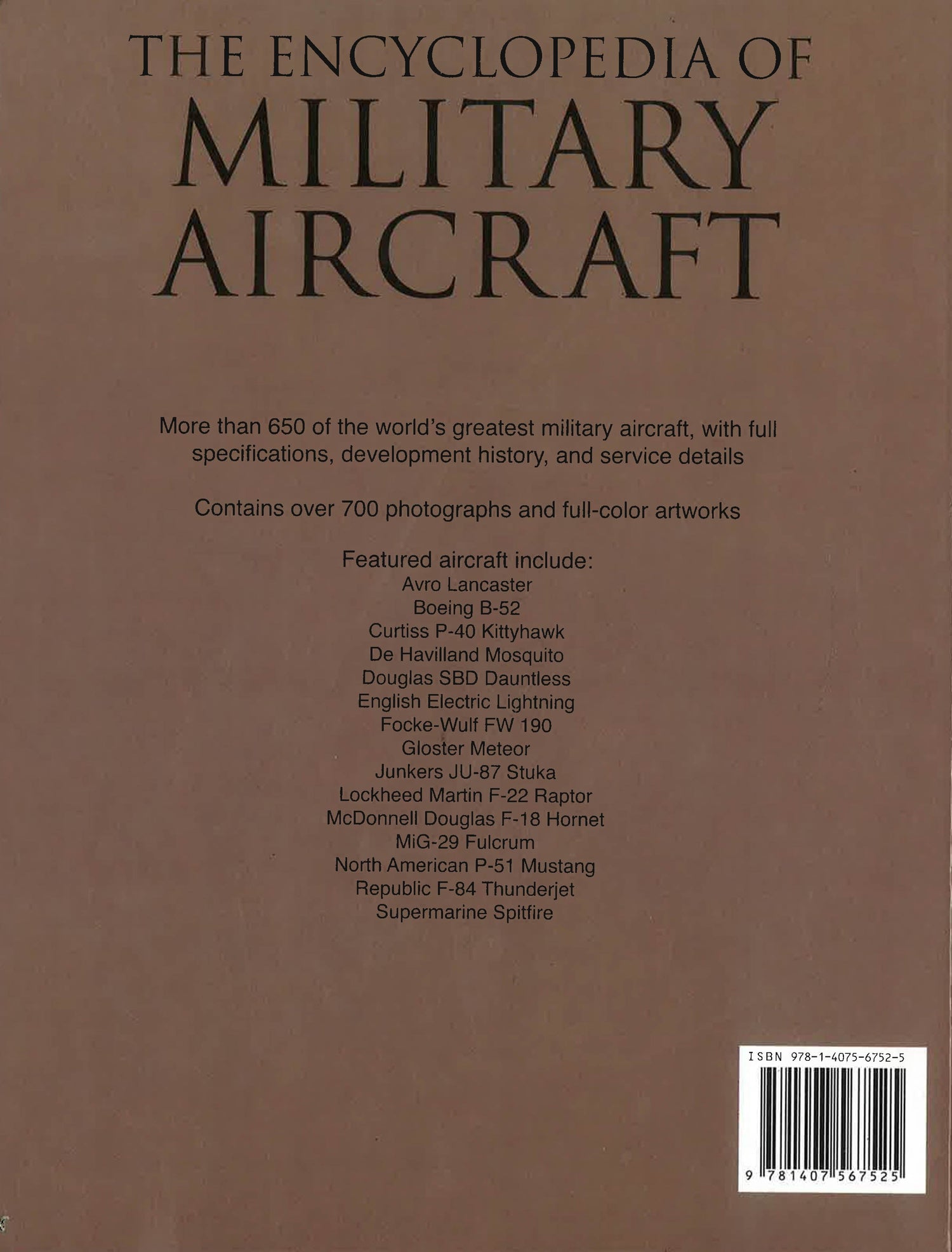 From the Publisher More than 650 of the world's greatest military aircraft, with fill specifications, development history, and service details. Contains over 700 photographs and full-color artworks. Featured aircraft include: Avro Lancaster Boeing B-52 Curtiss P-40 Kittyhawk De Havilland Mosquito Douglas SBD Dauntless English Electric Lightning Focke-Wulf FW 190 Gloster Meteor Junkers JU-87 Stuka Lockheed Martin F-22 Raptor McDonnell Douglas F-18 Hornet MiG-29 Fulcrum North American P-51 Mustang Republic F-84 Thunderjet Supermarine Spitfire