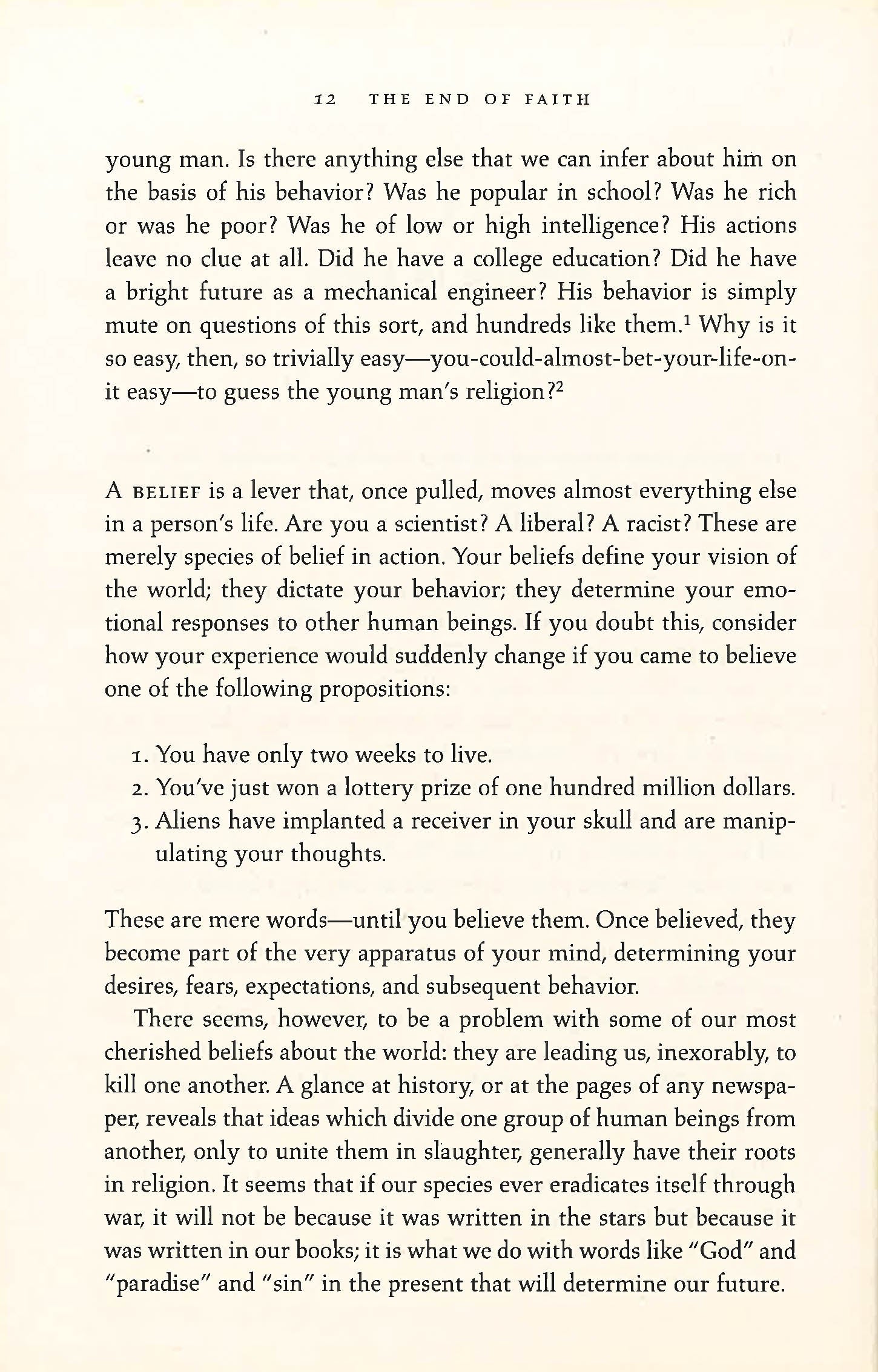 In The End of Faith, Sam Harris delivers a startling analysis of the clash between reason and religion in the modern world. He offers a vivid, historical tour of our willingness to suspend reason in favor of religious beliefs?even when these beliefs inspire the worst human atrocities. While warning against the encroachment of organized religion into world politics, Harris draws on insights from neuroscience, philosophy, and Eastern mysticism to deliver a call for a truly modern foundation for ethics and spirituality that is both secular and humanistic.
