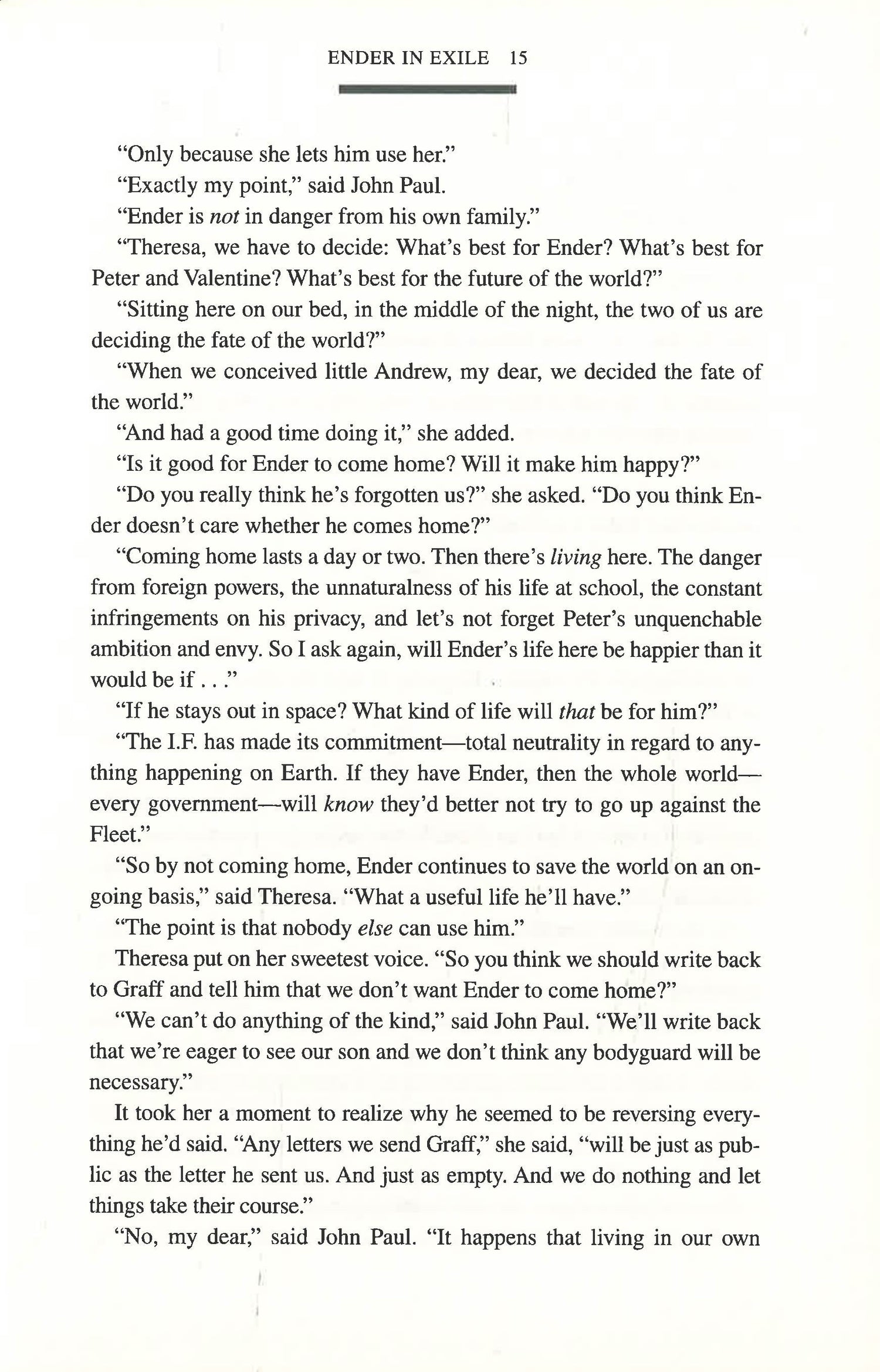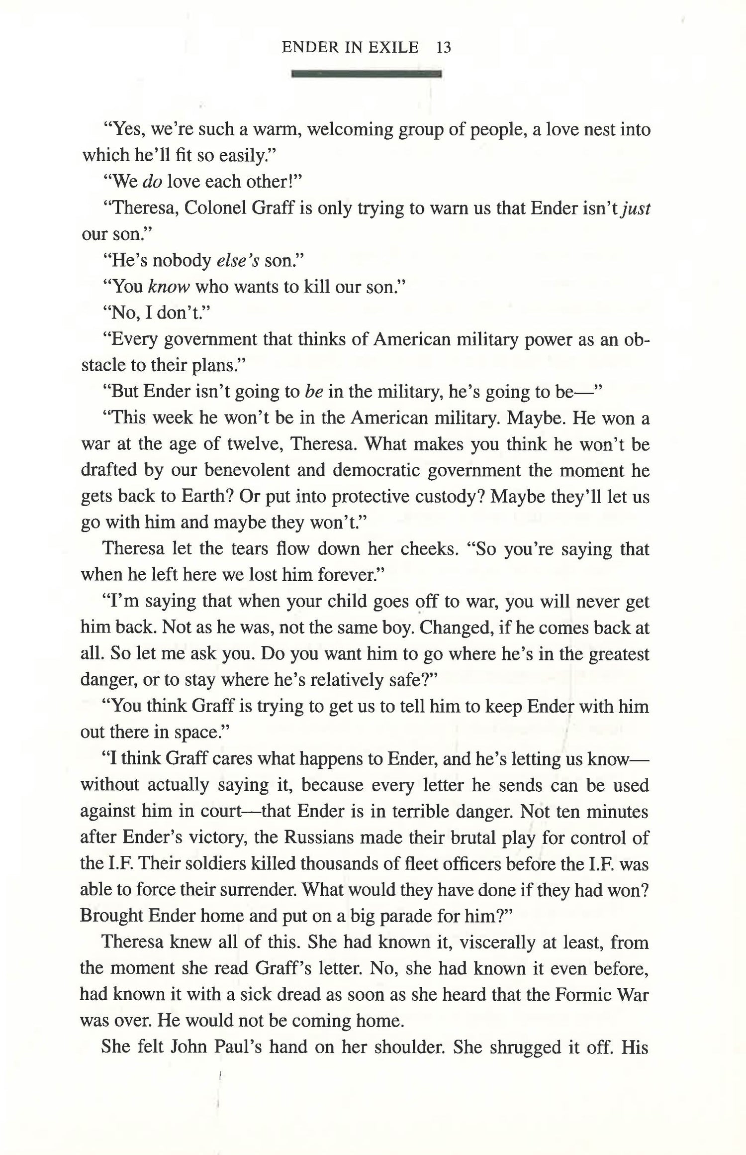 For twenty-three years, millions of readers have wondered and now they will receive the answers. Ender in Exile is Orson Scott Card's moving return to all the action and the adventure, the profound exploration of war and society, and the characters one never forgot.
