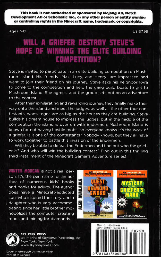 Age range 7 to 12In this third installment of the Minecraft Gamer's Adventure series, Steve is invited to participate in an elite building competition on Mushroom Island. His friends-Max, Lucy, and Henry-are impressed and want to join their friend on a journey to the island. Yet not everyone is happy: Steve's neighbor Kyra is upset because she wasn't chosen as a contestant. Steve asks Kyra to come to the competition and help the gang build boats to get to Mushroom Island. She agrees, and the group sets out on an adventure to the contest. Getting there is half the fun, and the group treks through the jungle, where they find a rare temple filled with treasure! But getting the treasure isn't easy, and they have to fight fierce battles to continue their journey. After their exhilarating and rewarding journey to the contest, they finally make their way onto the island and meet the judges, as well as the other four contestants, whose egos are as big as the houses they are building. Steve builds his dream house to impress the judges, but just as they begin judging, the island is overrun with Endermen. Mushroom islands are known for not having hostile mobs, so everyone knows it's the work of a griefer. Is it one of the contestants? Nobody knows, but they all have to work together to battle this invasion of the Endermen. Will they be able to defeat the Endermen and find out who the griefer is? And who will win the building contest? Find out in this thrilling third installment of the Minecraft Gamer's Adventure series!