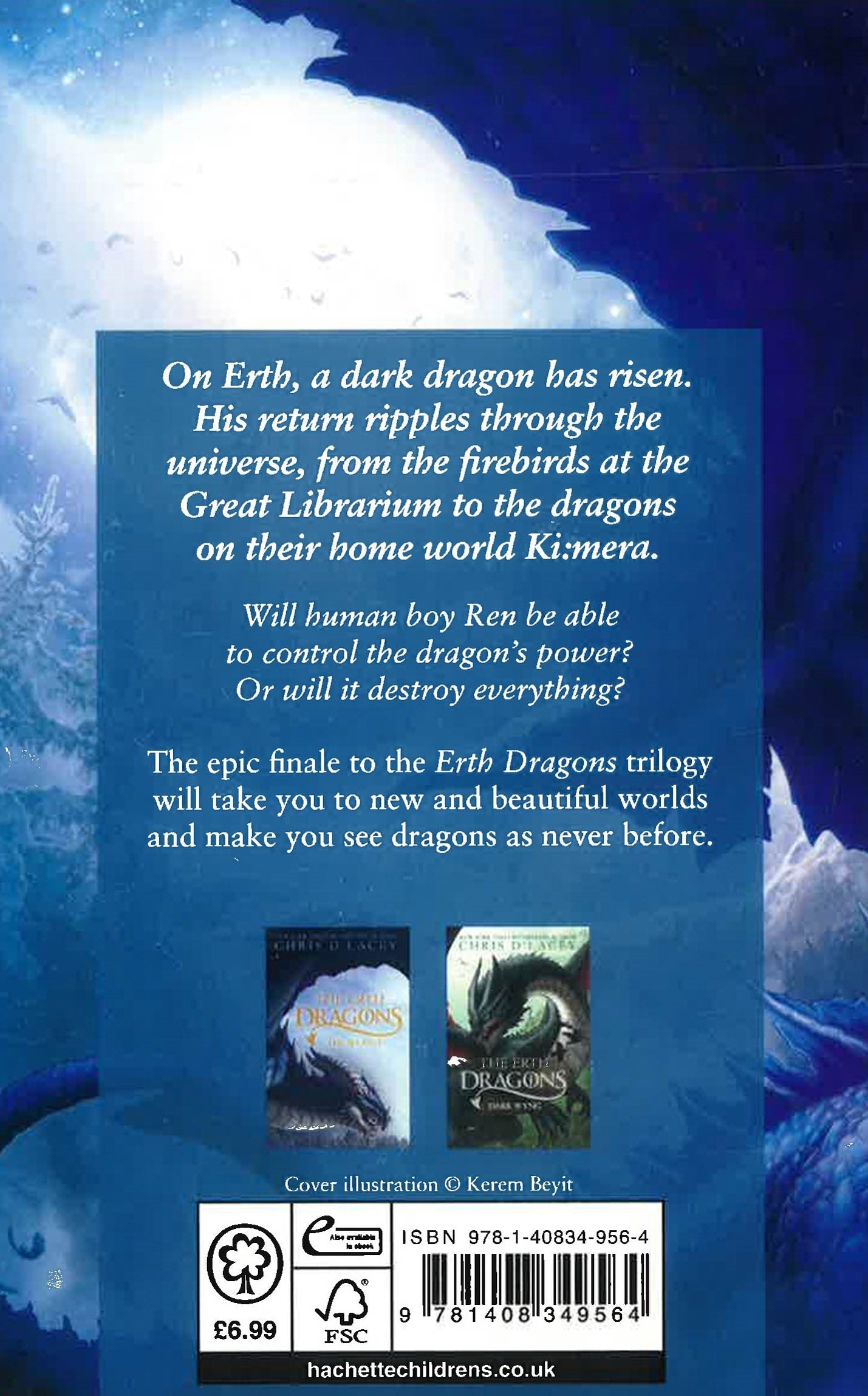 The epic finale to the Erth Dragons trilogy will take you to new and beautiful worlds and make you see dragons as never before. The third in the stunning new fantasy series from the New York Times bestselling author, Chris d'Lacey.On Erth, a dark dragon has risen. His return ripples throughout the universe, from the firebirds at the Great Librarium to the dragons on the home world K:imera.Will human boy Ren be able to control the dragon's power? Or will it destroy everything?The epic finale to the Erth Dragons trilogy will take you to new and beautiful worlds and make you see dragons as never before.