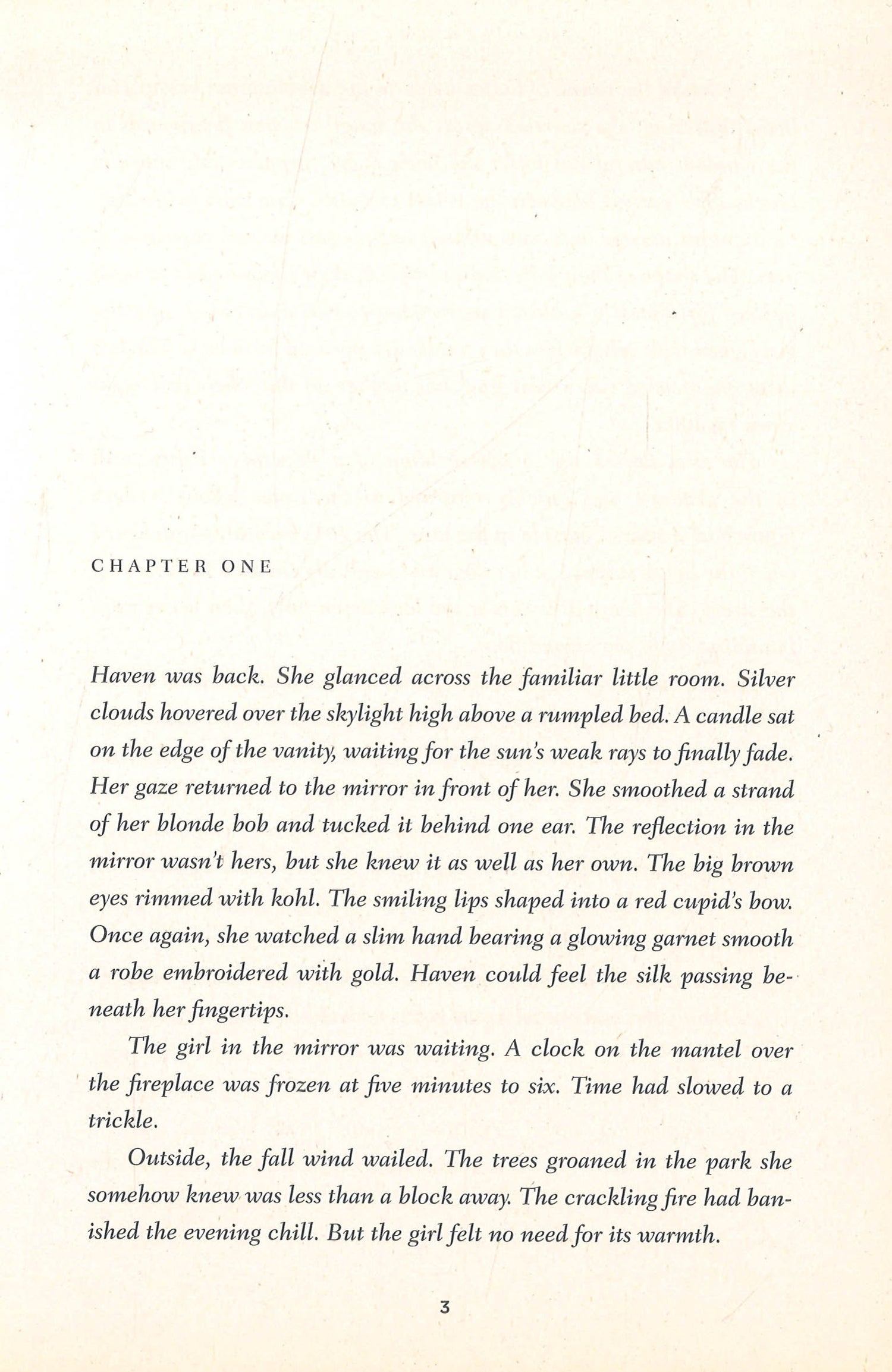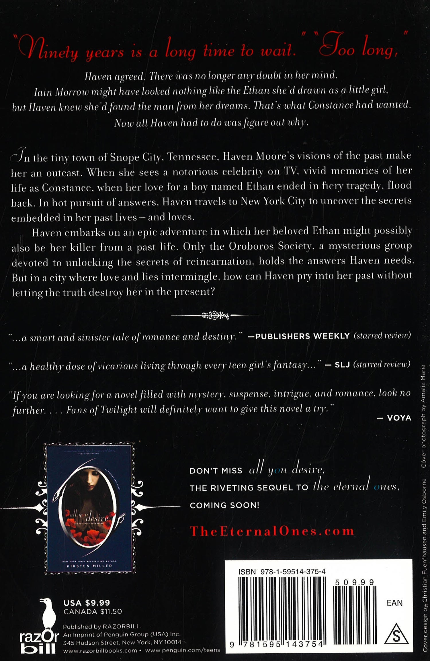 Haven Moore has always lived in the town of Snope City, Tennessee. But for as long as she can remember, Haven has experienced visions of a past life as a girl named Constance, whose love for a boy called Ethan ended in fiery tragedy. One day, the sight of notorious playboy Iain Morrow on television brings Haven to her knees. Haven flees to New York City to find Iain and there, she is swept up in an epic love affair that feels both deeply fated and terribly dangerous. Is Iain her beloved Ethan? Or is he her murderer from a past life? Haven asks the members of the powerful and mysterious Ouroboros Society to help her unlock the mysteries of reincarnation and discover the secrets hidden in her past lives, and loves, before all is lost and the cycle begins again. But what is the Ouroboros Society? And how can Haven know whom to trust?