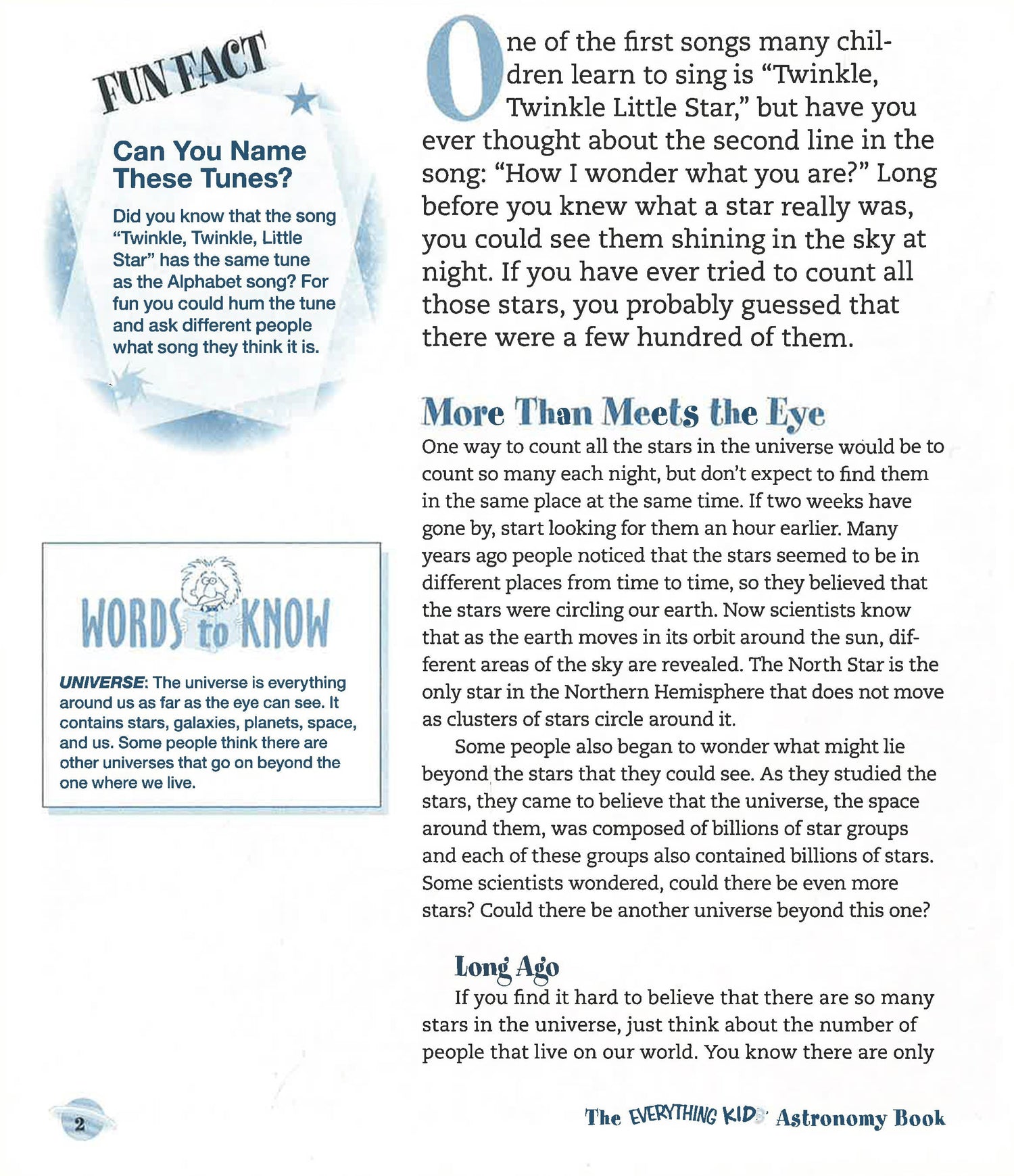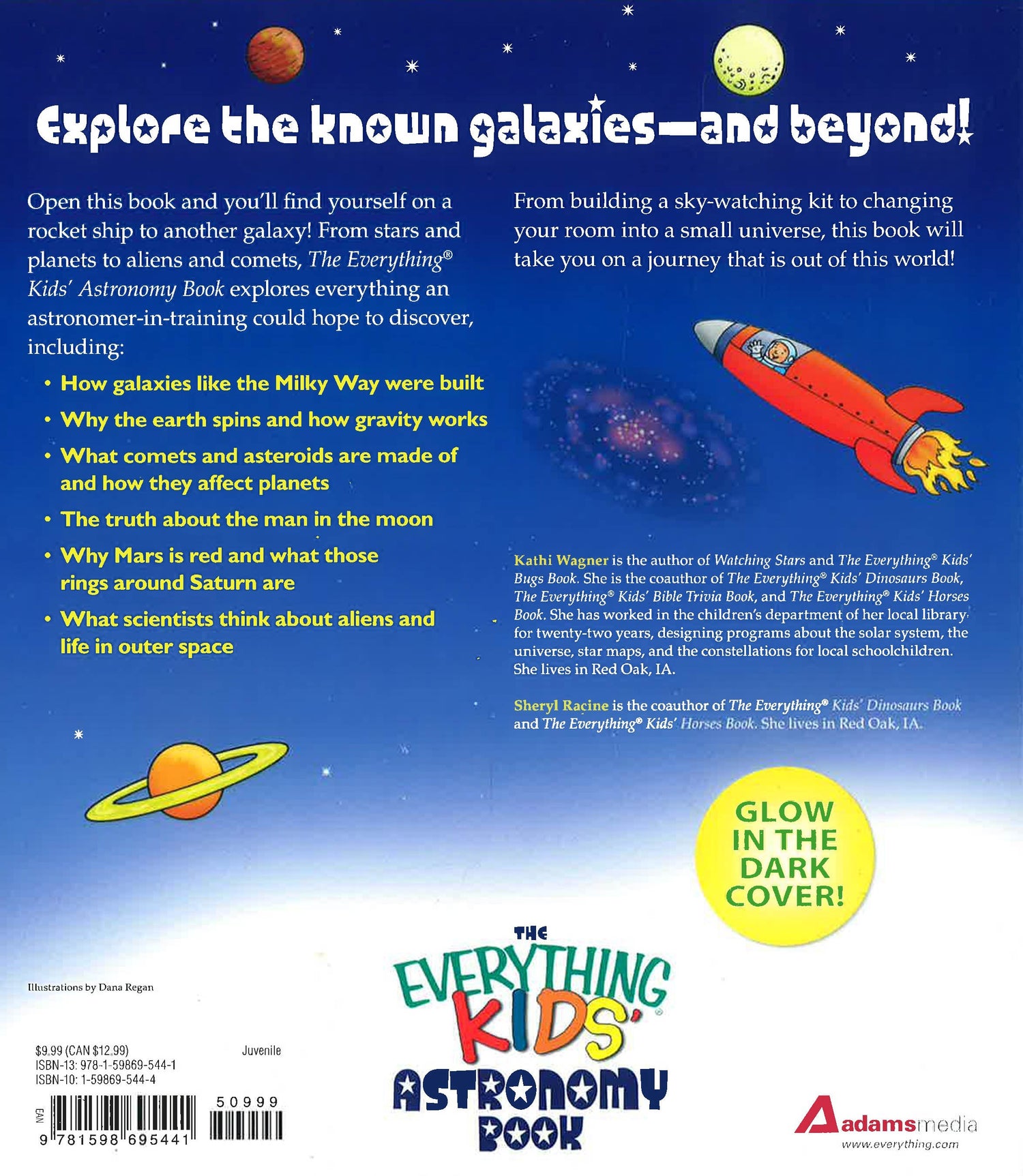 Explore the galaxies!Aliens, space ships, and constellations, oh my! Ride on a rocket ship to another galaxy with this stellar book. With The Everything Kids' Astronomy Book, astronomers-in-training will learn:How galaxies like the Milky Way were built.Why the sun's surface is 20,000-50,000-degrees Fahrenheit.Why the earth spins and how gravity works.What comets and asteroids are made of and how they affect planets.The truth about the man in the moon.Why Mars is so hot and what those rings around Saturn are.What scientists think about aliens and life in outer spaceIf you want to build a sky-watching kit or change your room into a small universe, this book will take you on a journey that is out-of-this-world!