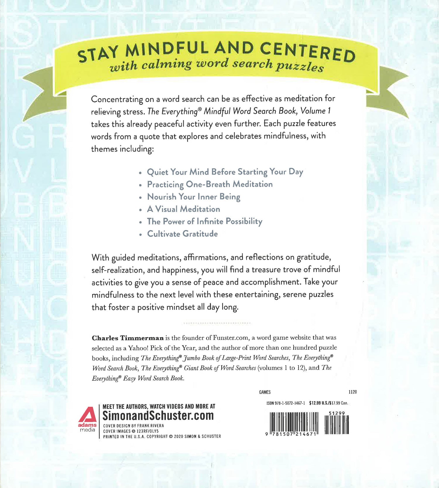 Enjoy the calming, satisfying task of solving word search puzzles while staying mindful and centered with these meaningful word lists derived from a quote, meditation, or affirmation designed to help you stay present.Concentrating on a word search can be as effective as meditation for relieving stress. The Everything Mindful Word Search Book, Volume 1 takes this already peaceful activity even further. Each puzzle features words from a quote that explores and celebrates mindfulness. With guided meditations, positive affirmations, and reflections on gratitude, self-realization, and happiness, you will find a treasure trove of positive, mindful activities that give you a sense of peace and accomplishment. Take your mindfulness to the next level with these entertaining, serene puzzles that foster a positive mindset all day long.