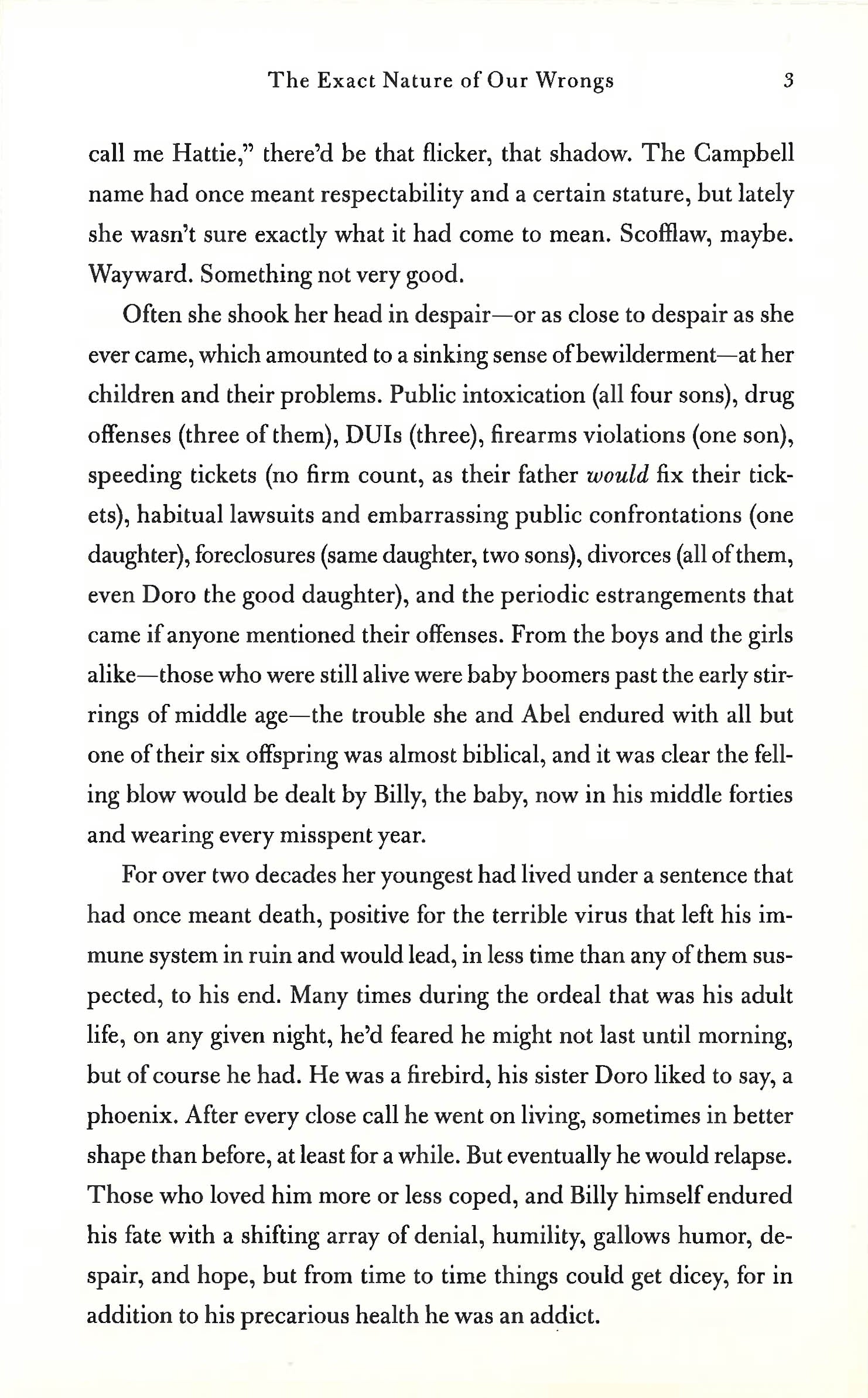 Billy's misadventures have too long consumed their lives, in particular Hattie's, who has enabled his transgressions while trying to save him from Abel's disappointment. As the older children - Doro, Jesse, ClairBell, and Gideon - contend with their own failures, they compete for the approval of the elderly parents they adore, but can't quite forgive.