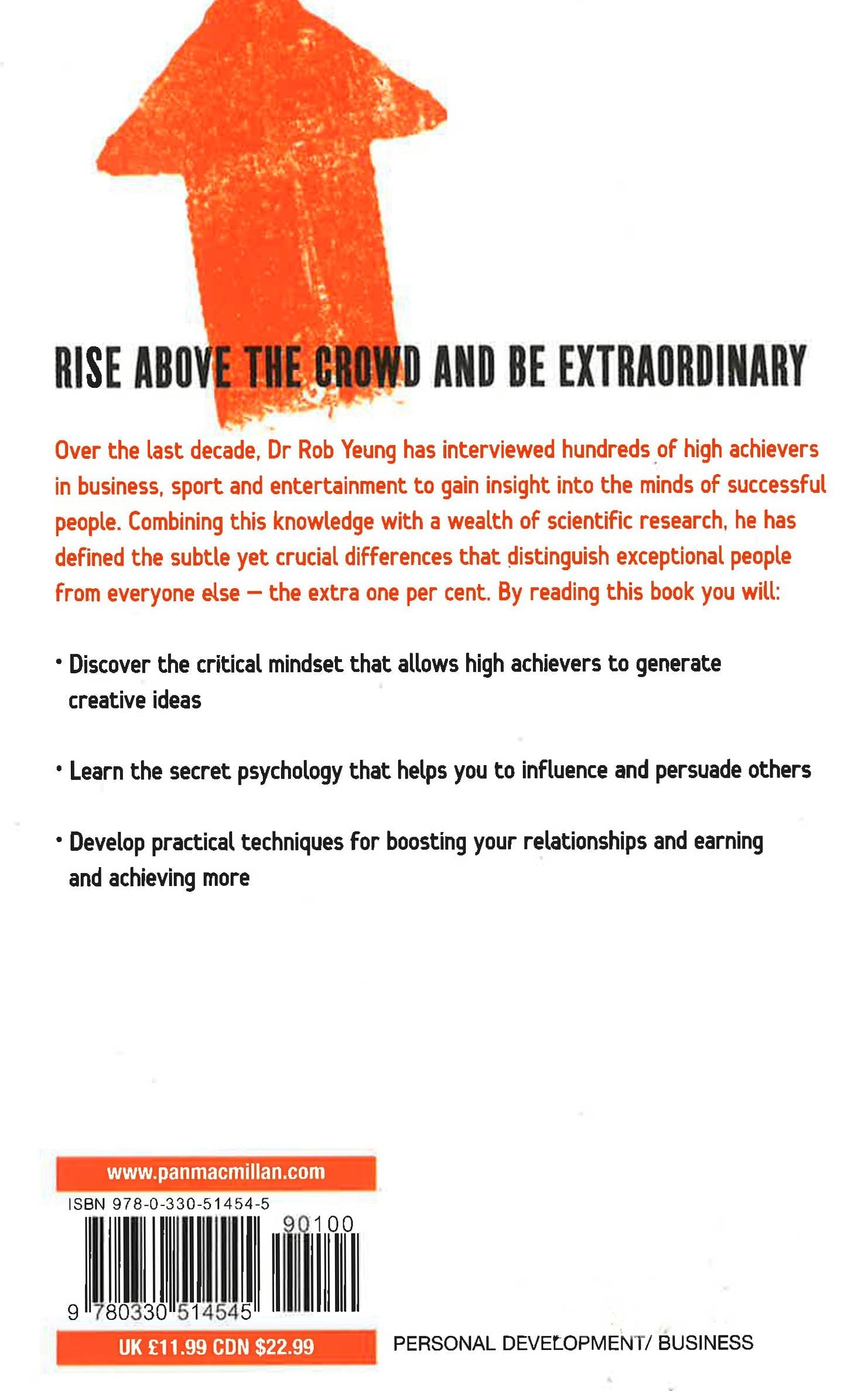 There are times when we all need a bit of a push to help us reach the top. Discover what makes up the 'extra one per cent' that distinguishes exceptional people from everyone else - and how you can make these subtle yet crucial differences work for you too. In this book, leading psychologist and coach Dr Rob Yeung draws upon a wealth of scientific research and shares revelations from his work with entrepreneurs, business leaders, world-class sports people and celebrities. Discover what these successful people do differently and find out how you too can reach outstanding levels of success by tapping into the psychology of high achievers by discovering the eight capabilities they possess that can make all the difference. In The Extra One Per Cent, Rob Yeung will show you how you too can achieve your full potential and discover how to make these strategies work for you. You will find out how to make real and lasting changes in your life and take yourself to the next level.