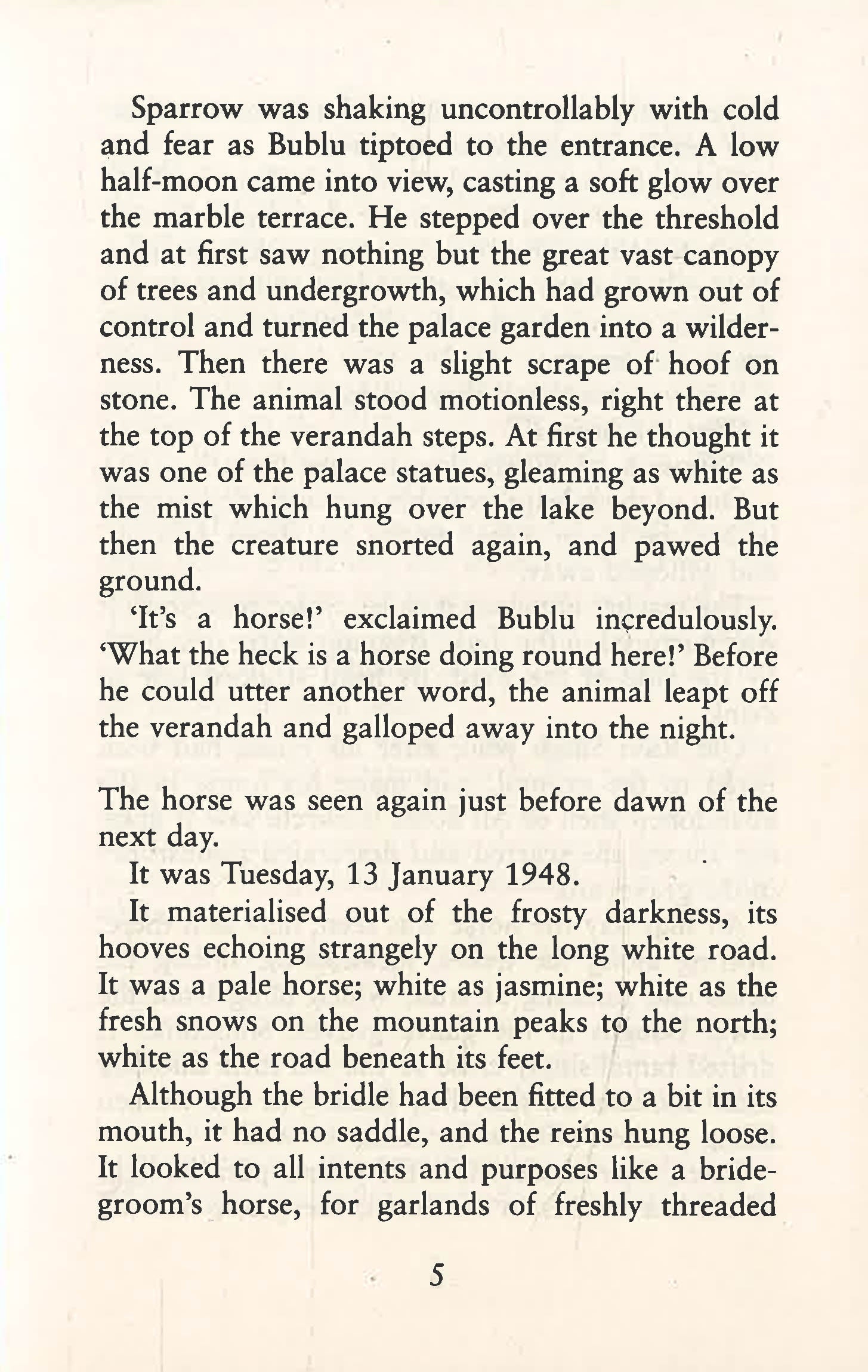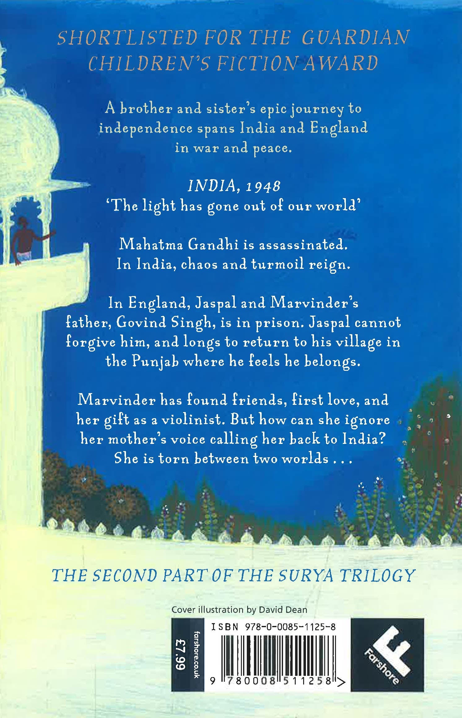 India 1948. “The light has gone out of our world.… Mahatma Gandhi is assassinated. In India, chaos and turmoil reign. In England, Jaspal and Marvinder’s father is in prison. Jaspal cannot forgive him, and longs to return to his village in the Punjab where he feels he belongs. Marvinder has found friends, her first love, and her gift as a violinist. But how can she ignore her mother’s voice calling her back to India? She is torn between two worlds.