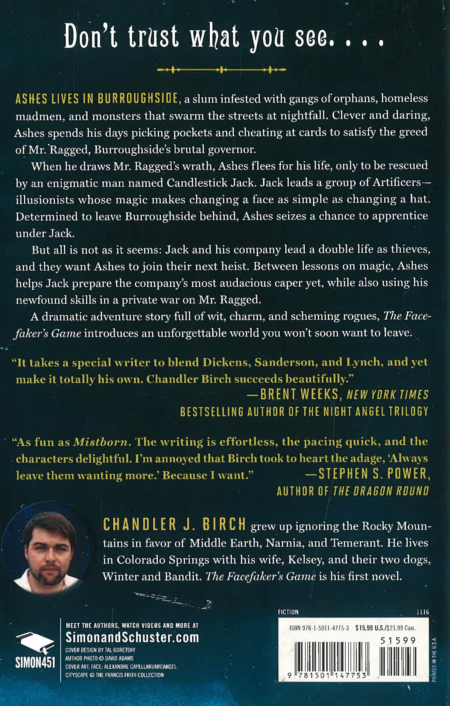 Jack leads a group of Artificers, professional magicians who can manipulate light with their bare hands to create stunningly convincing illusions. Changing a face is as simple as changing a hat. Ashes seizes an opportunity to study magic under Jack and quickly befriends the rest of the company: Juliana, Jack's aristocratic wife; William, his exacting business partner; and Synder, his genius apprentice. But all is not as it seems: Jack and his company lead a double life as thieves, and they want Ashes to join their next heist. Between lessons on light and illusion, Ashes begins preparing to help with Jack's most audacious caper yet: robbing the richest and most ruthless nobleman in the city.