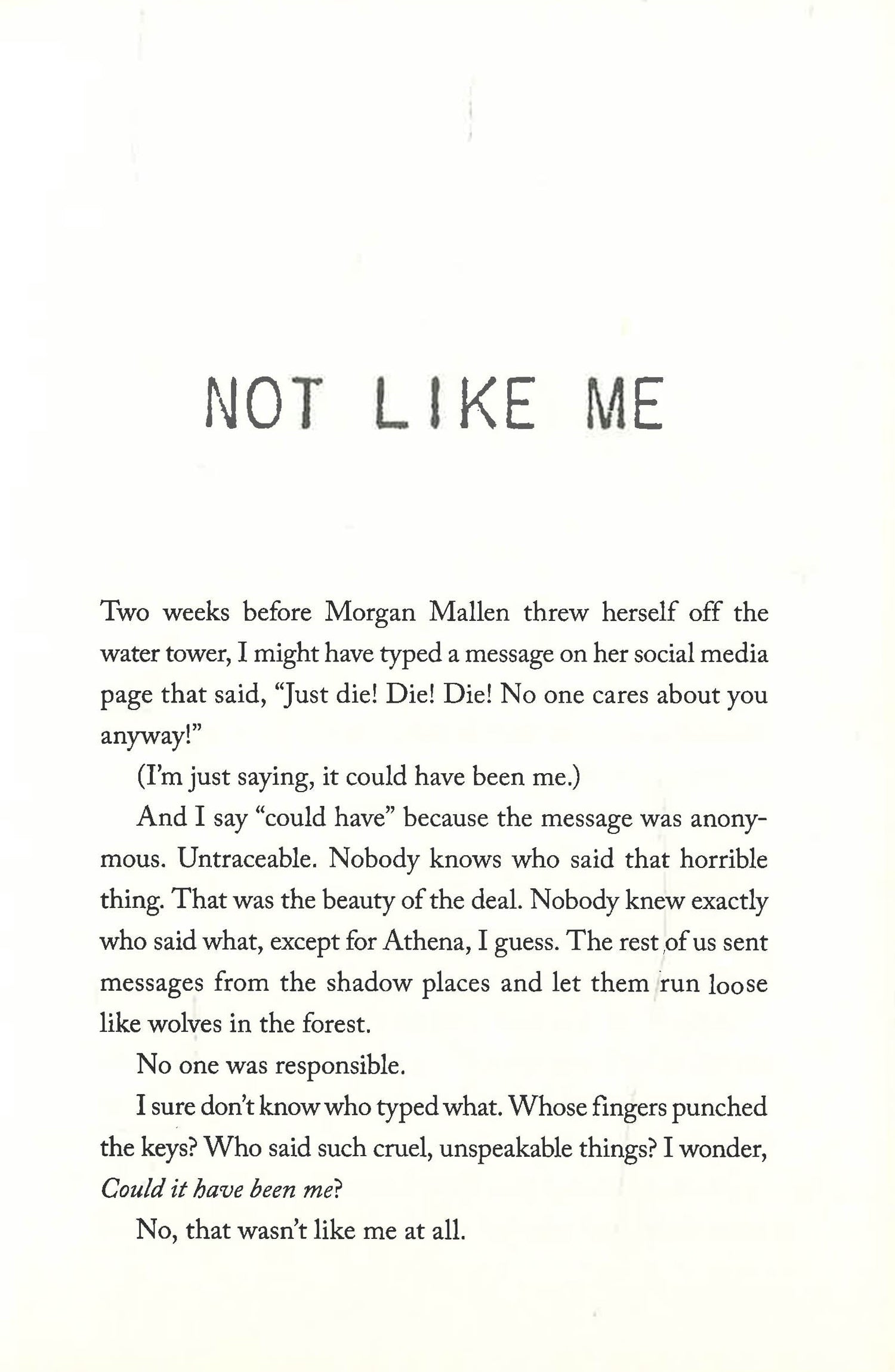 From James Preller, the author of Bystander, another unflinching book about bullying and its fallout. The summer before school starts, Sam's friend and classmate Morgan Mallen kills herself. Morgan had been bullied. Maybe she kissed the wrong boy. Or said the wrong thing. What about that selfie that made the rounds? Morgan was this, and Morgan was that. But who really knows what happened?As Sam explores the events leading up to the tragedy, he must face a difficult and life-changing question: Why did he keep his friendship with Morgan a secret? And could he have done something - anything - to prevent her final actions?