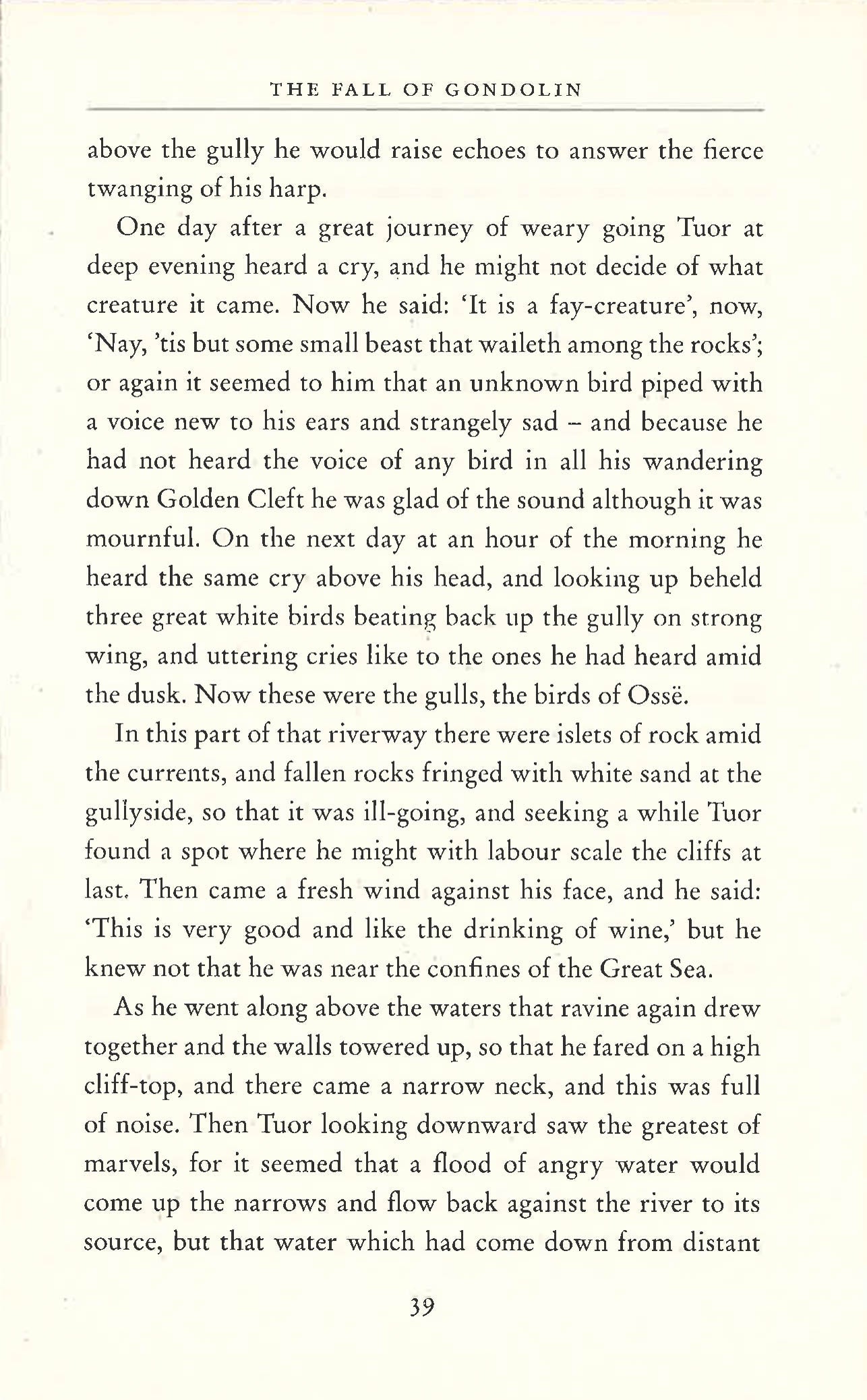 Into this world comes Tuor, cousin of Túrin, the instrument of Ulmo’s designs. Guided unseen by him Tuor sets out from the land of his birth on the fearful journey to Gondolin, and in one of the most arresting moments in the history of Middle-earth the sea-god himself appears to him, rising out of the ocean in the midst of a storm. In Gondolin he becomes great; he is wedded to Idril, Turgon’s daughter, and their son is Eärendel, whose birth and profound importance in days to come is foreseen by Ulmo.
