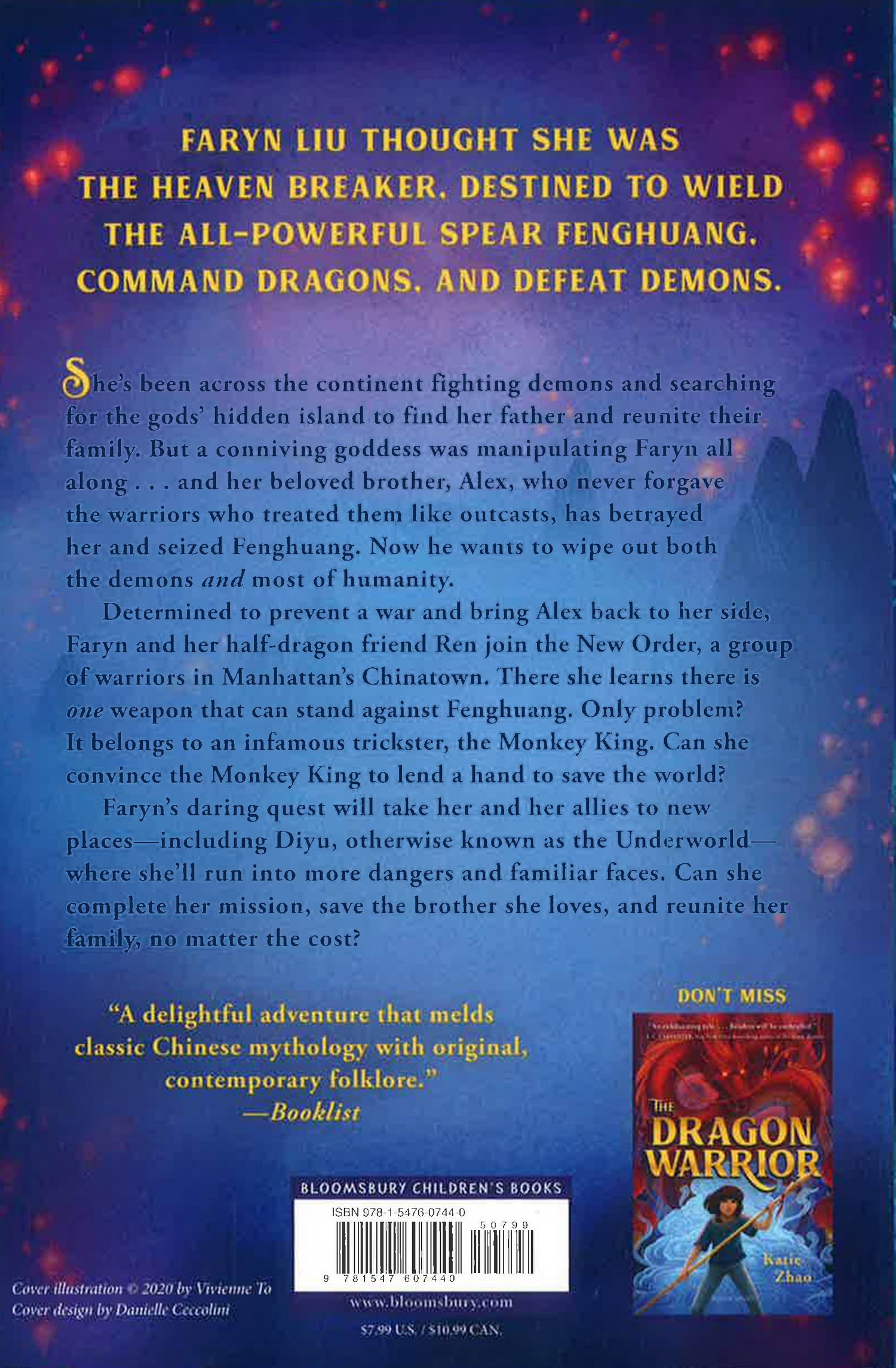 Faryn Liu thought she was the Heaven Breaker, a warrior destined to wield the all-powerful spear Fenghuang, command dragons, and defeat demons. But a conniving goddess was manipulating her all along . . . and her beloved younger brother, Alex, has betrayed her and taken over as the Heaven Breaker instead. Alex never forgave the people who treated him and Faryn like outcasts, and now he wants to wipe out both the demons and most of humanity. Determined to prevent a war and bring Alex back to her side, Faryn and her half-dragon friend Ren join the New Order, a group of warriors based out of Manhattan's Chinatown. She learns that one weapon can stand against Fenghuang--the Ruyi Jingu Bang. Only problem? It belongs to an infamous trickster, the Monkey King. Faryn sets off on a daring quest to convince the Monkey King to join forces with her, one that will take her to new places--including Diyu, otherwise known as the underworld--where she'll run into new dangers and more than one familiar face. Can she complete her mission and save the brother she loves, no matter the cost? This richly woven middle-grade fantasy series, full of humor, magic, and heart, will appeal to readers who love Roshani Chokshi and Sayantani DasGupta.