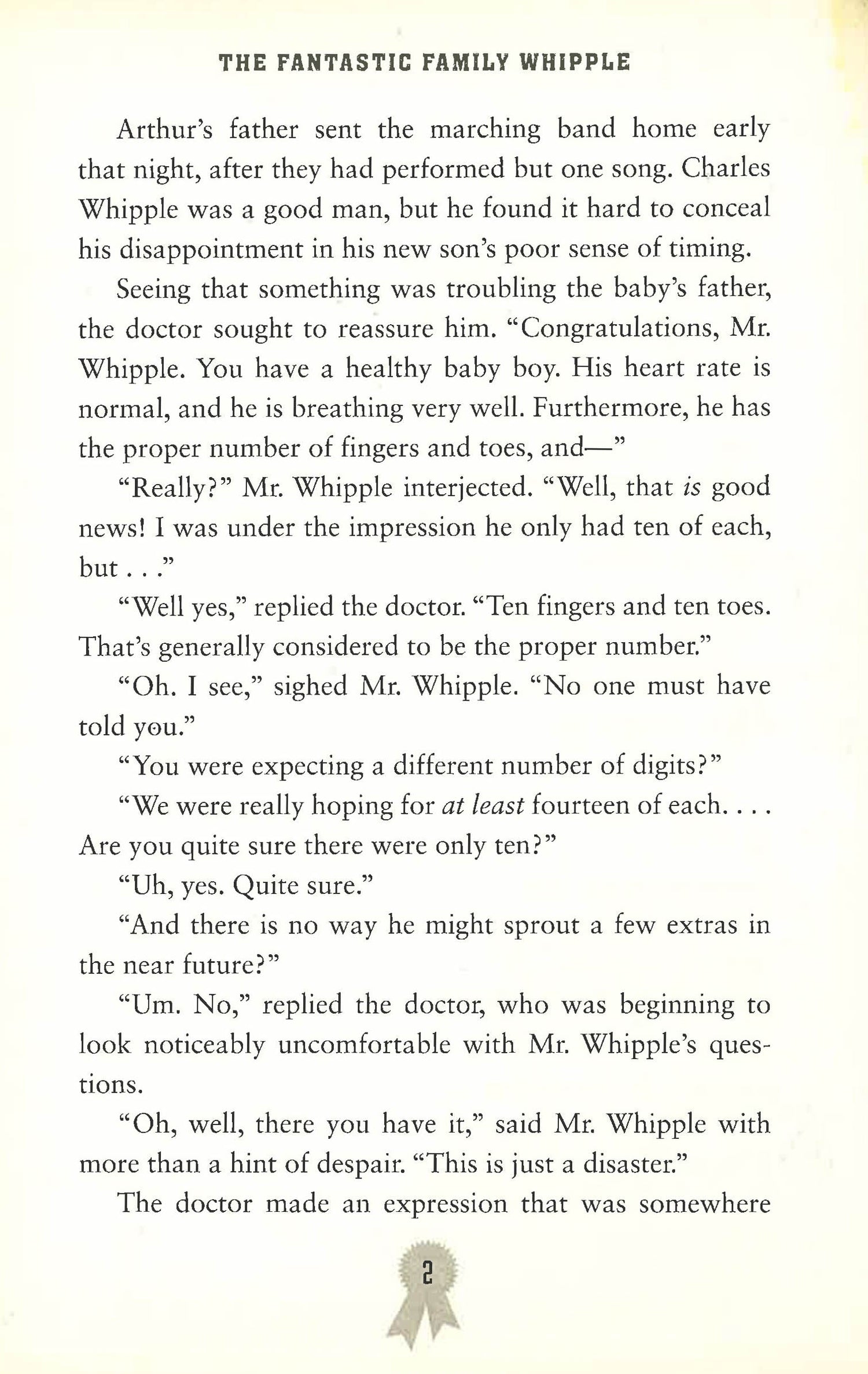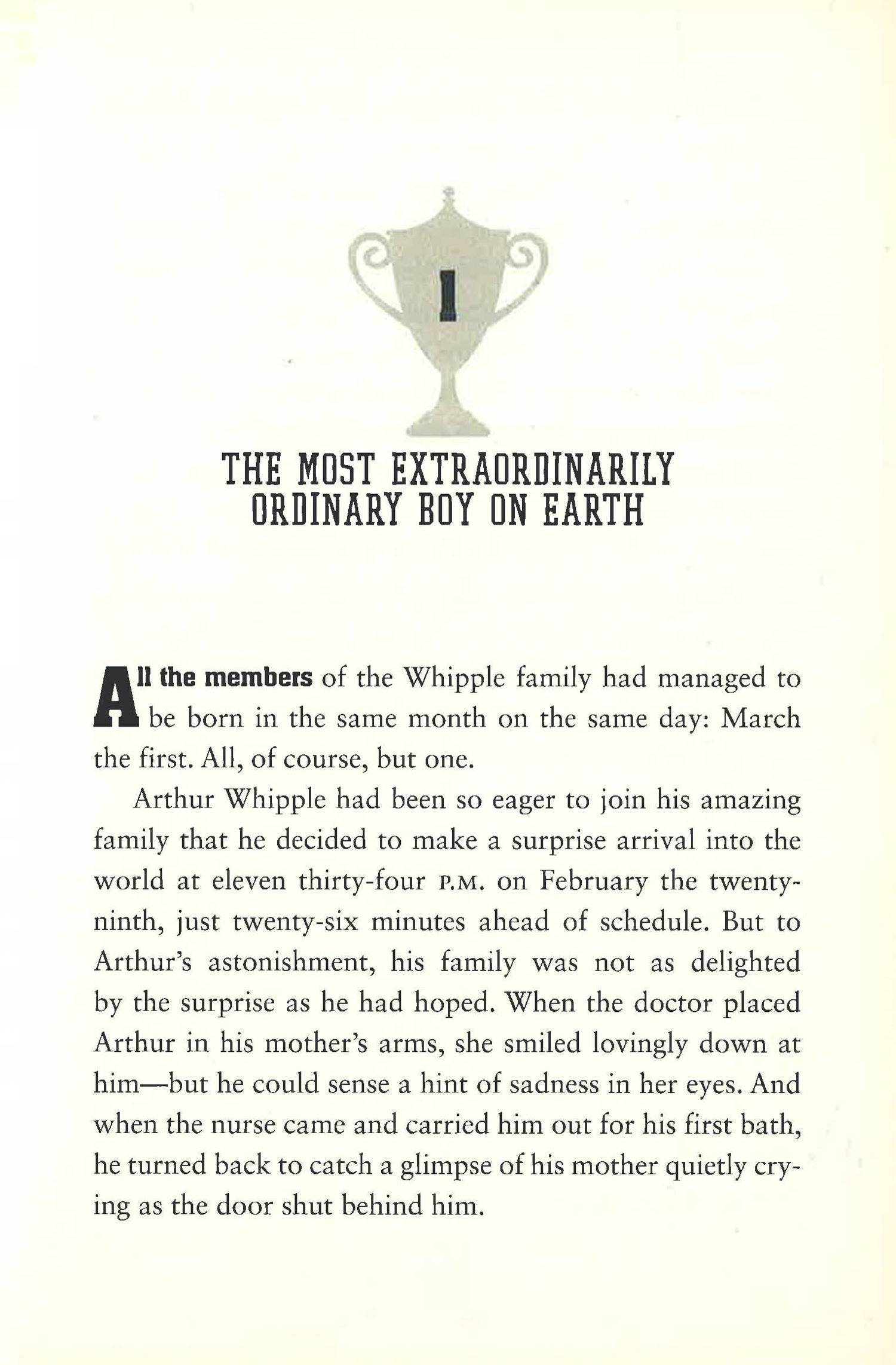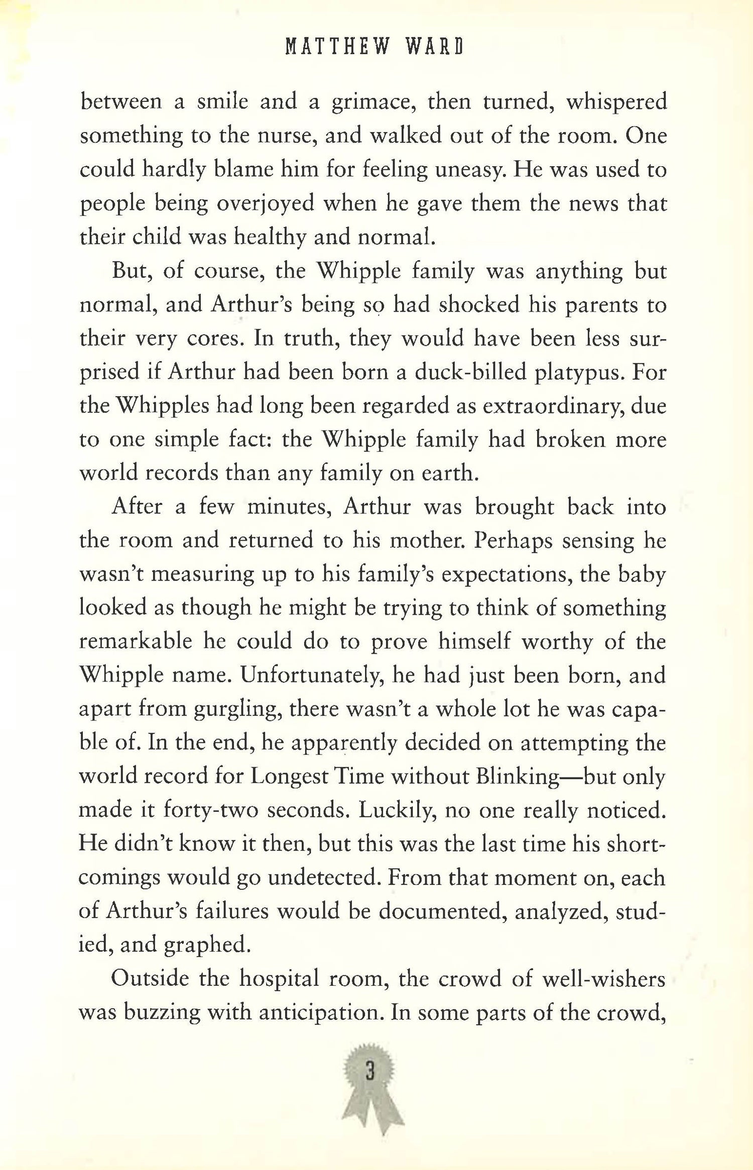 For every child who's ever dreamed of being in the "Guinness Book of World Records" comes the story of eleven-year-old Arthur Whipple and his fantastic family of world record breakers . . . - Most Creme Brulee Eaten in One Minute - Highest Number of Matching Outfits Worn by a Stuffed Toy and Its Owner - Youngest Person to Summit the Third-Highest Mountain in the World These are just three of the 49,521 records won by Arthur's twelve brothers and sisters. Unfortunately, unlike his siblings, Arthur hasn't broken a single, solitary world record! But when the Whipples suffer a spate of catastrophes and a curious amount of attention from a pair of irregularly sized and unusually menacing clowns, Arthur might be the only one who can save his family from losing their collective crown . . . or worse.