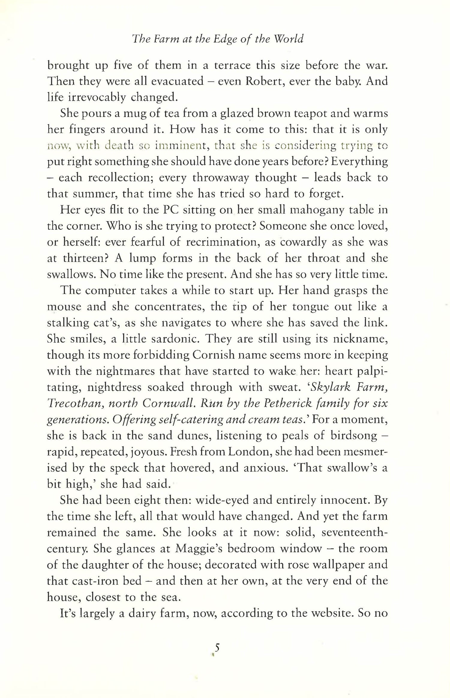 1939, and Will and Alice are evacuated to a granite farm in north Cornwall, perched on a windswept cliff. There they meet the farmer's daughter, Maggie, and against fields of shimmering barley and a sky that stretches forever, enjoy a childhood largely protected from the ravages of war.