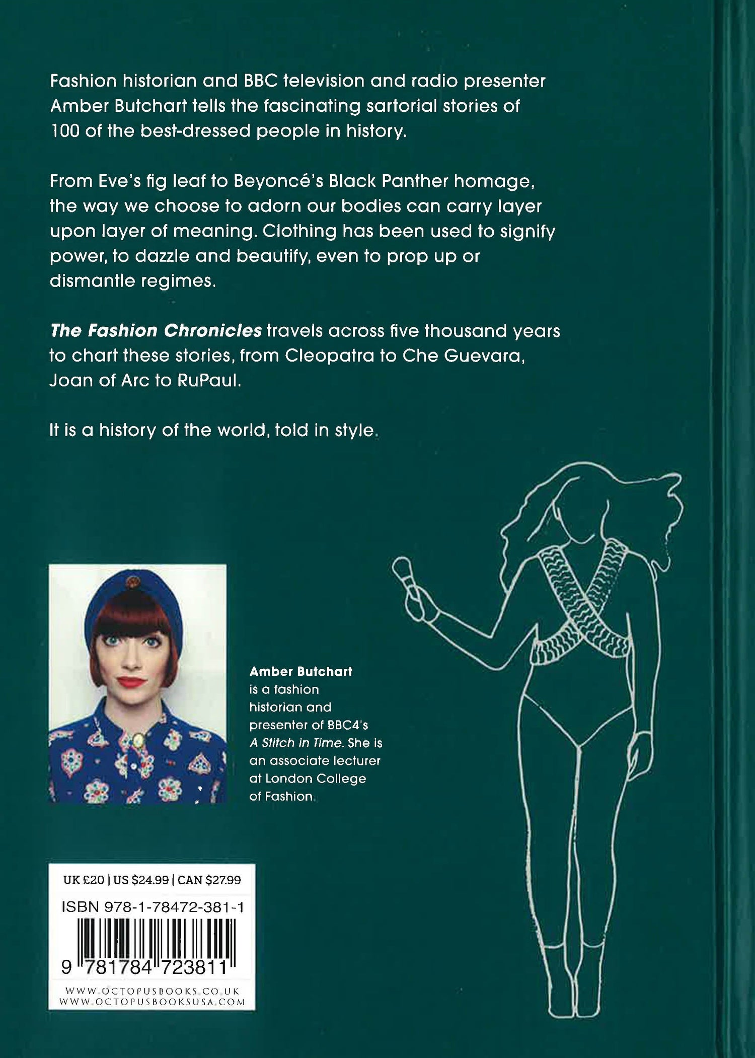 From BBC television and radio presenter Amber Butchart, The Fashion Chronicles is an exploration of 100 of the most fascinating style stories ever told.From Eve's fig leaf to Hilary Clinton's pantsuit, the way we choose to clothe our bodies can carry layer upon layer of meaning. Across cultures and throughout history people have used clothing to signify power and status, to adorn and beautify, even to prop up or dismantle regimes.Here, explore the best-dressed figures in history, from Cleopatra to Beyonce, Joan of Arc to RuPaul. Some have influenced the fashion of today, while some have used their clothing to change the world. But all have a sartorial story to tell. Entries include:TutankhamunBoudiccaEleanor of AcquitaneGenghis KhanKing Philip II of SpainKing Louis XIV of FranceCatherine the GreatMarie AntoinetteKarl MarxAmelia EarhartJosephine BakerFrida KahloMalcolm XMarsha HuntBeyonceChimamanda Ngozi Adichie...and many more