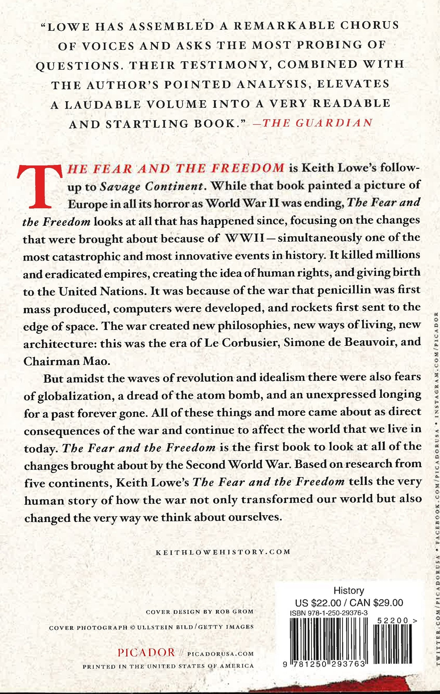 The Fear and the Freedom is Keith Lowe's follow-up to Savage Continent. While that book painted a picture of Europe in all its horror as World War II was ending, The Fear and the Freedom looks at all that has happened since, focusing on the changes that were brought about because of World War II--simultaneously one of the most catastrophic and most innovative events in history. It killed millions and eradicated empires, creating the idea of human rights, and giving birth to the UN. It was because of the war that penicillin was first mass-produced, computers were developed, and rockets first sent to the edge of space. The war created new philosophies, new ways of living, new architecture: this was the era of Le Corbusier, Simone de Beauvoir and Chairman Mao.