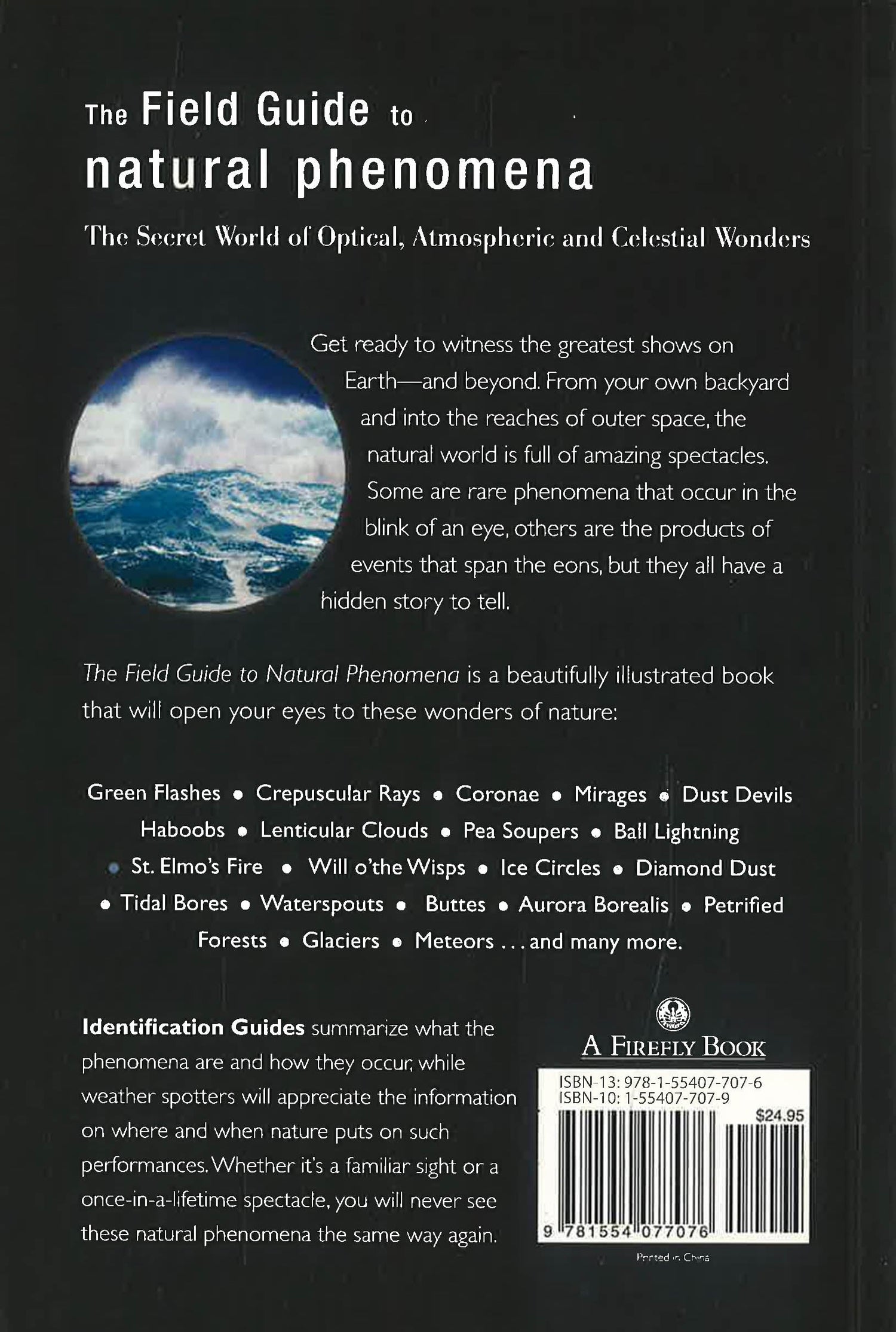 The field guide examines the origins and behaviors of natural phenomena and draws on science, history, folklore, travel and other disciplines. Some are familiar events, yet others are once-in-a-lifetime spectacles. They include: Optical phenomena, such as green flashes, crepuscular rays, coronas, mirages